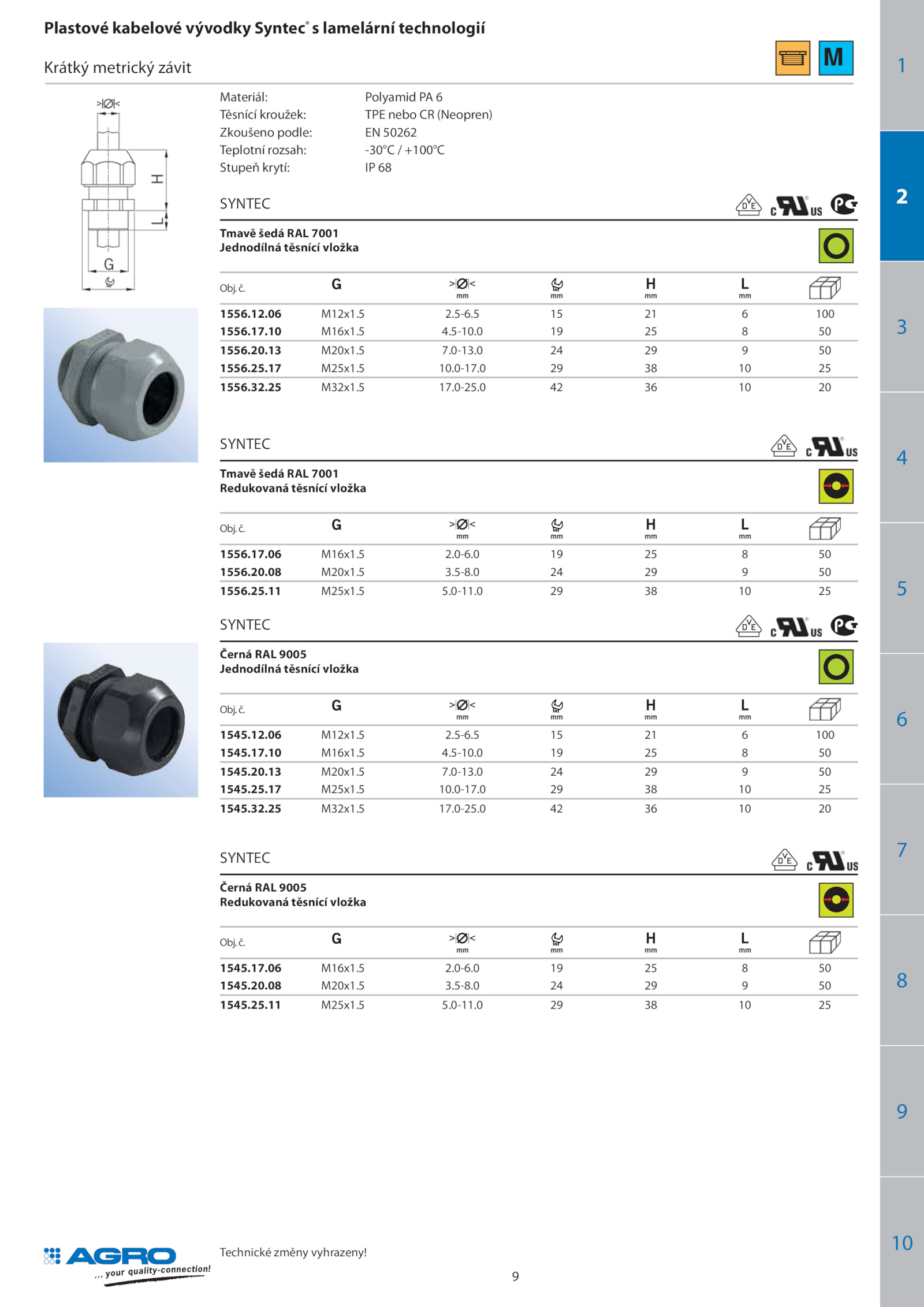 12.5-8.13 M20x1.06 M16x1.5 3.06 M16x1.0 50 1556.0 25 SYNTEC Tmavě šedá RAL 7001 Jednodílná těsnící vložka Obj. 1545.25.5-10.06 M12x1.17.5 2.32.0-17.5 2.17.0-17.0 20 SYNTEC Tmavě šedá RAL 7001 Redukovaná těsnící vložka Obj.25 M32x1.13 M20x1.0 50 1545.5 100 1556.20.0 20 SYNTEC Černá RAL 9005 Redukovaná těsnící vložka Obj. 1556.5 4.17 M25x1.0-6.5 17.0-11. 1545.5 7.č.5-6.č.17 M25x1.11 M25x1.0 25 1545.17.5 5.12.Technické změny vyhrazeny! 9 1 2 3 4 5 6 7 8 9 10 Plastové kabelové vývodky Syntec® s lamelární technologií Krátký metrický závit Materiál: Polyamid 6 Těsnící kroužek: TPE nebo (Neopren) Zkoušeno podle: 50262 Teplotní rozsah: -30°C +100°C Stupeň krytí: 68 SYNTEC Černá RAL 9005 Jednodílná těsnící vložka Obj.25.0 50 1556.20.06 M12x1.0 50 1545.10 M16x1.20.5-6.32.25 M32x1.č.5 10.0-25.0-6.5-10.č.0 50 1545.10 M16x1.17.5 10.08 M20x1.5 5.0 50 1556.5 17.25.0-13.5 3.0 50 1556. 1556.0 50 1545.0-11.0-13.0 25 M .5 2.25.5-8.0 25 1556.5 2.5 100 1545.5 7.20.08 M20x1.11 M25x1.5 4.0-25