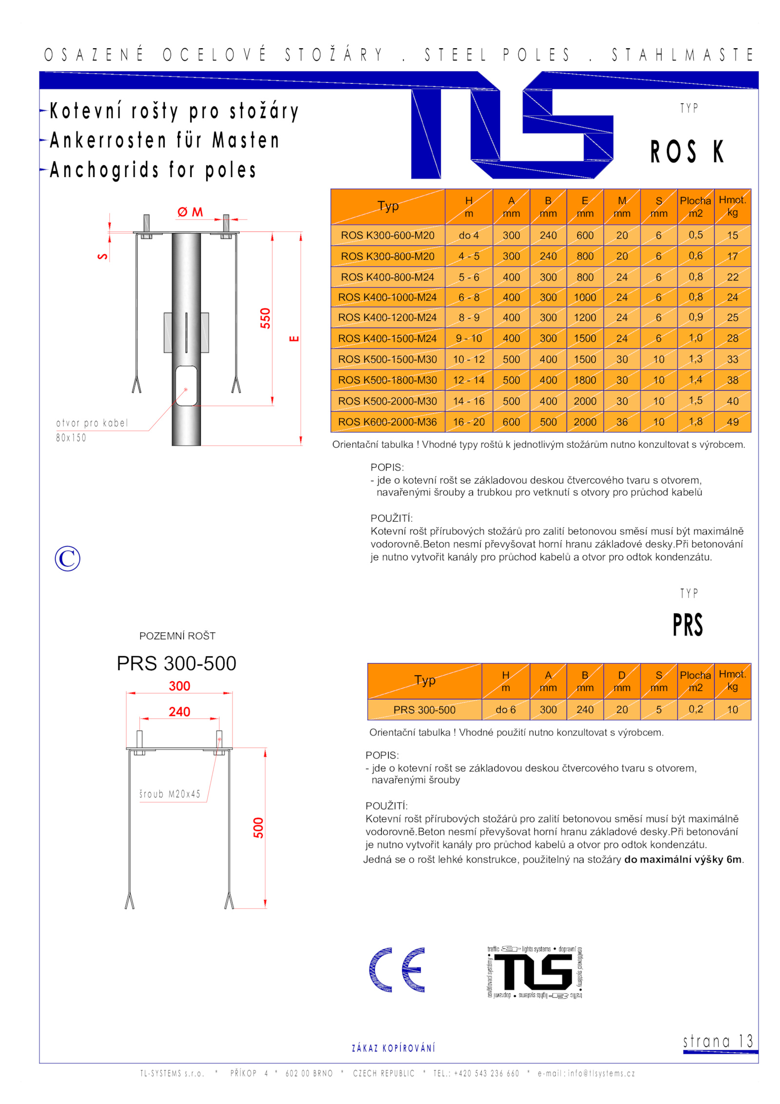 Orientační tabulka Vhodné typy roštů jednotlivým stožárům nutno konzultovat výrobcem.Beton nesmí převyšovat horní hranu základové desky.