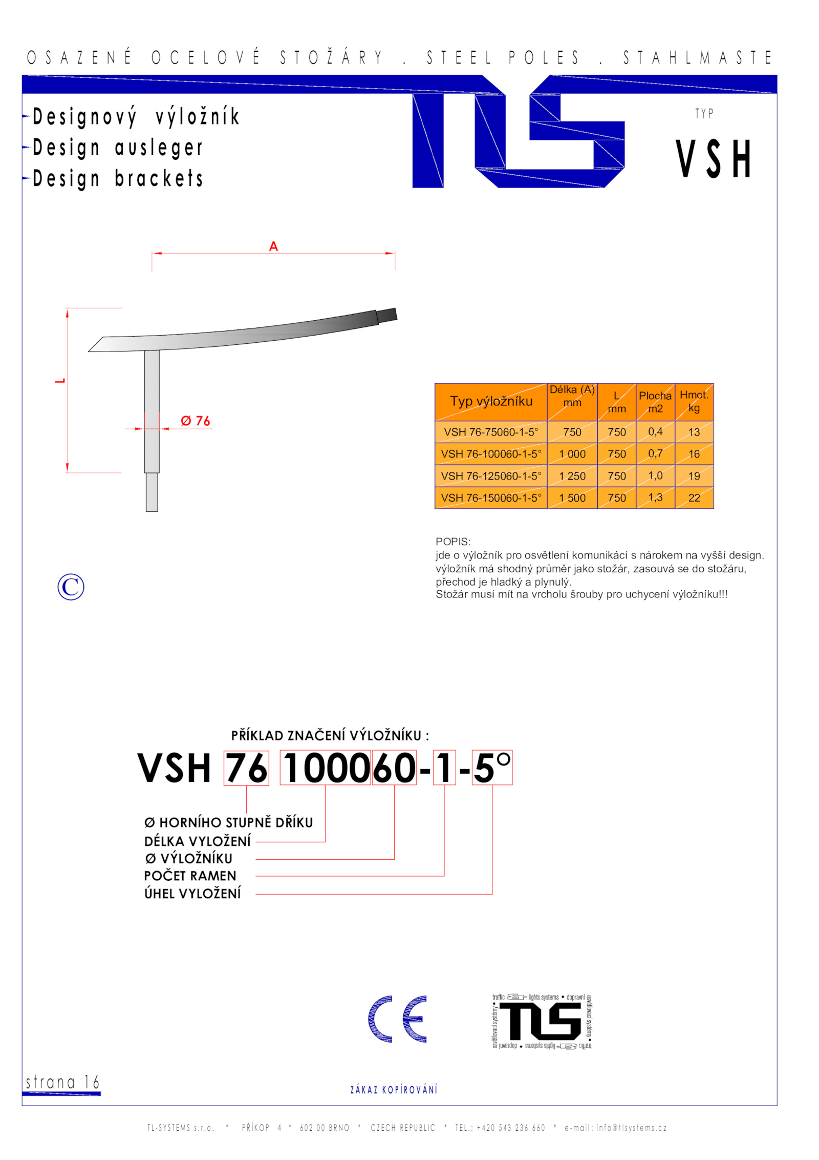 výložník shodný průměr jako stožár, zasouvá stožáru,