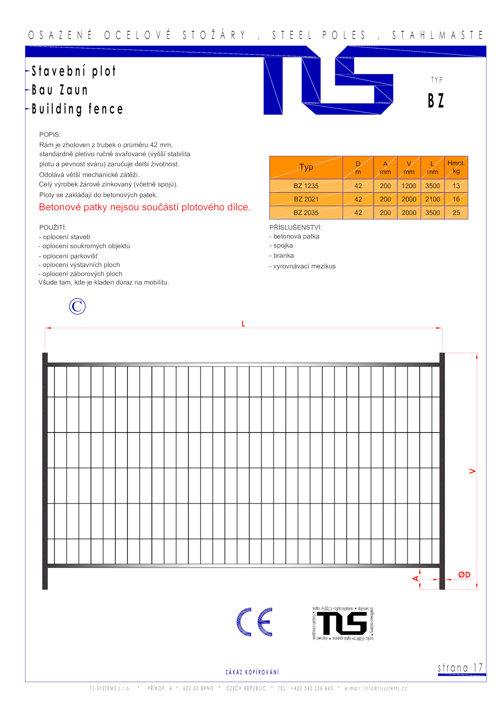 Odolává větší mechanické zátěži. Celý výrobek žárově zinkovaný (včetně spojů). - vyrovnávací mezikus Rám zhotoven trubek průměru mm, plotu pevnost sváru) zaručuje delší životnost. kg BZ 1235 200 1200 3500 13 BZ 2021 200 2000 2100 16 BZ 2035 200 2000 3500 25 S t B n B e POUŽITÍ: POPIS: s 7 Z Í V L A ØD standardně pletivo ručně svařované (vyšší stabilita Betonové patky nejsou součástí plotového dílce. - oplocení staveb - oplocení soukromých objektů - oplocení parkovišť - oplocení výstavních ploch - oplocení záborových ploch Všude tam, kde kladen důraz mobilitu. Ploty zakládají betonových patek.P B Z © Typ D m A mm V mm L mm Hmot. PŘÍSLUŠENSTVÍ: - betonová patka - spojka - branka