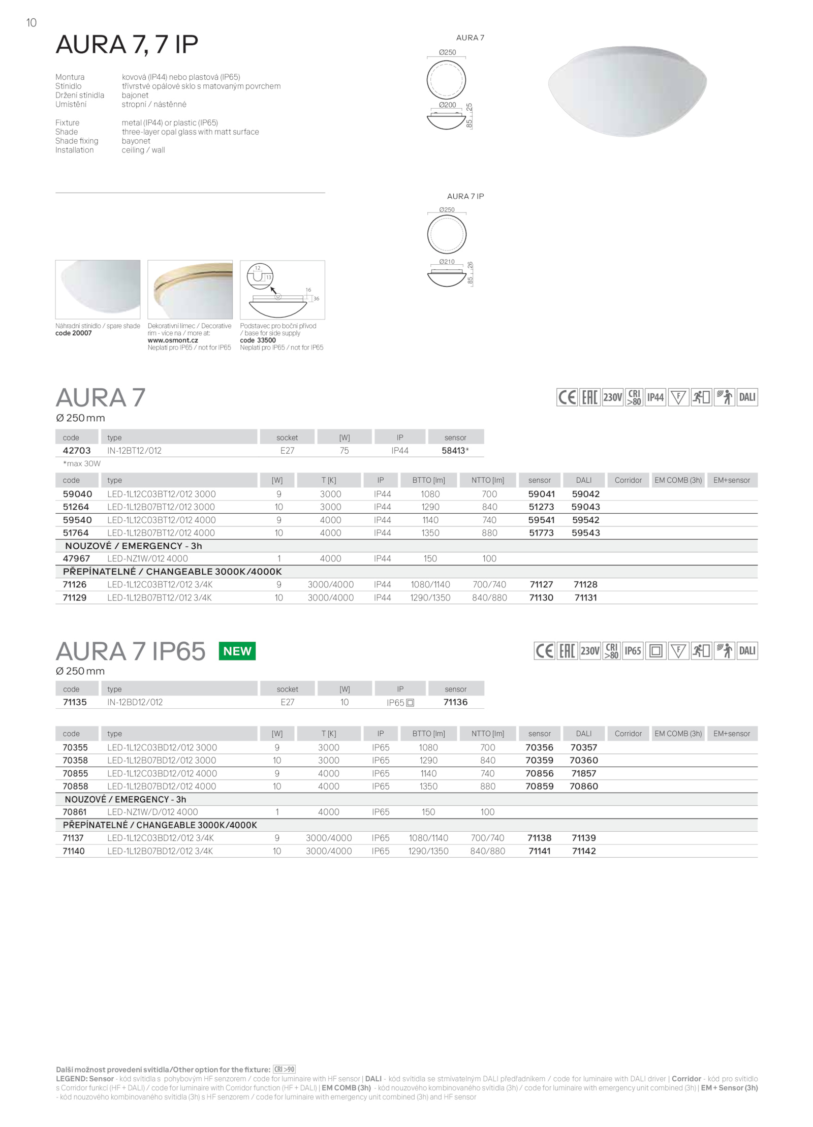 Další možnost provedení svítidla/Other option for the fixture: CRI>90 LEGEND: Sensor kód svítidla pohybovým senzorem code for luminaire with sensor DALI kód svítidla stmívatelným DALI předřadníkem code for luminaire with DALI driver Corridor kód pro svítidlo s Corridor funkcí (HF DALI) code for luminaire with Corridor function (HF DALI) COMB (3h) kód nouzového kombinovaného svítidla (3h) code for luminaire with emergency unit combined (3h) Sensor (3h) - kód nouzového kombinovaného svítidla (3h) senzorem code for luminaire with emergency unit combined (3h) and sensor Montura kovová (IP44) nebo plastová (IP65) Stínidlo třívrstvé opálové sklo matovaným povrchem Držení stínidla bajonet Umístění stropní nástěnné Fixture metal (IP44) plastic (IP65) Shade three-layer opal glass with matt surface Shade fixing bayonet Installation ceiling wall AURA IP AURA IP65 Ø 250mm AURA 7 Náhradní stínidlo spare shade code 20007 Dekorativní límec Decorative rim více more at: www.cz Neplatí pro IP65 not for IP65 code type socket [W] sensor 42703 IN-12BT12/012 E27 IP44 58413* *max 30W Podstavec pro boční přívod / base for side supply code 33500 Neplatí pro IP65 not for IP65 code type [W] [K] BTTO [lm] NTTO [lm] sensor DALI Corridor COMB (3h) EM+sensor 59040 LED-1L12C03BT12/012 3000 3000 IP44 1080 700 59041 59042 51264 LED-1L12B07BT12/012 3000 3000 IP44 1290 840 51273 59043 59540 LED-1L12C03BT12/012 4000 4000 IP44 1140 740 59541 59542 51764 LED-1L12B07BT12/012 4000 4000 IP44 1350 880 51773 59543 NOUZOVÉ EMERGENCY 3h 47967 LED-NZ1W/012 4000 4000 IP44 150 100 PŘEPÍNATELNÉ CHANGEABLE 3000K/4000K 71126 LED-1L12C03BT12/012 3/4K 3000/4000 IP44 1080/1140 700/740 71127 71128 71129 LED-1L12B07BT12/012 3/4K 3000/4000 IP44 1290/1350 840/880 71130 71131 code type [W] [K] BTTO [lm] NTTO [lm] sensor DALI Corridor COMB (3h) EM+sensor 70355 LED-1L12C03BD12/012 3000 3000 IP65 1080 700 70356 70357 70358 LED-1L12B07BD12/012 3000 3000 IP65 1290 840 70359 70360 70855 LED-1L12C03BD12/012 4000 4000 IP65 1140 740 70856 71857 70858 LED-1L12B07BD12/012 4000 4000 IP65 1350 880 70859 70860 NOUZOVÉ EMERGENCY 3h 70861 LED-NZ1W/D/012 4000 4000 IP65 150 100 PŘEPÍNATELNÉ CHANGEABLE 3000K/4000K 71137 LED-1L12C03BD12/012 3/4K 3000/4000 IP65 1080/1140 700/740 71138 71139 71140 LED-1L12B07BD12/012 3/4K 3000/4000 IP65 1290/1350 840/880 71141 71142 code type socket [W] sensor 71135 IN-12BD12/012 E27 IP65 71136 IP44 AURA 7 Ø 250mm AURA IP 36 16 13 12 NEW 25 85 Ø200 Ø250 Ø250 Ø210 26 85 IP65 10 .osmont