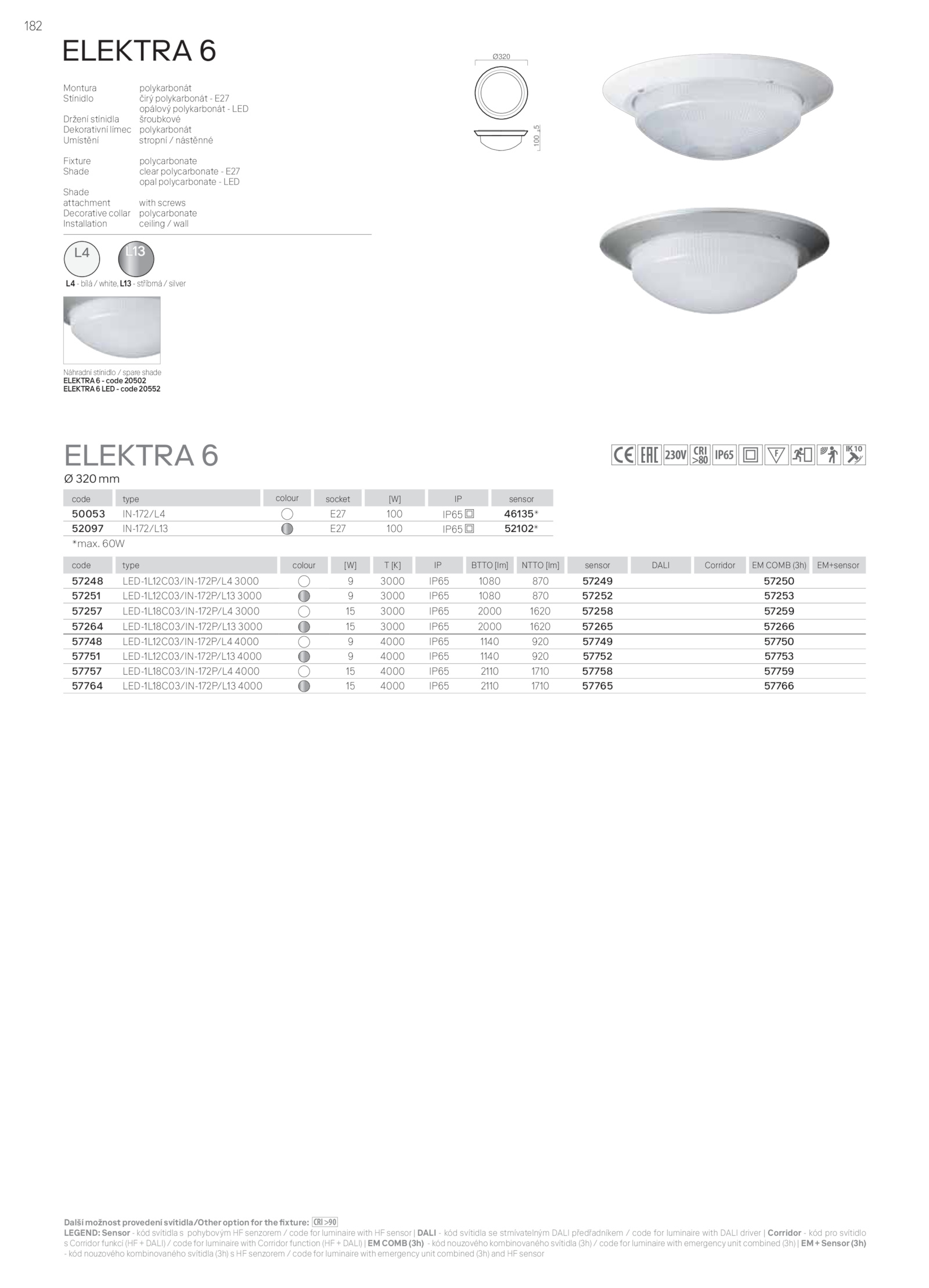 Další možnost provedení svítidla/Other option for the fixture: CRI>90 LEGEND: Sensor kód svítidla pohybovým senzorem code for luminaire with sensor DALI kód svítidla stmívatelným DALI předřadníkem code for luminaire with DALI driver Corridor kód pro svítidlo s Corridor funkcí (HF DALI) code for luminaire with Corridor function (HF DALI) COMB (3h) kód nouzového kombinovaného svítidla (3h) code for luminaire with emergency unit combined (3h) Sensor (3h) - kód nouzového kombinovaného svítidla (3h) senzorem code for luminaire with emergency unit combined (3h) and sensor Náhradní stínidlo spare shade ELEKTRA6-code20502 ELEKTRA6LED-code20552 Montura polykarbonát Stínidlo čirý polykarbonát E27 opálový polykarbonát LED Držení stínidla šroubkové Dekorativní límec polykarbonát Umístění stropní nástěnné Fixture polycarbonate Shade clear polycarbonate E27 opal polycarbonate LED Shade attachment with screws Decorative collar polycarbonate Installation ceiling wall ELEKTRA 6 code type colour [W] [K] BTTO [lm] NTTO [lm] sensor DALI Corridor COMB (3h) EM+sensor 57248 LED-1L12C03/IN-172P/L4 3000 3000 IP65 1080 870 57249 57250 57251 LED-1L12C03/IN-172P/L13 3000 3000 IP65 1080 870 57252 57253 57257 LED-1L18C03/IN-172P/L4 3000 3000 IP65 2000 1620 57258 57259 57264 LED-1L18C03/IN-172P/L13 3000 3000 IP65 2000 1620 57265 57266 57748 LED-1L12C03/IN-172P/L4 4000 4000 IP65 1140 920 57749 57750 57751 LED-1L12C03/IN-172P/L13 4000 4000 IP65 1140 920 57752 57753 57757 LED-1L18C03/IN-172P/L4 4000 4000 IP65 2110 1710 57758 57759 57764 LED-1L18C03/IN-172P/L13 4000 4000 IP65 2110 1710 57765 57766 ELEKTRA 6 Ø 320mm code type colour socket [W] sensor 50053 IN-172/L4 E27 100 IP65 46135* 52097 IN-172/L13 E27 100 IP65 52102* *max. 60W 100 5 Ø320 IP65 L13 L13 L4 L4-bílá/white,L13-stříbrná/silver 182