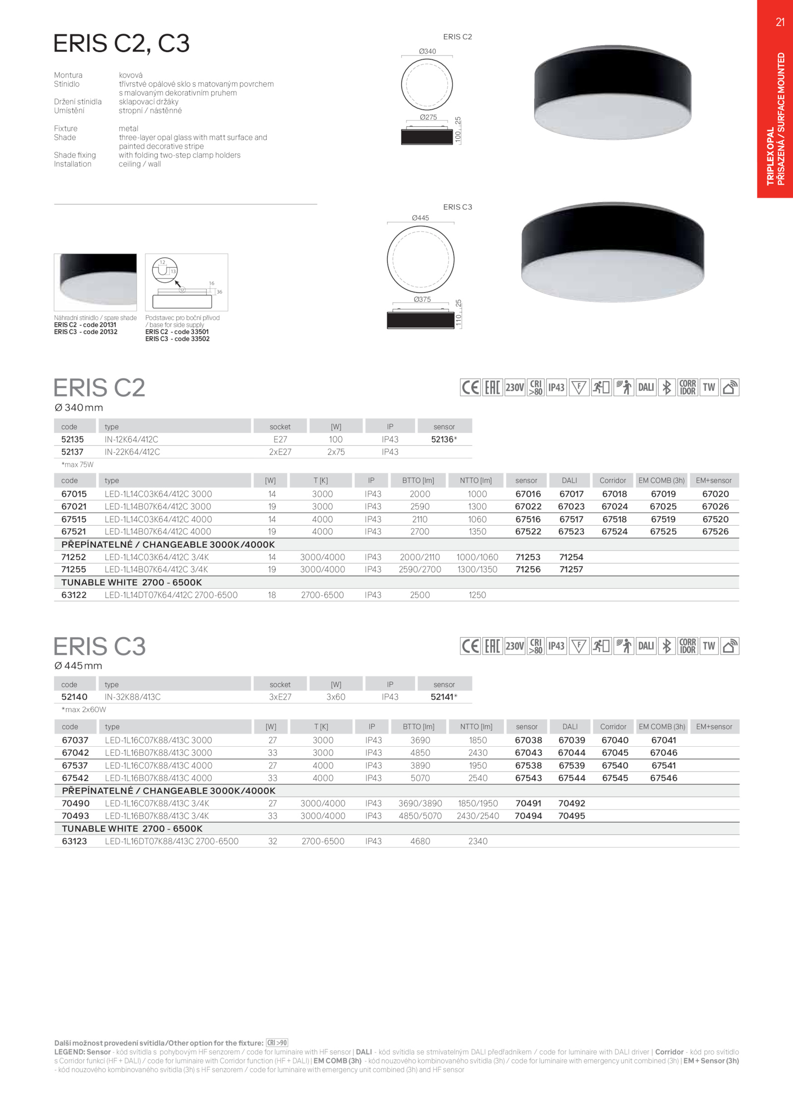 SKLA TRIPLEX OPÁL TRIPLEX OPAL GLASS Další možnost provedení svítidla/Other option for the fixture: CRI>90 LEGEND: Sensor kód svítidla pohybovým senzorem code for luminaire with sensor DALI kód svítidla stmívatelným DALI předřadníkem code for luminaire with DALI driver Corridor kód pro svítidlo s Corridor funkcí (HF DALI) code for luminaire with Corridor function (HF DALI) COMB (3h) kód nouzového kombinovaného svítidla (3h) code for luminaire with emergency unit combined (3h) Sensor (3h) - kód nouzového kombinovaného svítidla (3h) senzorem code for luminaire with emergency unit combined (3h) and sensor Montura kovová Stínidlo třívrstvé opálové sklo matovaným povrchem s malovaným dekorativním pruhem Držení stínidla sklapovací držáky Umístění stropní nástěnné Fixture metal Shade three-layer opal glass with matt surface and painted decorative stripe Shade fixing with folding two-step clamp holders Installation ceiling wall ERIS C2, C3 ERIS C3 Ø 445mm ERIS C2 Náhradní stínidlo spare shade ERIS code 20131 ERIS code 20132 code type socket [W] sensor 52140 IN-32K88/413C 3xE27 3x60 IP43 52141* *max 2x60W 36 16 13 12 Podstavec pro boční přívod / base for side supply ERIS code 33501 ERIS code 33502 Ø275 Ø340 25 100 Ø375 Ø445 25 110 code type [W] [K] BTTO [lm] NTTO [lm] sensor DALI Corridor COMB (3h) EM+sensor 67015 LED-1L14C03K64/412C 3000 3000 IP43 2000 1000 67016 67017 67018 67019 67020 67021 LED-1L14B07K64/412C 3000 3000 IP43 2590 1300 67022 67023 67024 67025 67026 67515 LED-1L14C03K64/412C 4000 4000 IP43 2110 1060 67516 67517 67518 67519 67520 67521 LED-1L14B07K64/412C 4000 4000 IP43 2700 1350 67522 67523 67524 67525 67526 PŘEPÍNATELNÉ CHANGEABLE 3000K/4000K 71252 LED-1L14C03K64/412C 3/4K 3000/4000 IP43 2000/2110 1000/1060 71253 71254 71255 LED-1L14B07K64/412C 3/4K 3000/4000 IP43 2590/2700 1300/1350 71256 71257 TUNABLE WHITE 2700 6500K 63122 LED-1L14DT07K64/412C 2700-6500 2700-6500 IP43 2500 1250 IP43 TW IP43 TW ERIS C2 Ø 340mm ERIS C3 code type [W] [K] BTTO [lm] NTTO [lm] sensor DALI Corridor COMB (3h) EM+sensor 67037 LED-1L16C07K88/413C 3000 3000 IP43 3690 1850 67038 67039 67040 67041 67042 LED-1L16B07K88/413C 3000 3000 IP43 4850 2430 67043 67044 67045 67046 67537 LED-1L16C07K88/413C 4000 4000 IP43 3890 1950 67538 67539 67540 67541 67542 LED-1L16B07K88/413C 4000 4000 IP43 5070 2540 67543 67544 67545 67546 PŘEPÍNATELNÉ CHANGEABLE 3000K/4000K 70490 LED-1L16C07K88/413C 3/4K 3000/4000 IP43 3690/3890 1850/1950 70491 70492 70493 LED-1L16B07K88/413C 3/4K 3000/4000 IP43 4850/5070 2430/2540 70494 70495 TUNABLE WHITE 2700 6500K 63123 LED-1L16DT07K88/413C 2700-6500 2700-6500 IP43 4680 2340 code type socket [W] sensor 52135 IN-12K64/412C E27 100 IP43 52136* 52137 IN-22K64/412C 2xE27 2x75 IP43 *max 75W 21 TRIPLEX OPAL PŘISAZENÁ / SURFACE MOUNTED 21