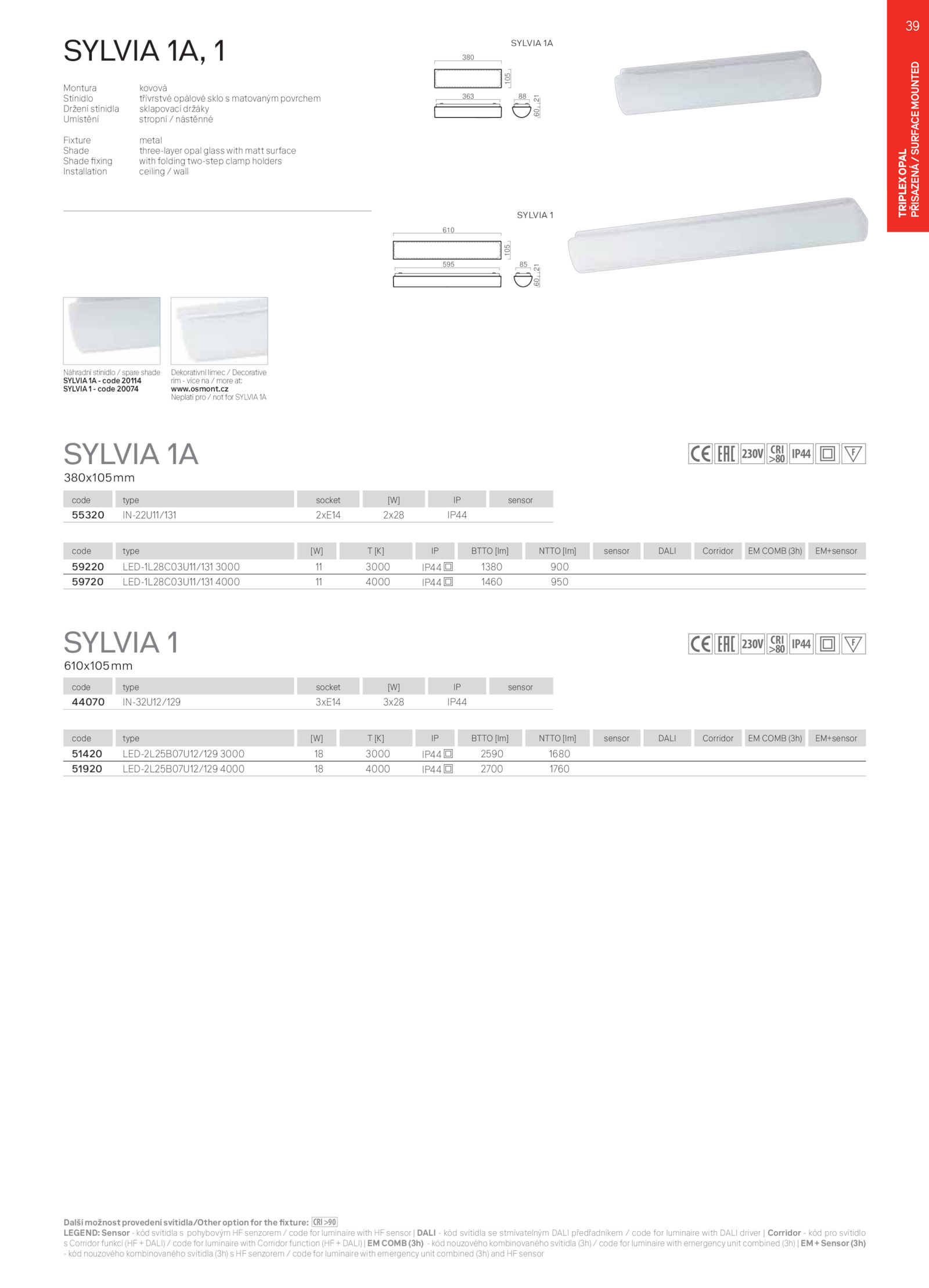 cz Neplatí pro not for SYLVIA 1A IP44 IP44 39 TRIPLEX OPAL PŘISAZENÁ / SURFACE MOUNTED 39 .SKLA TRIPLEX OPÁL TRIPLEX OPAL GLASS Další možnost provedení svítidla/Other option for the fixture: CRI>90 LEGEND: Sensor kód svítidla pohybovým senzorem code for luminaire with sensor DALI kód svítidla stmívatelným DALI předřadníkem code for luminaire with DALI driver Corridor kód pro svítidlo s Corridor funkcí (HF DALI) code for luminaire with Corridor function (HF DALI) COMB (3h) kód nouzového kombinovaného svítidla (3h) code for luminaire with emergency unit combined (3h) Sensor (3h) - kód nouzového kombinovaného svítidla (3h) senzorem code for luminaire with emergency unit combined (3h) and sensor Montura kovová Stínidlo třívrstvé opálové sklo matovaným povrchem Držení stínidla sklapovací držáky Umístění stropní nástěnné Fixture metal Shade three-layer opal glass with matt surface Shade fixing with folding two-step clamp holders Installation ceiling wall SYLVIA 1A, SYLVIA 1A SYLVIA 1 Náhradní stínidlo spare shade SYLVIA code 20114 SYLVIA code 20074 code type socket [W] sensor 55320 IN-22U11/131 2xE14 2x28 IP44 code type socket [W] sensor 44070 IN-32U12/129 3xE14 3x28 IP44 21 60 380 105 363 88 60 21 610 105 595 85 code type [W] [K] BTTO [lm] NTTO [lm] sensor DALI Corridor COMB (3h) EM+sensor 59220 LED-1L28C03U11/131 3000 3000 IP44 1380 900 59720 LED-1L28C03U11/131 4000 4000 IP44 1460 950 code type [W] [K] BTTO [lm] NTTO [lm] sensor DALI Corridor COMB (3h) EM+sensor 51420 LED-2L25B07U12/129 3000 3000 IP44 2590 1680 51920 LED-2L25B07U12/129 4000 4000 IP44 2700 1760 SYLVIA 1A SYLVIA 1 380x105mm 610x105mm Dekorativní límec Decorative rim více more at: www.osmont