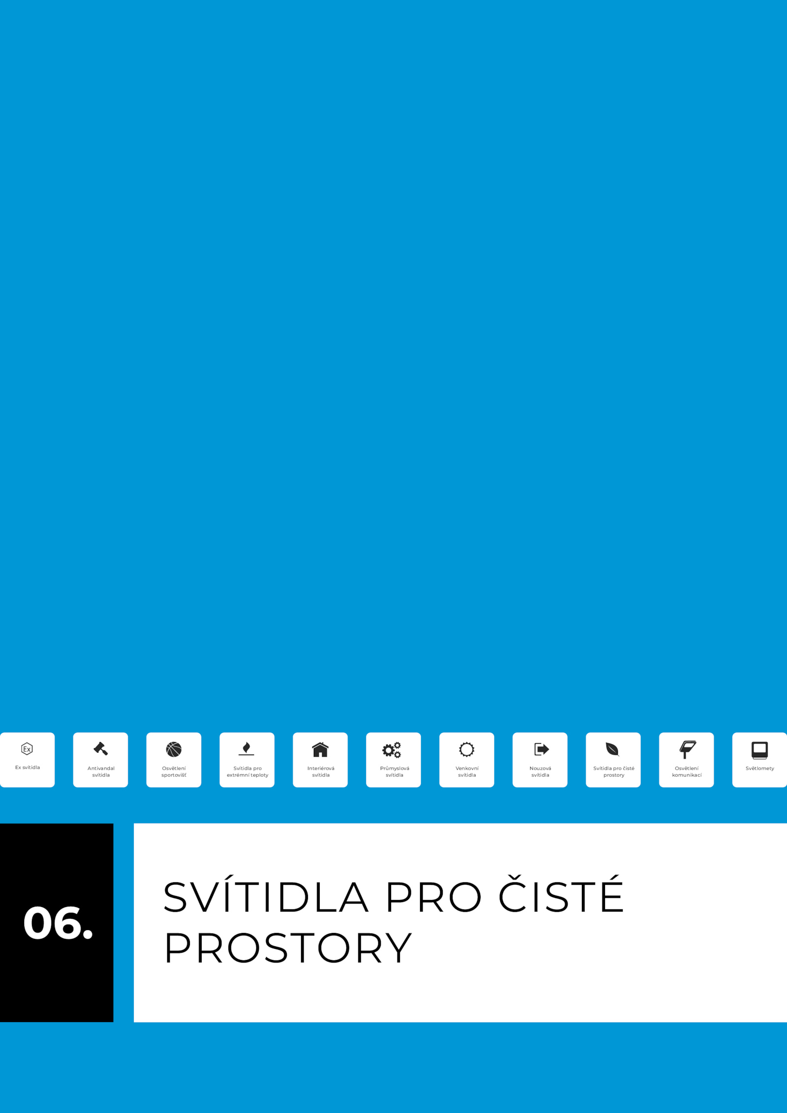 SVÍTIDLA PRO ČISTÉ PROSTORY Interiérová svítidla Průmyslová svítidla Venkovní svítidla Nouzová svítidla Ex svítidla Ex Antivandal svítidla Svítidla pro extrémní teploty Svítidla pro čisté prostory Osvětlení sportovišť Světlomety Osvětlení komunikací .06