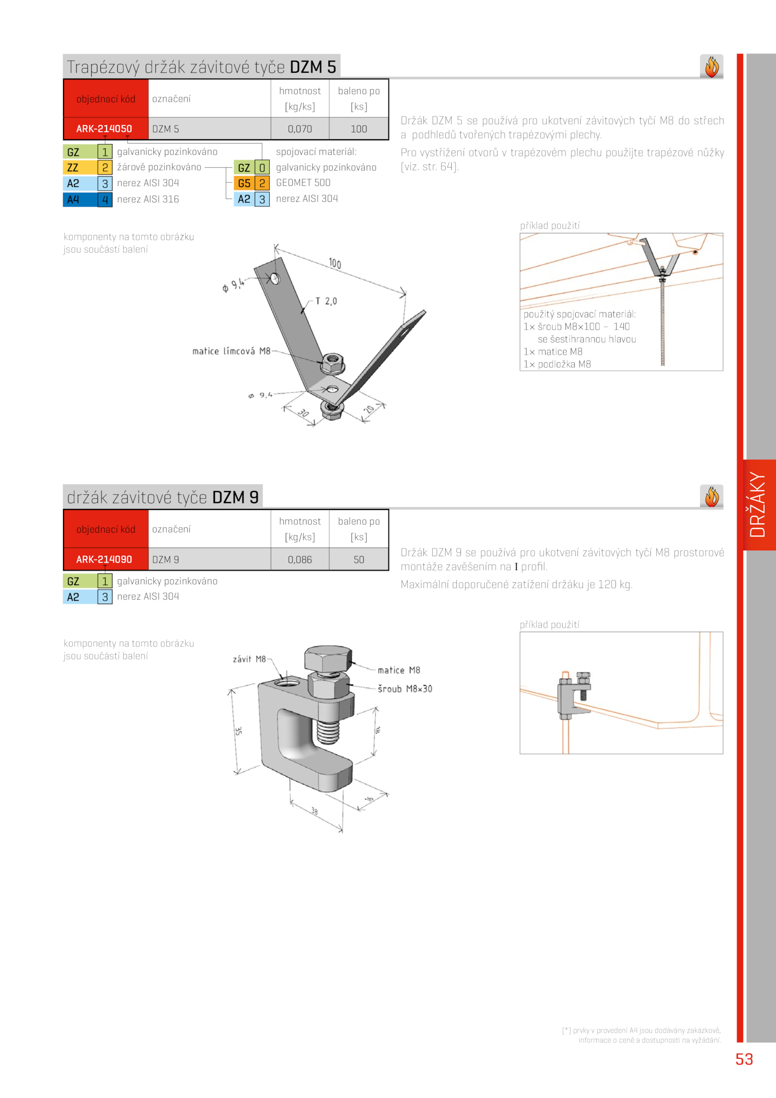 53 držák závitové tyče DZM 9 použitý spojovací materiál: 1× šroub M8×100 140 se šestihrannou hlavou 1× matice M8 1× podložka M8 příklad použití komponenty tomto obrázku jsou součástí balení komponenty tomto obrázku jsou součástí balení příklad použití objednací kód označení hmotnost [kg/ks] baleno po [ks] ARK-214090 DZM 0,086 50 3 A2 1 GZ galvanicky pozinkováno nerez AISI 304 Držák DZM používá pro ukotvení závitových tyčí střech a podhledů tvořených trapézovými plechy. Maximální doporučené zatížení držáku 120 kg. Pro vystřižení otvorů trapézovém plechu použijte trapézové nůž ky (viz. str. 64). Držák DZM používá pro ukotvení závitových tyčí prostorové montáže zavěšením profil. objednací kód označení hmotnost [kg/ks] baleno po [ks] ARK-214050 DZM 0,070 100 2 ZZ 1 GZ galvanicky pozinkováno žárově pozinkováno 3 nerez AISI 304 galvanicky pozinkováno spojovací materiál: GEOMET 500 nerez AISI 304 A2 4 nerez AISI 316 A4 2 G5 0 GZ 3 A2 držáky . Trapézový držák závitové tyče DZM 5 (*) prvky provedení jsou dodávány zakázkově, informace ceně dostupnosti vyžádání