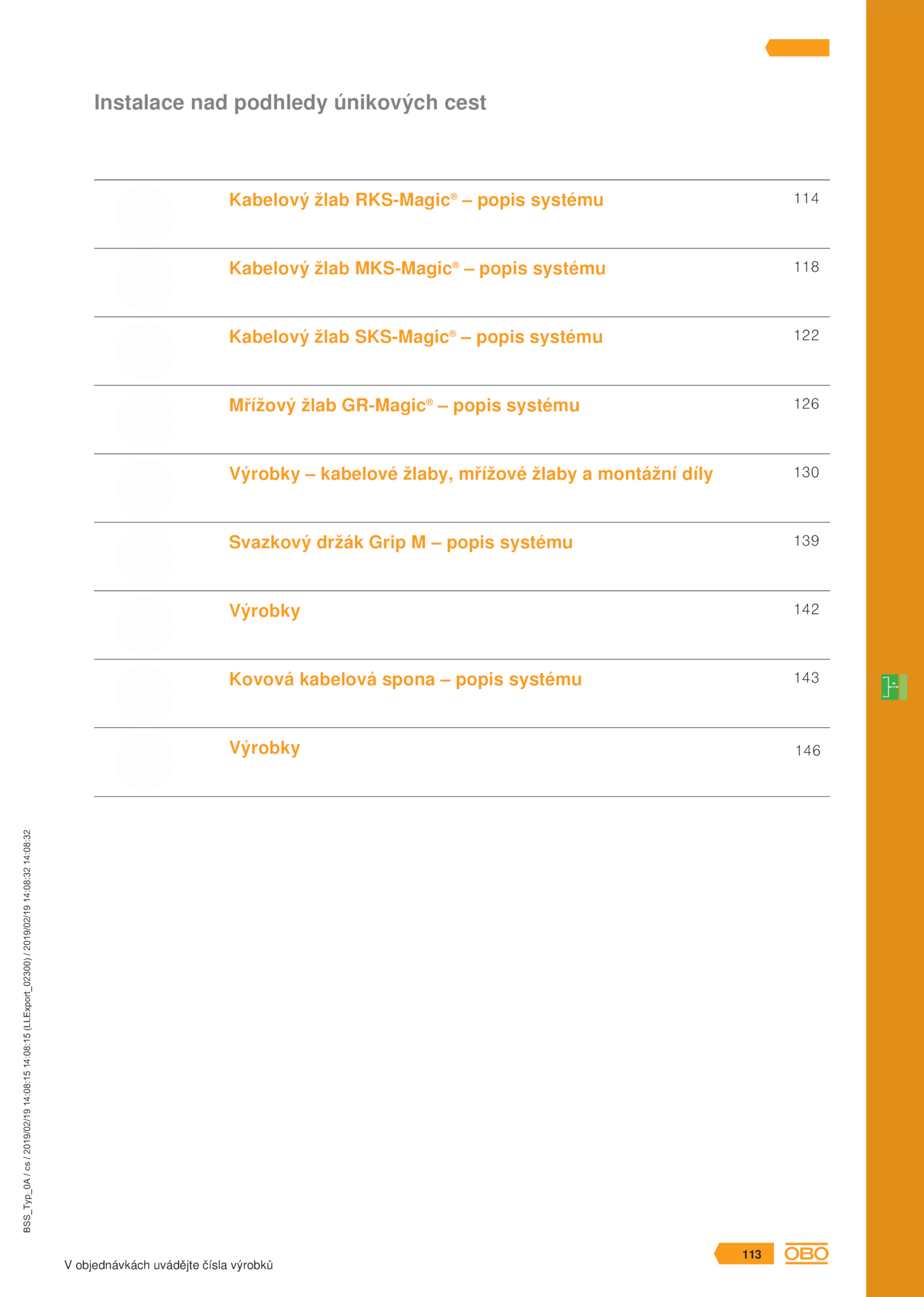BSS_Typ_0A / cs / 2019/02/19 14:08:15 14:08:15 (LLExport_02300) / 2019/02/19 14:08:32 14:08:32 V objednávkách uvádějte čísla výrobků 113 Instalace nad podhledy únikových cest Kabelový žlab RKS-Magic® – popis systému 114 Kabelový žlab MKS-Magic® – popis systému 118 Kabelový žlab SKS-Magic® – popis systému 122 Mřížový žlab GR-Magic® – popis systému 126 Výrobky kabelové žlaby, mřížové žlaby montážní díly 130 Svazkový držák Grip popis systému 139 Výrobky 142 Kovová kabelová spona popis systému 143 Výrobky BSS_Typ_0A / cs / 2019/02/19 14:08:15 14:08:15 (LLExport_02300) / 2019/02/19 14:08:32 14:08:32 V objednávkách uvádějte čísla výrobků 113 146