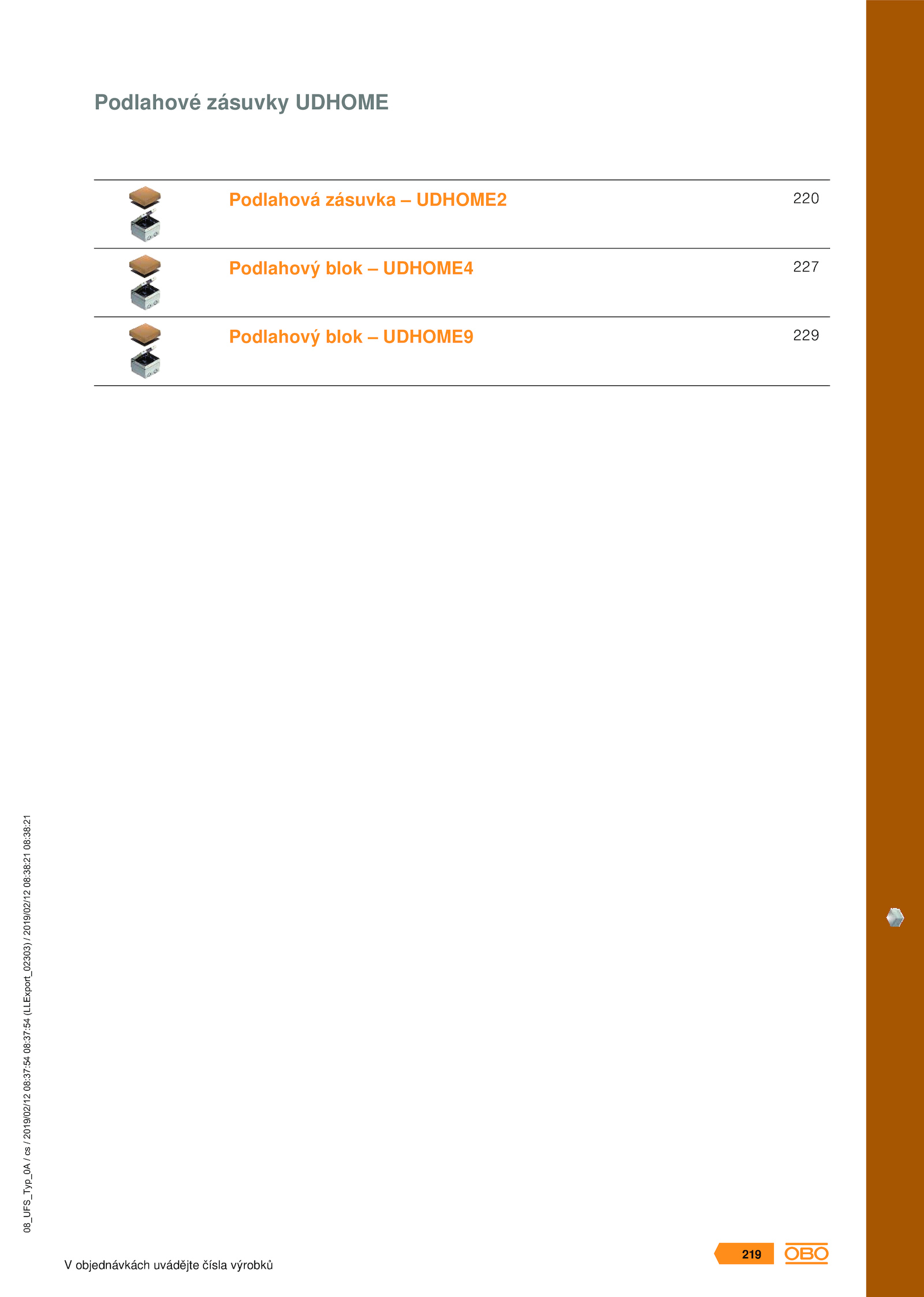 Podlahové zásuvky UDHOME Podlahová zásuvka UDHOME2 220 Podlahový blok UDHOME4 227 Podlahový blok UDHOME9 229 08_UFS_Typ_0A / cs / 2019/02/12 08:37:54 08:37:54 (LLExport_02303) / 2019/02/12 08:38:21 08:38:21 V objednávkách uvádějte čísla výrobků 219