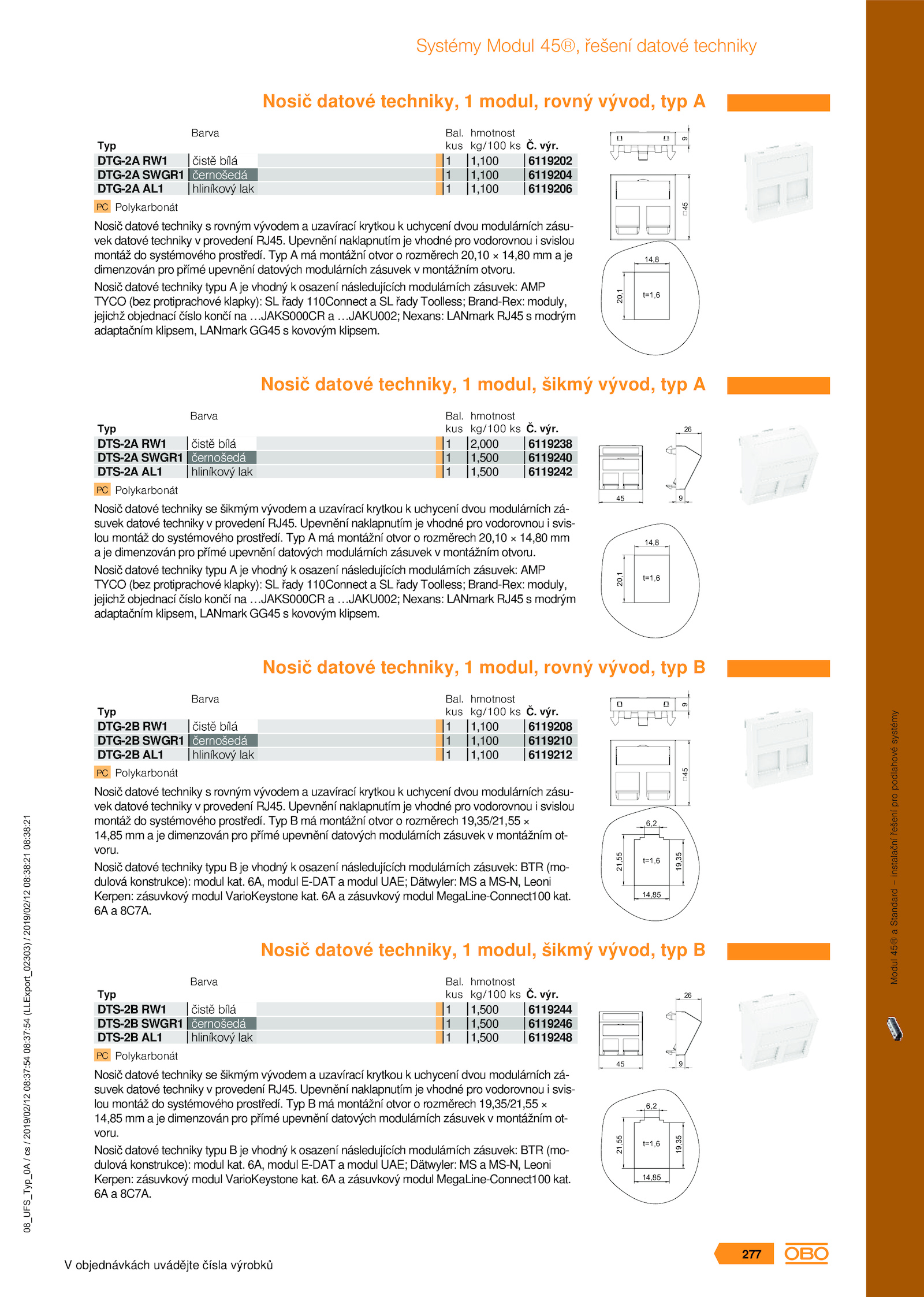 Nosič datové techniky typu vhodný osazení následujících modulárních zásuvek: BTR (mo-