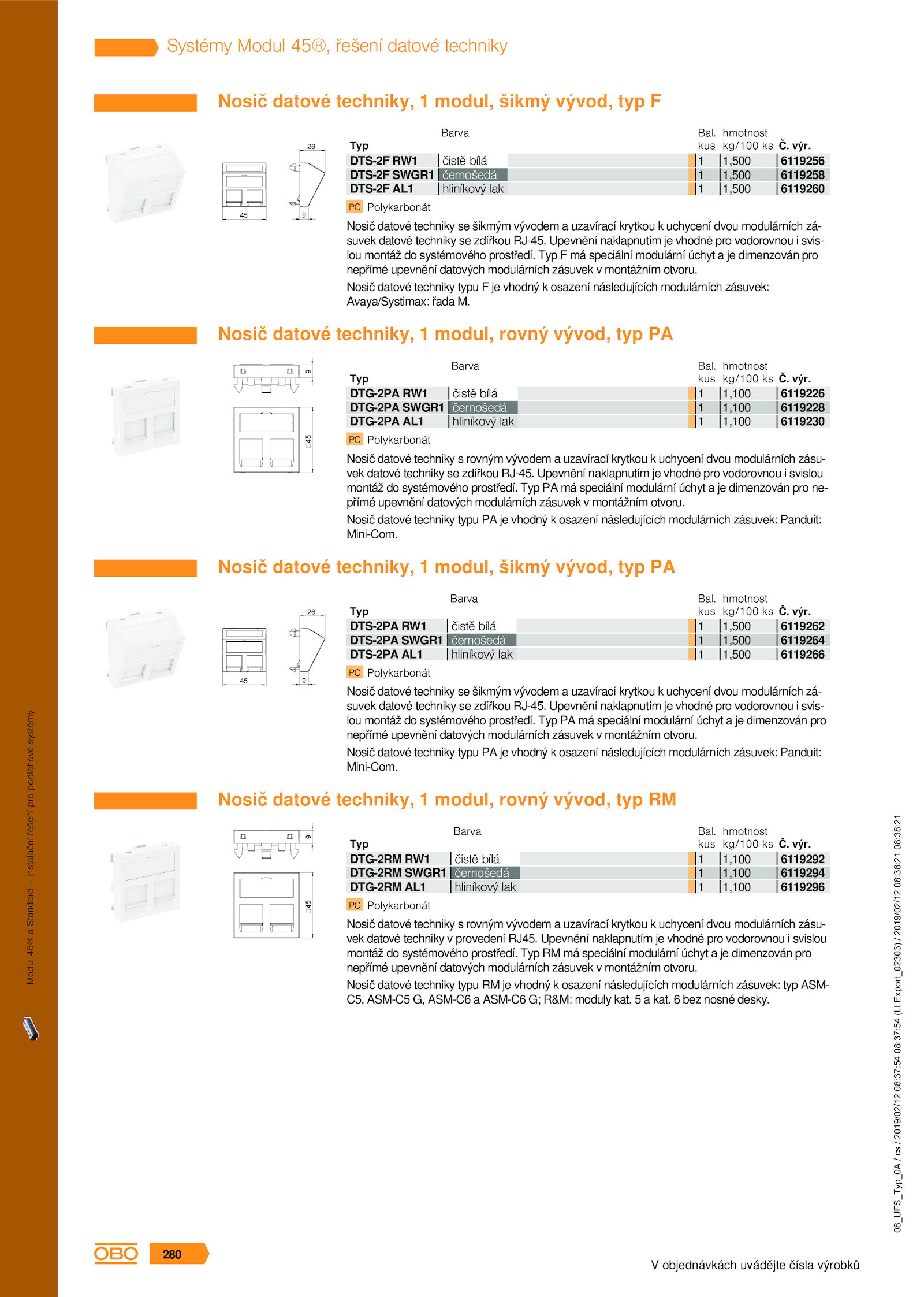Nosič datové techniky typu vhodný osazení následujících modulárních zásuvek: typ ASM-