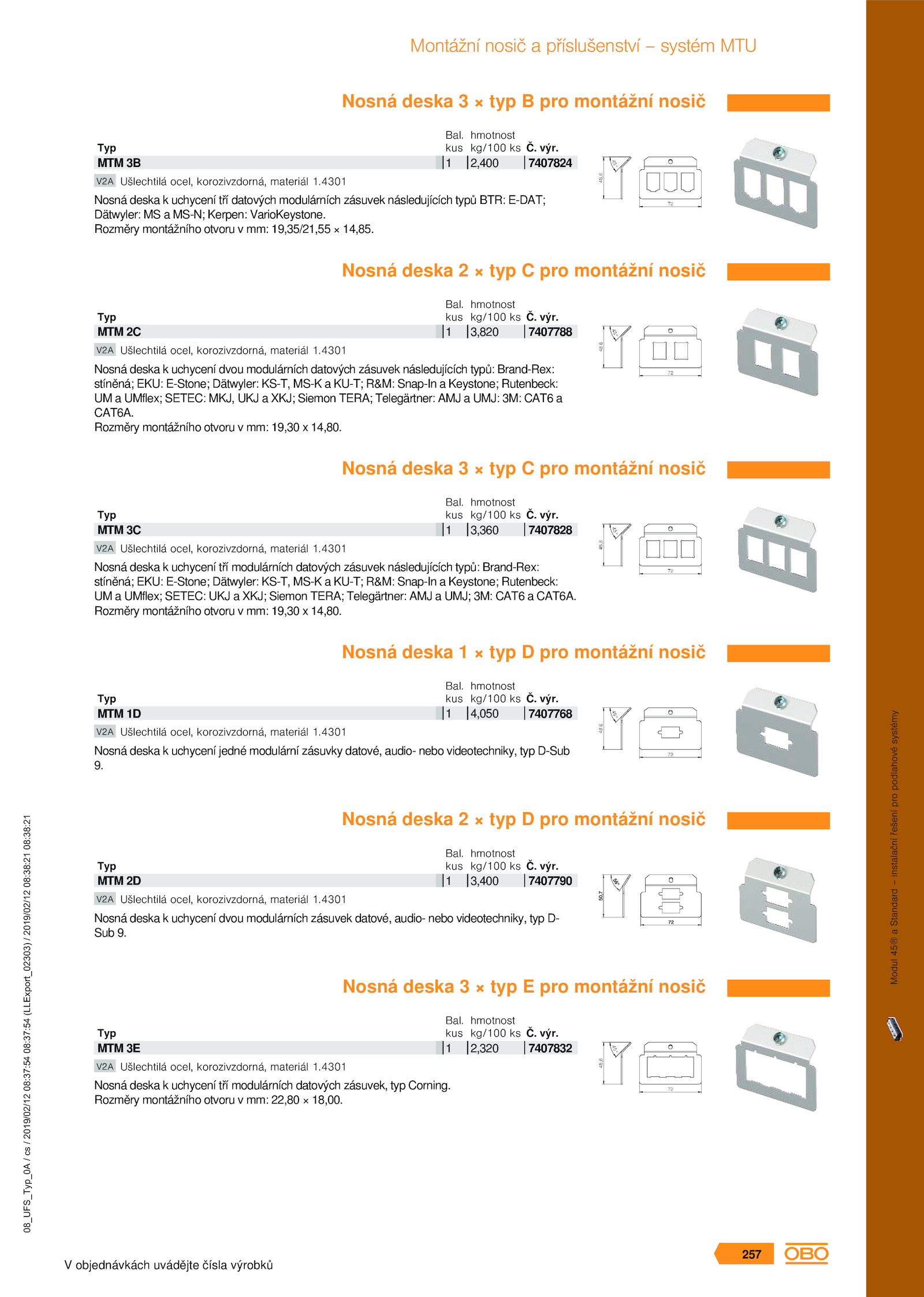 Nosná deska uchycení tří datových modulárních zásuvek následujících typů BTR: E-DAT;