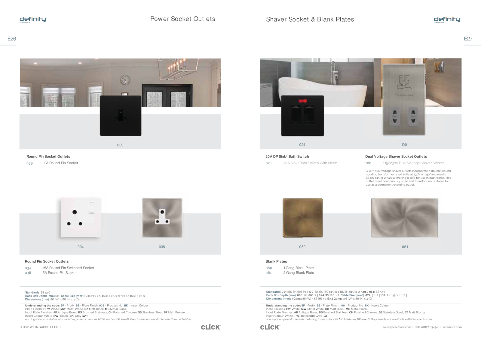 NœƊĎƂƖ΄ŜʼnŜƞƂ͙΄ÎĮijƖĎ΄ͬPWͭ΄ʼnåāņ΄ͬBKͭ΄BƂĎƼ΄ͬGY) ŎŗŎͩĮŎĢŗƍͩŗŎńƳͩàƬàĮńàûńĉͩƭĮƍĩͩŌàƍüĩĮŎĢͩĮŎƄĉżƍͩüŗńŗƕżͩ͒ĮĉͩiͩǏŎĮƄĩͩĩàƄͩ_ͩĮŎƄĉżƍ͓ͩͅBżĉƳͩĮŎƄĉżƍƄͩŎŗƍͩàƬàĮńàûńĉͩƭĮƍĩͩĩżŗŌĉͩǏŎĮƄĩĉƄͅ . NœħŜƖ΄ʼnåƖĎ΄AijœijƊĮĎƊ͙΄AB΄œƖijƁƞĎ΄ƂåƊƊ͚΄BS΄ƂƞƊĮĎĈ΄¢ƖåijœʼnĎƊƊ͚΄CH΄ŜʼnijƊĮĎĈ΄ĮƂŜőĎ͚΄SS΄¢ƖåijœʼnĎƊƊ΄¢ƖĎĎʼn͚΄BZ Matt Bronze. NœƊĎƂƖ΄ŜʼnŜƞƂ͙΄ÎĮijƖĎ΄ͬPWͭ΄ʼnåāņ΄ͬBKͭ΄BƂĎƼ΄ͬGY) ŎŗŎͩĮŎĢŗƍͩŗŎńƳͩàƬàĮńàûńĉͩƭĮƍĩͩŌàƍüĩĮŎĢͩĮŎƄĉżƍͩüŗńŗƕżͩ͒ĮĉͩiͩǏŎĮƄĩͩĩàƄͩ_ͩĮŎƄĉżƍ͓ͩͅBżĉƳͩĮŎƄĉżƍƄͩŎŗƍͩàƬàĮńàûńĉͩƭĮƍĩͩĩżŗŌĉͩǏŎĮƄĩĉƄ Round Pin Socket Outlets ̅̈̎ Round Pin Socket Dual Voltage Shaver Socket Outlets ̆̅̅ ̆̆̊ͥ̇̈̅Í΄$ƞåʼn΄ÍŜʼnƖåħĎ΄¢ĮåƵĎƂ΄¢ŜāņĎƖ Understanding the code: SF΄Ͳ΄ƂĎǙƻ΄΄SS Plate Finish 100 Product Insert Colour ʼnåƖĎ΄AijœijƊĮĎƊ͙΄PW΄ÎĮijƖĎ͚΄MW iĎƖåʼn΄ÎĮijƖĎ͚΄BK΄iåƖƖ΄ʼnåāņ͚΄MB Metal Black. NœħŜƖ΄ʼnåƖĎ΄AijœijƊĮĎƊ͙΄AB΄œƖijƁƞĎ΄ƂåƊƊ͚΄BS΄ƂƞƊĮĎĈ΄¢ƖåijœʼnĎƊƊ͚΄CH΄ŜʼnijƊĮĎĈ΄ĮƂŜőĎ͚΄SS΄¢ƖåijœʼnĎƊƊ΄¢ƖĎĎʼn͚΄BZ Matt Bronze.ƊåʼnĎƊοƊāŜʼnőŜƂĎ͟āŜő΄΄χ΄΄åʼnʼn͙΄̅̆̍̇̌΄̋̈̉̊̉΄΄΄χ΄΄΄ƊāŜʼnőŜƂĎ͟āŜő CLICK® WIRING ACCESSORIES E27 E26 Shaver Socket Blank Plates Power Socket Outlets 20A Sink/Bath Switch ̅̇̉ ̇̅΄¢ijœņͥåƖĮ΄¢ƶijƖāĮ΄ÎijƖĮ΄kĎŜœ Standards: 024:΄¢΄*k΄̋̅̋̋̎Ͳ̆100:΄¢΄*k΄N*΄̋̆̊̊̍Ͳ̆΄¢΄*k΄̋̆̊̊̍Ͳ̇Ͳ̊΄060 061:΄¢΄̊̌̈̈ Back Box Depth (mm): 060:΄̆̋΄ 061: ̇̊΄024: 100:΄̉̌΄΄Cable Size (mm²): 024:΄̈΄ƻ΄̇̊͟100:΄̇΄ƻ΄̆̊͟΄ŜƂ΄̆΄ƻ΄̇̊͟ Dimensions (mm): Gang:΄̍̋΄ͬÎͭ΄ƻ΄̍̋΄ͬIͭ΄ƻ΄̉΄ͬ$ͭ΄2 Gang:΄̆̉̋΄ͬÎͭ΄ƻ΄̍̋΄ͬIͭ΄ƻ΄̉΄ͬ$ͭ 100 060 061 024 Click® ΄Ĉƞåʼn΄ƵŜʼnƖåħĎ΄ƊĮåƵĎƂ΄ŜƞƖʼnĎƖƊ΄ijœāŜƂſŜƂåƖĎ΄å΄ĈŜƞĀʼnĎ΄ƶŜƞœĈ΄ ijƊŜʼnåƖijœħ΄ƖƂåœƊĦŜƂőĎƂ΄ƂåƖĎĈ΄̇̅Íå΄åƖ΄̇̈̅Í΄ŜƂ΄̆̆̊Í΄åœĈ΄őĎĎƖƊ΄ ¢΄*k΄̋̆̊̊̍Ͳ̇Ͳ͙̊̇̅̆̅΄őåņijœħ΄ijƖ΄ƊåĦĎ΄ĦŜƂ΄ƞƊĎ΄ijœ΄ĀåƖĮƂŜŜőƊ͟΄¯ĮijƊ΄ ŜƞƖʼnĎƖ΄ijƊ΄œŜƖ΄āŜœƖijœƞŜƞƊʼnƼ΄ƂåƖĎĈ΄åœĈ΄ƖĮĎƂĎĦŜƂĎ΄œŜƖ΄ƊƞijƖåĀʼnĎ΄ĦŜƂ΄ ƞƊĎ΄åƊ΄å΄ſĎƂőåœĎœƖ΄āĮåƂħijœħ΄ŜƞƖʼnĎƖ͟ Round Pin Socket Outlets ̅̈̉ 15A Round Pin Switched Socket ̅̈̍ Round Pin Socket Standards:΄¢΄̊̉̋ Back Box Depth (mm): Cable Size (mm²): 034:΄̈΄ƻ΄̇̊͟΄΄038:΄̉΄ƻ΄̆̊͟΄ŜƂ΄̈΄ƻ΄̇̊͟΄039: ̈΄ƻ΄̆̊͟ Dimensions (mm):΄̍̋΄ͬÎͭ΄ƻ΄̍̋΄ͬIͭ΄ƻ΄̉΄ͬ$ͭ 039 038 034 Blank Plates ̅̋̅ Gang Blank Plate ̅̋̆ Gang Blank Plate Understanding the code: SF΄Ͳ΄ƂĎǙƻ΄΄SS Plate Finish 038 Product Insert Colour ʼnåƖĎ΄AijœijƊĮĎƊ͙΄PW΄ÎĮijƖĎ͚΄MW iĎƖåʼn΄ÎĮijƖĎ͚΄BK΄iåƖƖ΄ʼnåāņ͚΄MB Metal Black