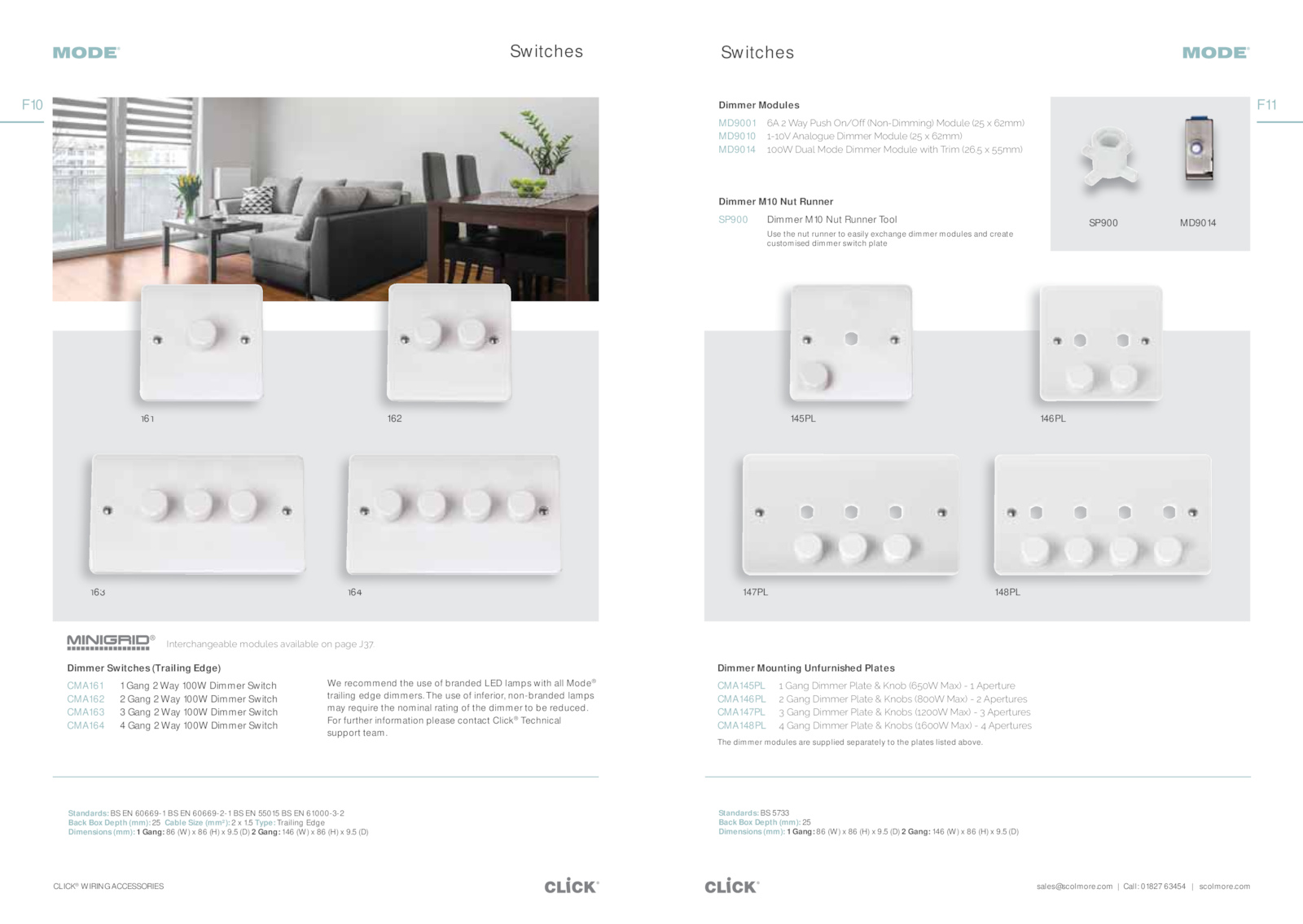 The use inferior, non-branded lamps may require the nominal rating the dimmer reduced.5 (D) NœƖĎƂāĮåœħĎåĀʼnĎ΄őŜĈƞʼnĎƊ΄åƵåijʼnåĀʼnĎ΄Ŝœ΄ſåħĎ΄]̈̌͟ Switches Dimmer Switches (Trailing Edge) CMA161 Gang Way 100W Dimmer Switch CMA162 Gang Way 100W Dimmer Switch CMA163 Gang Way 100W Dimmer Switch CMA164 Gang Way 100W Dimmer Switch We recommend the use branded LED lamps with all Mode® trailing edge dimmers. For further information please contact Click® Technical support team.sales@scolmore.5 (D) Gang: 146 (W) (H) 9.5 (D) Gang: 146 (W) (H) 9.5 Type: Trailing Edge Dimensions (mm): Gang: (W) (H) 9.5 (D) 145PL 147PL 148PL 146PL Dimmer Modules MD9001 ̋΄̇΄ÎåƼ΄ƞƊĮ΄tœͥtĦĦ΄ͬkŜœͲ$ijőőijœħͭ΄iŜĈƞʼnĎ΄ͬ̇̊΄ƻ΄̋̇őőͭ MD9010 ̆Ͳ̆̅Í΄œåʼnŜħƞĎ΄$ijőőĎƂ΄iŜĈƞʼnĎ΄ͬ̇̊΄ƻ΄̋̇őőͭ MD9014 ̆̅̅Î΄$ƞåʼn΄iŜĈĎ΄$ijőőĎƂ΄iŜĈƞʼnĎ΄ƶijƖĮ΄¯Ƃijő΄ͬ̇̋̊͟΄ƻ΄̊̊őőͭ SP900 MD9014 Dimmer M10 Nut Runner SP900 Dimmer M10 Nut Runner Tool Use the nut runner easily exchange dimmer modules and create customised dimmer switch plate 162 6 6 6 .com Call: 01827 63454 scolmore.com CLICK® WIRING ACCESSORIES F11 F10 Standards: 60669-1 60669-2-1 55015 61000-3-2 Back Box Depth (mm): Cable Size (mm²): 1. 161 163 164 162 Switches Dimmer Mounting Unfurnished Plates CMA145PL ̆΄Båœħ΄$ijőőĎƂ΄ʼnåƖĎ΄π΄_œŜĀ΄ͬ̋̊̅Î΄iåƻͭ΄Ͳ΄̆΄ſĎƂƖƞƂĎ CMA146PL ̇΄Båœħ΄$ijőőĎƂ΄ʼnåƖĎ΄π΄_œŜĀƊ΄ͬ̍̅̅Î΄iåƻͭ΄Ͳ΄̇΄ſĎƂƖƞƂĎƊ CMA147PL ̈΄Båœħ΄$ijőőĎƂ΄ʼnåƖĎ΄π΄_œŜĀƊ΄ͬ̆̇̅̅Î΄iåƻͭ΄Ͳ΄̈΄ſĎƂƖƞƂĎƊ CMA148PL ̉΄Båœħ΄$ijőőĎƂ΄ʼnåƖĎ΄π΄_œŜĀƊ΄ͬ̆̋̅̅Î΄iåƻͭ΄Ͳ΄̉΄ſĎƂƖƞƂĎƊ The dimmer modules are supplied separately the plates listed above. Standards: 5733 Back Box Depth (mm): 25 Dimensions (mm): Gang: (W) (H) 9