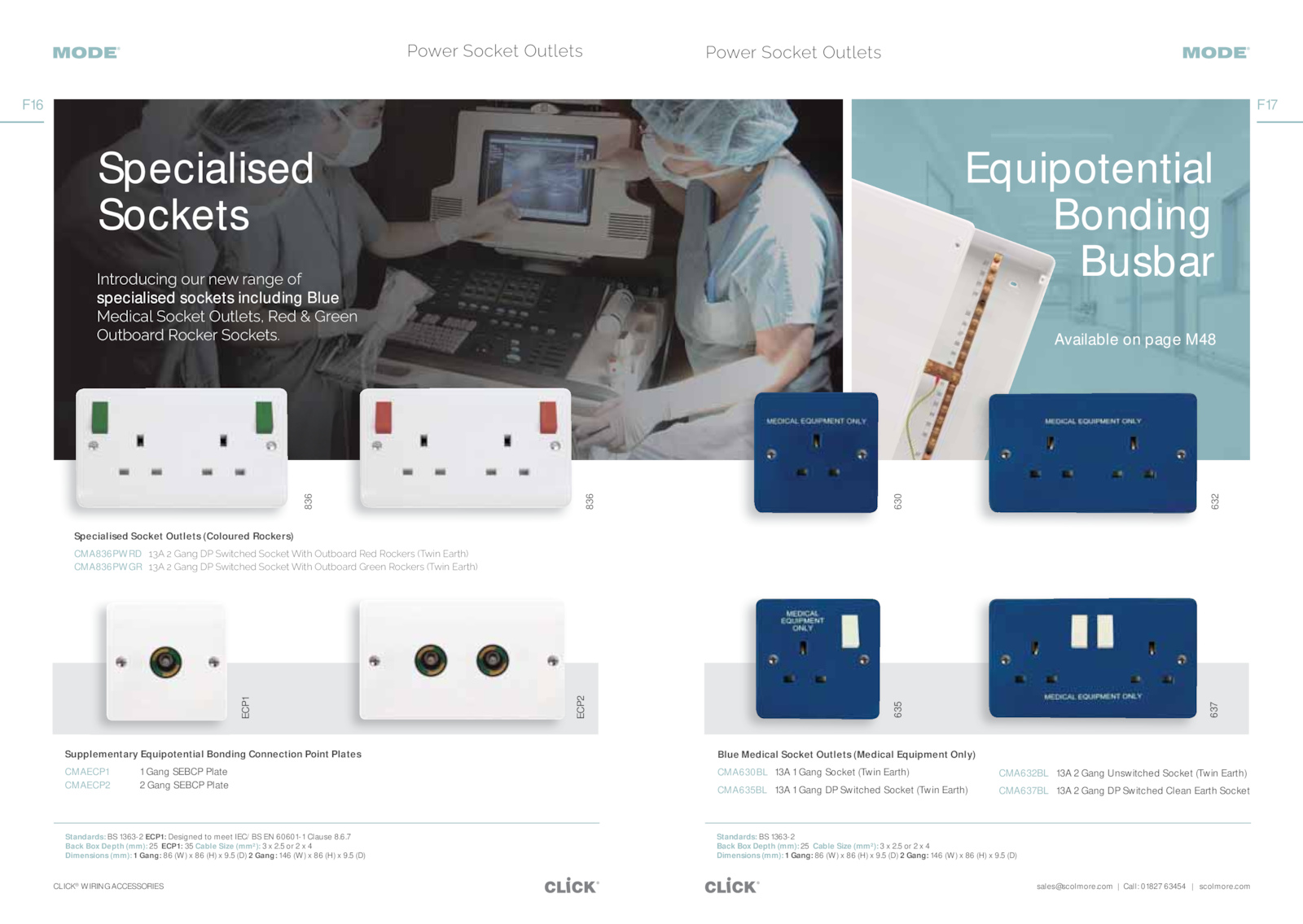 5 4 Dimensions (mm): Gang: (W) (H) 9.com CLICK® WIRING ACCESSORIES F17 F16 ŜƶĎƂ΄¢ŜāņĎƖ΄tƞƖʼnĎƖƊ ŜƶĎƂ΄¢ŜāņĎƖ΄tƞƖʼnĎƖƊ Standards: 1363-2 Back Box Depth (mm): Cable Size (mm²): 2.7 Back Box Depth (mm): ECP1: Cable Size (mm²): 2.5 (D) Specialised Sockets NœƖƂŜĈƞāijœħ΄ŜƞƂ΄œĎƶ΄ƂåœħĎ΄ŜĦ΄ specialised sockets including Blue iĎĈijāåʼn΄¢ŜāņĎƖ΄tƞƖʼnĎƖƊ͚΄ĎĈ΄π΄BƂĎĎœ΄ tƞƖĀŜåƂĈ΄ŜāņĎƂ΄¢ŜāņĎƖƊ͟΄ Blue Medical Socket Outlets (Medical Equipment Only) CMA630BL 13A Gang Socket (Twin Earth) CMA635BL 13A Gang Switched Socket (Twin Earth) Specialised Socket Outlets (Coloured Rockers) CMA836PWRD ̆̈΄̇΄Båœħ΄$΄¢ƶijƖāĮĎĈ΄¢ŜāņĎƖ΄ÎijƖĮ΄tƞƖĀŜåƂĈ΄ĎĈ΄ŜāņĎƂƊ΄ͬ¯ƶijœ΄*åƂƖĮͭ CMA836PWGR ̆̈΄̇΄Båœħ΄$΄¢ƶijƖāĮĎĈ΄¢ŜāņĎƖ΄ÎijƖĮ΄tƞƖĀŜåƂĈ΄BƂĎĎœ΄ŜāņĎƂƊ΄ͬ¯ƶijœ΄*åƂƖĮͭ 632 637 836 836 630 635 Supplementary Equipotential Bonding Connection Point Plates CMAECP1 Gang SEBCP Plate CMAECP2 Gang SEBCP Plate ECP2 ECP1 Standards: 1363-2 ECP1: Designed meet IEC/BS 60601-1 Clause 8.5 (D) CMA632BL 13A Gang Unswitched Socket (Twin Earth) CMA637BL 13A Gang Switched Clean Earth Socket Equipotential Bonding Busbar Available page M48 .com Call: 01827 63454 scolmore.sales@scolmore.5 (D) Gang: 146 (W) (H) 9.5 (D) Gang: 146 (W) (H) 9.5 4 Dimensions (mm): Gang: (W) (H) 9.6