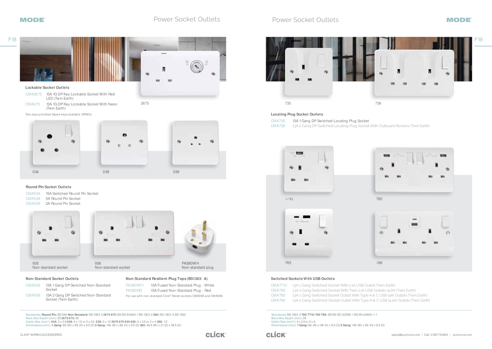5 2.5 039: 1.5 (H) 034 039 935 Non-standard socket PA380WH Non-standard plug 936 Non-standard socket 038 780 780 2675 Lockable Socket Outlets CMA2675 13A Key Lockable Socket With Red LED (Twin Earth) CMA675 13A Key Lockable Socket With Neon (Twin Earth) Two keys provided (Spare keys available: SP660).5 (W) (D) 49.5 (D) Gang: 146 (W) (H) 9.5 (D) 380: 49.sales@scolmore.5 Dimensions (mm): Gang: (W) (H) 9.5 (D) 735 736 771U U Non-Standard Socket Outlets CMA935 13A Gang Switched Non-Standard Socket CMA936 13A Gang Switched Non-Standard Socket (Twin Earth) Round Pin Socket Outlets CMA034 15A Switched Round Pin Socket CMA038 Round Pin Socket CMA039 Round Pin Socket Standards: Round Pin: 546 Non Standard: 1363-2 2675 675: 60669-1 1363-2 380: 1363/A 1362 Back Box Depth (mm): 2675 675: 35 Cable Size (mm²): 034: 2.5 038: 1. 786 86 Non-Standard Resilient Plug Tops (BS1363/A) PA380WH 13A Fused Non-Standard Plug White PA380RD 13A Fused Non-Standard Plug Red For use with non-standard Click® Mode sockets CMA935 and CMA936 785 .com Call: 01827 63454 scolmore.com CLICK® WIRING ACCESSORIES F19 F18 Switched Sockets With USB Outlets CMA771U ̆̈΄̆΄Båœħ΄¢ƶijƖāĮĎĈ΄¢ŜāņĎƖ΄ÎijƖĮ΄̇̆͟΄¶¢΄tƞƖʼnĎƖ΄ͬ¯ƶijœ΄*åƂƖĮͭ CMA780 ̆̈΄̇΄Båœħ΄¢ƶijƖāĮĎĈ΄¢ŜāņĎƖ΄ÎijƖĮ΄¯ƶijœ΄̇̆͟΄¶¢΄tƞƖʼnĎƖƊ΄ͬ̉̇ͭ͟΄ͬ¯ƶijœ΄*åƂƖĮͭ CMA785 ̆̈΄̆΄Båœħ΄¢ƶijƖāĮĎĈ΄¢ŜāņĎƖ΄tƞƖʼnĎƖ΄ÎijƖĮ΄¯ƼſĎ΄΄π΄΄¶¢΄ͬ̉ͭ΄tƞƖʼnĎƖƊ΄ͬ¯ƶijœ΄*åƂƖĮͭ CMA786 ̆̈΄̇΄Båœħ΄¢ƶijƖāĮĎĈ΄¢ŜāņĎƖ΄tƞƖʼnĎƖ΄ÎijƖĮ΄¯ƼſĎ΄΄π΄΄¶¢΄ͬ̉̇ͭ͟΄tƞƖʼnĎƖƊ΄ͬ¯ƶijœ΄*åƂƖĮͭ ŜƶĎƂ΄¢ŜāņĎƖ΄tƞƖʼnĎƖƊ Locating Plug Socket Outlets CMA735 13A Gang Switched Locating Plug Socket CMA736 ̆̈΄̇΄Båœħ΄$΄¢ƶijƖāĮĎĈ΄aŜāåƖijœħ΄ʼnƞħ΄¢ŜāņĎƖ΄ÎijƖĮ΄tƞƖĀŜåƂĈ΄ŜāņĎƂƊ΄ͬ¯ƶijœ΄*åƂƖĮͭ ŜƶĎƂ΄¢ŜāņĎƖ΄tƞƖʼnĎƖƊ Standards: 1363-2 780 771U 785 786: IEC 62368-1 62680-1-1 Back Box Depth (mm): 25 Cable Size (mm²): 2.5 4 Dimensions (mm): Gang: (W) (H) 9.5 2675 675 935 936: 2.5 380: 1.5 (D) Gang: 146 (W) (H) 9