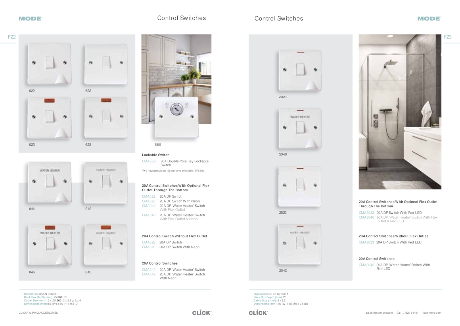 com Call: 01827 63454 scolmore.5 (D) .com Control Switches 2023 CLICK® WIRING ACCESSORIES F22 20A Control Switch Without Flex Outlet CMA622 20A Switch CMA623 20A Switch With Neon Control Switches Standards: 60669-1 Back Box Depth (mm): 660: 35 Cable Size (mm²): 2. 660 20A Control Switches With Optional Flex Outlet Through The Bottom CMA022 20A Switch CMA023 20A Switch With Neon CMA044 20A ‘Water Heater’ Switch ÎijƖĮ΄AʼnĎƻ΄tƞƖʼnĎƖ CMA046 20A ‘Water Heater’ Switch ÎijƖĮ΄AʼnĎƻ΄tƞƖʼnĎƖ΄π΄kĎŜœ 20A Control Switches CMA040 20A ‘Water Heater’ Switch CMA042 20A ‘Water Heater’ Switch With Neon 20A Control Switches With Optional Flex Outlet Through The Bottom CMA2023 20A Switch With Red LED CMA2046 ̇̅΄$΄ͼÎåƖĎƂ΄IĎåƖĎƂͽ΄¢ƶijƖāĮ΄ÎijƖĮ΄AʼnĎƻ΄ tƞƖʼnĎƖ΄π΄ĎĈ΄a*$ 20A Control Switches Without Flex Outlet CMA2623 20A Switch With Red LED 20A Control Switches CMA2042 20A ‘Water Heater’ Switch With Red LED 2023 2046 2623 2042 Standards: 60669-1 Back Box Depth (mm): 25 Cable Size (mm²): 2.F23 sales@scolmore.5 660: 2.5 (D) 022 046 623 023 040 044 622 042 Lockable Switch CMA660 20A Double Pole Key Lockable Switch Two keys provided (Spare keys available: SP660).5 4 Dimensions (mm): (W) (H) 9.5 Dimensions (mm): (W) (H) 9