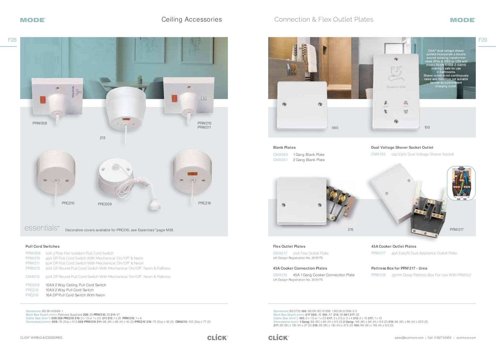com CLICK® WIRING ACCESSORIES F29 F28 Pull Cord Switches PRW208 ̆̅΄̈΄ŜʼnĎ΄Aåœ΄NƊŜʼnåƖijŜœ΄ƞʼnʼn΄ŜƂĈ΄¢ƶijƖāĮ PRW210 ̉̊΄$΄ƞʼnʼn΄ŜƂĈ΄¢ƶijƖāĮ΄ÎijƖĮ΄iĎāĮåœijāåʼn΄ͼtœͥtĦĦͽ΄π΄kĎŜœ PRW211 ̊̅΄$΄ƞʼnʼn΄ŜƂĈ΄¢ƶijƖāĮ΄ÎijƖĮ΄iĎāĮåœijāåʼn΄ͼtœͥtĦĦͽ΄π΄kĎŜœ PRW213 ̊̅΄$΄ŜƞœĈ΄ƞʼnʼn΄ŜƂĈ΄¢ƶijƖāĮ΄ÎijƖĮ΄iĎāĮåœijāåʼn΄ͼtœͥtĦĦͽ͚΄kĎŜœ΄π΄åƖƖƂĎƊƊ CMA213 ̊̅΄$΄ŜƞœĈ΄ƞʼnʼn΄ŜƂĈ΄¢ƶijƖāĮ΄ÎijƖĮ΄iĎāĮåœijāåʼn΄ͼtœͥtĦĦͽ͚΄kĎŜœ΄π΄åƖƖƂĎƊƊ PRC009 10AX Way Ceiling Pull Cord Switch PRC210 10AX Way Pull Cord Switch PRC216 16A Pull Cord Switch With Neon Standards: 60669-1 Back Box Depth (mm): Pattress Supplied 208: PRW210: 211: 47 Cable Size (mm²): 009 208 PRC210 216: 1.5 211 213: PRW210: 6 Dimensions (mm): 009: (Dia) 51. PRC210 PRW208 PRW210 PRW211 PRC216 PRC216 PRC210 PRC009 213 Ceiling Accessories Flex Outlet Plates CMA017 ̇̅΄AʼnĎƻ΄tƞƖʼnĎƖ΄ʼnåƖĎ UK Design Registration No. 3015175 45A Cooker Connection Plates CMA215 45A Gang Cooker Connection Plate UK Design Registration No.5 2.5 (D) 100: (W) 146 (H) 9.5 (D) 217: (W) 130 (H) (D) 218: (W) 130 (H) 37.5 2. 3015175 Pattress Box for PRW217 Urea PRW218 ̈̊őő΄$ĎĎſ΄åƖƖƂĎƊƊ΄Ŝƻ΄AŜƂ΄¶ƊĎ΄ÎijƖĮ΄Î̇̆̌ Standards: 5733 100: IEC 61558-1 61558-2-5 Back Box Depth (mm): 017 060: 100: 215: 061 217: 25 Cable Size (mm²): 100: 1. Shaver outlet not continuously rated and therefore not suitable for use permanent charging outlet.com Call: 01827 63454 scolmore.5 (D) 100 215 PRW217 060 Click® dual voltage shaver outlets incorporate double wound isolating transformer rated 20Va 230V 115V and meets 61558-2-5:2010 making safe for use in bathrooms.5 (D) Gang: 146 (W) (H) 9.5 215: 217: 10 Dimensions (mm): Gang: (W) (H) 9.5 208 PRW210 211: (W) (H) (D) PRC210 216: (Dia) (D) CMA213: 100 (Dia) (D) Decorative covers available for PRC210, see Essentials™ page M38.5 (D) 215: (W) (H) 22.5 017: 2.sales@scolmore. Blank Plates CMA060 Gang Blank Plate CMA061 Gang Blank Plate Dual Voltage Shaver Socket Outlet CMA100 ̆̆̊ͥ̇̈̅Í΄$ƞåʼn΄ÍŜʼnƖåħĎ΄¢ĮåƵĎƂ΄¢ŜāņĎƖ 45A Cooker Outlet Plates PRW217 ̉̊΄*åƊƼĦijƖ΄$ƞåʼn΄ſſʼnijåœāĎ΄tƞƖʼnĎƖ΄ʼnåƖĎ ŜœœĎāƖijŜœ΄π΄AʼnĎƻ΄tƞƖʼnĎƖ΄ʼnåƖĎƊ