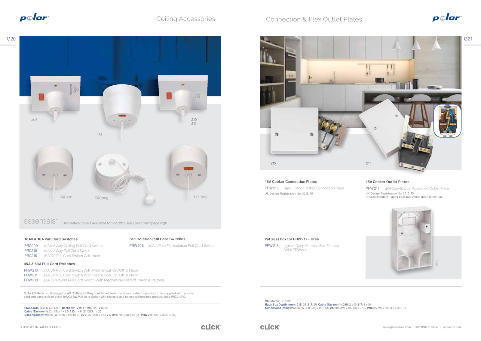 ̇̆̅ ̇̅̍ 210 211 ̇̆̋ ̇̆̋ ̇̆̅ ̅̅̎ ̇̆̈ Fan Isolation Pull Cord Switches PRW208 ̆̅΄̈΄ŜʼnĎ΄Aåœ΄NƊŜʼnåƖijŜœ΄ƞʼnʼn΄ŜƂĈ΄¢ƶijƖāĮ 215 217 45A Cooker Outlet Plates PRW217 ̉̊΄*åƊƼĦijƖ΄$ƞåʼn΄ſſʼnijåœāĎ΄tƞƖʼnĎƖ΄ʼnåƖĎ UK Design Registration No. 3015175 ŜœœĎāƖijŜœ΄π΄AʼnĎƻ΄tƞƖʼnĎƖ΄ʼnåƖĎƊ Ďijʼnijœħ΄āāĎƊƊŜƂijĎƊ $ĎāŜƂåƖijƵĎ΄āŜƵĎƂƊ΄åƵåijʼnåĀʼnĎ΄ĦŜƂ΄͚̇̆̅΄ƊĎĎ΄*ƊƊĎœƖijåʼnƊ™ ΄ſåħĎ΄ï̍͟ Standards: 5733 Back Box Depth (mm): 215: 217: Cable Size (mm²): 215: 217: 10 Dimensions (mm): 215: (W) (H) 22. Example: 10AX Say Pull-cord Switch with red cord and bangle will become product code PRC210RD.5 2. .com CLICK® WIRING ACCESSORIES G21 G20 45A Cooker Connection Plates PRW215 ̉̊΄̆΄Båœħ΄ŜŜņĎƂ΄ŜœœĎāƖijŜœ΄ʼnåƖĎ UK Design Registration No.com Call: 01827 63454 scolmore. 3015175 Utilises standard gang back box 25mm deep minimum.5 210: 211 213: 25 Dimensions (mm): (W) (H) (D) 009: (Dia) 51.5 (D) Standards: 60669-1 Backbox: 211: 208: 210: 35 Cable Size (mm²): 1.5 210 216: (Dia) (D) PRW213: 100 (Dia) (D) 10AX 16A Pull Cord Switches PRC009 ̆̅Ó΄̇΄ÎåƼ΄Ďijʼnijœħ΄ƞʼnʼn΄ŜƂĈ΄¢ƶijƖāĮ PRC210 ̆̅Ó΄̇΄ÎåƼ΄ƞʼnʼn΄ŜƂĈ΄¢ƶijƖāĮ PRC216 ̆̋΄$΄ƞʼnʼn΄ŜƂĈ΄¢ƶijƖāĮ΄ÎijƖĮ΄kĎŜœ 45A 50A Pull Cord Switches PRW210 ̉̊΄$΄ƞʼnʼn΄ŜƂĈ΄¢ƶijƖāĮ΄ÎijƖĮ΄iĎāĮåœijāåʼn΄ͼtœͥtĦĦͽ΄π΄kĎŜœ PRW211 ̊̅΄$΄ƞʼnʼn΄ŜƂĈ΄¢ƶijƖāĮ΄ÎijƖĮ΄iĎāĮåœijāåʼn΄ͼtœͥtĦĦͽ΄π΄kĎŜœ PRW213 ̊̅΄$΄ŜƞœĈ΄ƞʼnʼn΄ŜƂĈ΄¢ƶijƖāĮ΄ÎijƖĮ΄iĎāĮåœijāåʼn΄ͼtœͥtĦĦͽ͚΄kĎŜœ΄π΄åƖƖƂĎƊƊ Pattress Box for PRW217 Urea PRW218 ̈̊őő΄$ĎĎſ΄åƖƖƂĎƊƊ΄Ŝƻ΄AŜƂ΄¶ƊĎ΄ ÎijƖĮ΄Î̇̆̌ ̇̆̍ ¢ƞǗƻ΄$΄ͬĎĈ΄āŜƂĈ΄π΄ĀåœħʼnĎͭ΄ŜƂ΄B΄ͬœƖĮƂåāijƖĎ΄BƂĎƼ΄āŜƂĈ΄π΄ĀåœħʼnĎͭ΄ƖŜ΄ƖĮĎ΄åĀŜƵĎ΄āŜĈĎƊ΄ĦŜƂ΄ſƂŜĈƞāƖ΄ƖŜ΄ĀĎ΄ƊƞſſʼnijĎĈ΄ƶijƖĮ΄ƂĎƁƞijƂĎĈ΄ cord and bangle.5 (D) 217: (W) 130 (H) (D)218: (W) 130 (H) 37.sales@scolmore