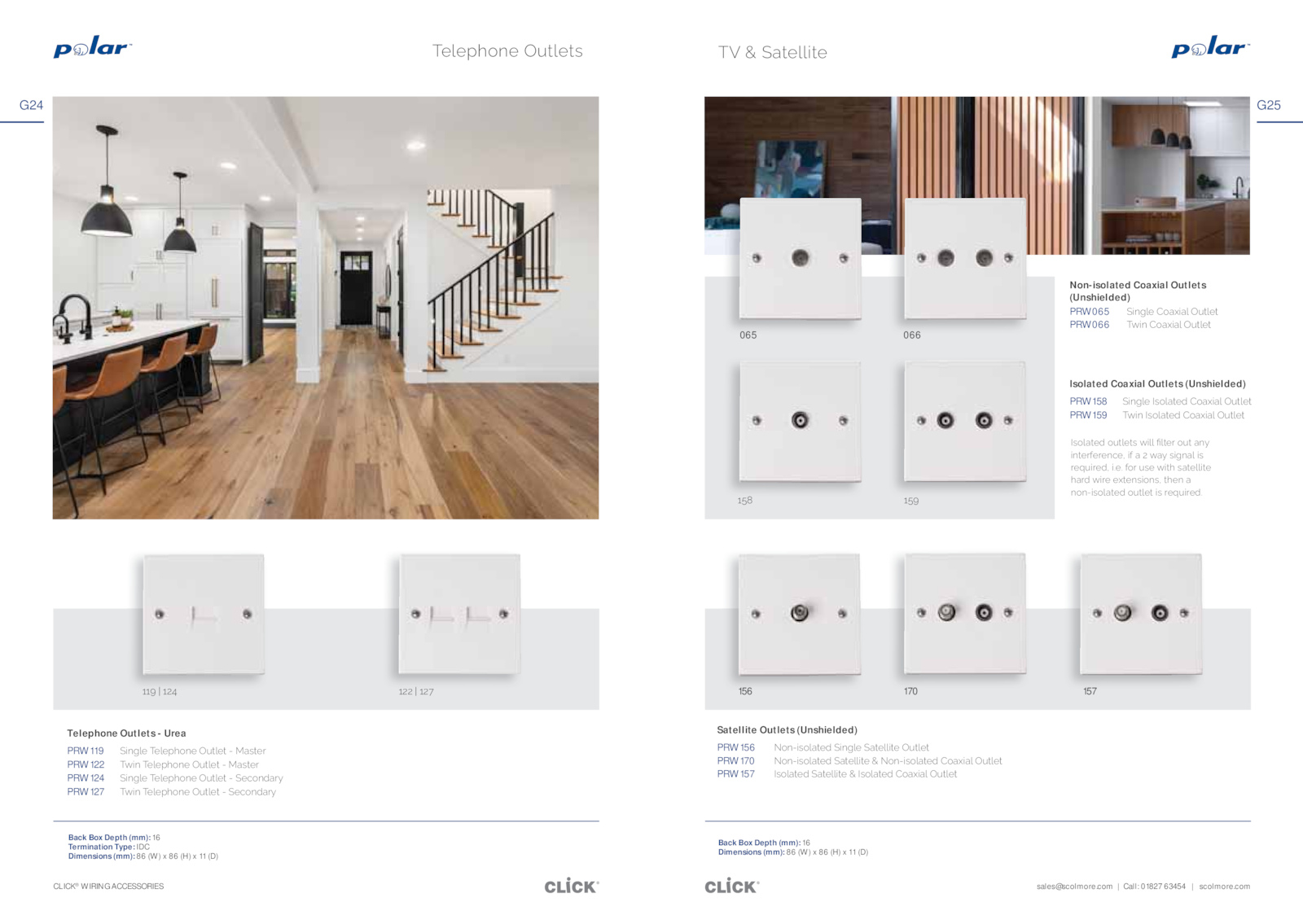 sales@scolmore.com Call: 01827 63454 scolmore.com CLICK® WIRING ACCESSORIES G25 G24 Isolated Coaxial Outlets (Unshielded) PRW158 ¢ijœħʼnĎ΄NƊŜʼnåƖĎĈ΄Ŝåƻijåʼn΄tƞƖʼnĎƖ PRW159 ¯ƶijœ΄NƊŜʼnåƖĎĈ΄Ŝåƻijåʼn΄tƞƖʼnĎƖ ¯Í΄π΄¢åƖĎʼnʼnijƖĎ Non-isolated Coaxial Outlets (Unshielded) PRW065 ¢ijœħʼnĎ΄Ŝåƻijåʼn΄tƞƖʼnĎƖ PRW066 ¯ƶijœ΄Ŝåƻijåʼn΄tƞƖʼnĎƖ ¯ĎʼnĎſĮŜœĎ΄tƞƖʼnĎƖƊ Telephone Outlets Urea PRW119 ¢ijœħʼnĎ΄¯ĎʼnĎſĮŜœĎ΄tƞƖʼnĎƖ΄Ͳ΄iåƊƖĎƂ PRW122 ¯ƶijœ΄¯ĎʼnĎſĮŜœĎ΄tƞƖʼnĎƖ΄Ͳ΄iåƊƖĎƂ PRW124 ¢ijœħʼnĎ΄¯ĎʼnĎſĮŜœĎ΄tƞƖʼnĎƖ΄Ͳ΄¢ĎāŜœĈåƂƼ PRW127 ¯ƶijœ΄¯ĎʼnĎſĮŜœĎ΄tƞƖʼnĎƖ΄Ͳ΄¢ĎāŜœĈåƂƼ NƊŜʼnåƖĎĈ΄ŜƞƖʼnĎƖƊ΄ƶijʼnʼn΄ǙʼnƖĎƂ΄ŜƞƖ΄åœƼ΄ ijœƖĎƂĦĎƂĎœāĎ͚΄ijĦ΄å΄̇΄ƶåƼ΄Ɗijħœåʼn΄ijƊ΄ ƂĎƁƞijƂĎĈ͚΄ij͟Ď͟΄ĦŜƂ΄ƞƊĎ΄ƶijƖĮ΄ƊåƖĎʼnʼnijƖĎ΄ ĮåƂĈ΄ƶijƂĎ΄ĎƻƖĎœƊijŜœƊ͚΄ƖĮĎœ΄å΄ œŜœͲijƊŜʼnåƖĎĈ΄ŜƞƖʼnĎƖ΄ijƊ΄ƂĎƁƞijƂĎĈ͟ Back Box Depth (mm): 16 Dimensions (mm): (W) (H) (D) Back Box Depth (mm): 16 Termination Type: IDC Dimensions (mm): (W) (H) (D) ̆̆̎΄χ΄̆̇̉ ̆̇̇΄χ΄̆̇̌ 066 065 170 ̆̊̎ ̆̊̍ 157 156 χ ̆̆̎ ̆̇̉ Satellite Outlets (Unshielded) PRW156 kŜœͲijƊŜʼnåƖĎĈ΄¢ijœħʼnĎ΄¢åƖĎʼnʼnijƖĎ΄tƞƖʼnĎƖ PRW170 kŜœͲijƊŜʼnåƖĎĈ΄¢åƖĎʼnʼnijƖĎ΄π΄kŜœͲijƊŜʼnåƖĎĈ΄Ŝåƻijåʼn΄tƞƖʼnĎƖ PRW157 NƊŜʼnåƖĎĈ΄¢åƖĎʼnʼnijƖĎ΄π΄NƊŜʼnåƖĎĈ΄Ŝåƻijåʼn΄tƞƖʼnĎƖ
