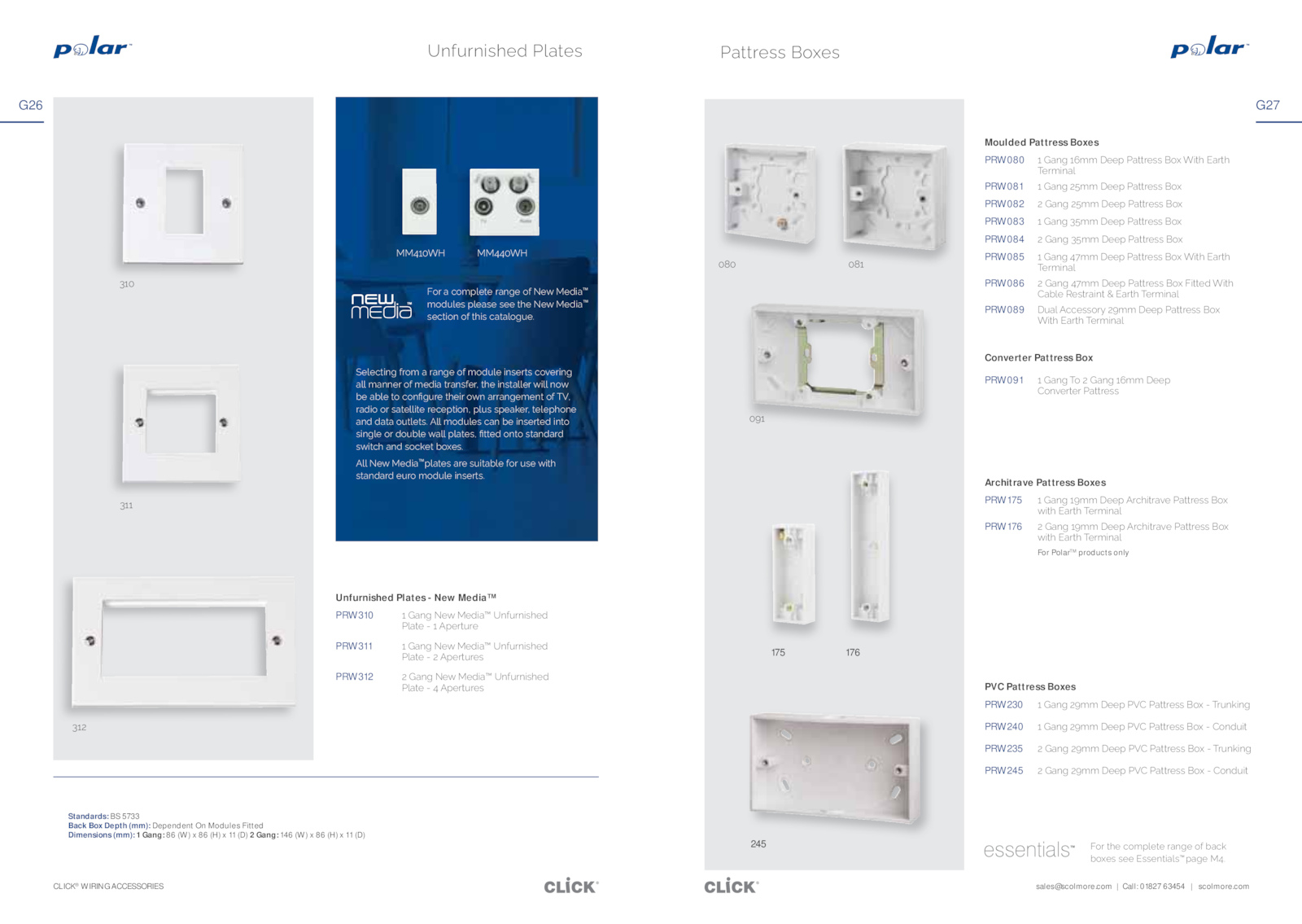 com Call: 01827 63454 scolmore.sales@scolmore.com CLICK® WIRING ACCESSORIES G27 G26 åƖƖƂĎƊƊ΄ŜƻĎƊ ¶œĦƞƂœijƊĮĎĈ΄ʼnåƖĎƊ Standards: 5733 Back Box Depth (mm): Dependent Modules Fitted Dimensions (mm): Gang: (W) (H) (D) Gang: 146 (W) (H) (D) AŜƂ΄ƖĮĎ΄āŜőſʼnĎƖĎ΄ƂåœħĎ΄ŜĦ΄Āåāņ΄ ĀŜƻĎƊ΄ƊĎĎ΄*ƊƊĎœƖijåʼnƊ™ ΄ſåħĎ΄ỉ͟ Architrave Pattress Boxes PRW175 ̆΄Båœħ΄̆̎őő΄$ĎĎſ΄ƂāĮijƖƂåƵĎ΄åƖƖƂĎƊƊ΄Ŝƻ΄ ƶijƖĮ΄*åƂƖĮ΄¯ĎƂőijœåʼn PRW176 ̇΄Båœħ΄̆̎őő΄$ĎĎſ΄ƂāĮijƖƂåƵĎ΄åƖƖƂĎƊƊ΄Ŝƻ΄ ƶijƖĮ΄*åƂƖĮ΄¯ĎƂőijœåʼn For PolarTM products only Moulded Pattress Boxes PRW080 ̆΄Båœħ΄̆̋őő΄$ĎĎſ΄åƖƖƂĎƊƊ΄Ŝƻ΄ÎijƖĮ΄*åƂƖĮ΄ ¯ĎƂőijœåʼn PRW081 ̆΄Båœħ΄̇̊őő΄$ĎĎſ΄åƖƖƂĎƊƊ΄Ŝƻ PRW082 ̇΄Båœħ΄̇̊őő΄$ĎĎſ΄åƖƖƂĎƊƊ΄Ŝƻ PRW083 ̆΄Båœħ΄̈̊őő΄$ĎĎſ΄åƖƖƂĎƊƊ΄Ŝƻ PRW084 ̇΄Båœħ΄̈̊őő΄$ĎĎſ΄åƖƖƂĎƊƊ΄Ŝƻ PRW085 ̆΄Båœħ΄̉̌őő΄$ĎĎſ΄åƖƖƂĎƊƊ΄Ŝƻ΄ÎijƖĮ΄*åƂƖĮ΄ ¯ĎƂőijœåʼn PRW086 ̇΄Båœħ΄̉̌őő΄$ĎĎſ΄åƖƖƂĎƊƊ΄Ŝƻ΄AijƖƖĎĈ΄ÎijƖĮ΄ åĀʼnĎ΄ĎƊƖƂåijœƖ΄π΄*åƂƖĮ΄¯ĎƂőijœåʼn PRW089 $ƞåʼn΄āāĎƊƊŜƂƼ΄̇̎őő΄$ĎĎſ΄åƖƖƂĎƊƊ΄Ŝƻ΄ ÎijƖĮ΄*åƂƖĮ΄¯ĎƂőijœåʼn Converter Pattress Box PRW091 ̆΄Båœħ΄¯Ŝ΄̇΄Båœħ΄̆̋őő΄$ĎĎſ΄ ŜœƵĎƂƖĎƂ΄åƖƖƂĎƊƊ ̅̍̅ ̅̍̆ ̅̎̆ 175 176 ̈̆̅ ̈̆̆ ̈̆̇ iỉ̆̅ÎI iỉ̉̅ÎI Unfurnished Plates New Media™ PRW310 ̆΄Båœħ΄kĎƶ΄iĎĈijåυ΄¶œĦƞƂœijƊĮĎĈ΄ ʼnåƖĎ΄Ͳ΄̆΄ſĎƂƖƞƂĎ PRW311 ̆΄Båœħ΄kĎƶ΄iĎĈijåυ΄¶œĦƞƂœijƊĮĎĈ΄ ʼnåƖĎ΄Ͳ΄̇΄ſĎƂƖƞƂĎƊ PRW312 ̇΄Båœħ΄kĎƶ΄iĎĈijåυ΄¶œĦƞƂœijƊĮĎĈ΄ ʼnåƖĎ΄Ͳ΄̉΄ſĎƂƖƞƂĎƊ ¢ĎʼnĎāƖijœħ΄ĦƂŜő΄å΄ƂåœħĎ΄ŜĦ΄őŜĈƞʼnĎ΄ijœƊĎƂƖƊ΄āŜƵĎƂijœħ΄ åʼnʼn΄ő圜ĎƂ΄ŜĦ΄őĎĈijå΄ƖƂåœƊĦĎƂ͚΄ƖĮĎ΄ijœƊƖåʼnʼnĎƂ΄ƶijʼnʼn΄œŜƶ΄ ĀĎ΄åĀʼnĎ΄ƖŜ΄āŜœǙħƞƂĎ΄ƖĮĎijƂ΄Ŝƶœ΄åƂƂåœħĎőĎœƖ΄ŜĦ΄¯Í͚΄ ƂåĈijŜ΄ŜƂ΄ƊåƖĎʼnʼnijƖĎ΄ƂĎāĎſƖijŜœ͚΄ſʼnƞƊ΄ƊſĎåņĎƂ͚΄ƖĎʼnĎſĮŜœĎ΄ åœĈ΄ĈåƖå΄ŜƞƖʼnĎƖƊ͟΄ʼnʼn΄őŜĈƞʼnĎƊ΄āåœ΄ĀĎ΄ijœƊĎƂƖĎĈ΄ijœƖŜ΄ ƊijœħʼnĎ΄ŜƂ΄ĈŜƞĀʼnĎ΄ƶåʼnʼn΄ſʼnåƖĎƊ͚΄ǙƖƖĎĈ΄ŜœƖŜ΄ƊƖåœĈåƂĈ΄ ƊƶijƖāĮ΄åœĈ΄ƊŜāņĎƖ΄ĀŜƻĎƊ͟΄ ʼnʼn΄kĎƶ΄iĎĈijå™ ΄ſʼnåƖĎƊ΄åƂĎ΄ƊƞijƖåĀʼnĎ΄ĦŜƂ΄ƞƊĎ΄ƶijƖĮ΄ ƊƖåœĈåƂĈ΄ĎƞƂŜ΄őŜĈƞʼnĎ΄ijœƊĎƂƖƊ͟ AŜƂ΄å΄āŜőſʼnĎƖĎ΄ƂåœħĎ΄ŜĦ΄kĎƶ΄iĎĈijå™ őŜĈƞʼnĎƊ΄ſʼnĎåƊĎ΄ƊĎĎ΄ƖĮĎ΄kĎƶ΄iĎĈijå™ ƊĎāƖijŜœ΄ŜĦ΄ƖĮijƊ΄āåƖåʼnŜħƞĎ͟ ii ÎI PVC Pattress Boxes PRW230 ̆΄Båœħ΄̇̎őő΄$ĎĎſ΄Í΄åƖƖƂĎƊƊ΄Ŝƻ΄Ͳ΄¯Ƃƞœņijœħ PRW240 ̆΄Båœħ΄̇̎őő΄$ĎĎſ΄Í΄åƖƖƂĎƊƊ΄Ŝƻ΄Ͳ΄ŜœĈƞijƖ PRW235 ̇΄Båœħ΄̇̎őő΄$ĎĎſ΄Í΄åƖƖƂĎƊƊ΄Ŝƻ΄Ͳ΄¯Ƃƞœņijœħ PRW245 ̇΄Båœħ΄̇̎őő΄$ĎĎſ΄Í΄åƖƖƂĎƊƊ΄Ŝƻ΄Ͳ΄ŜœĈƞijƖ 245 ̅̎̆