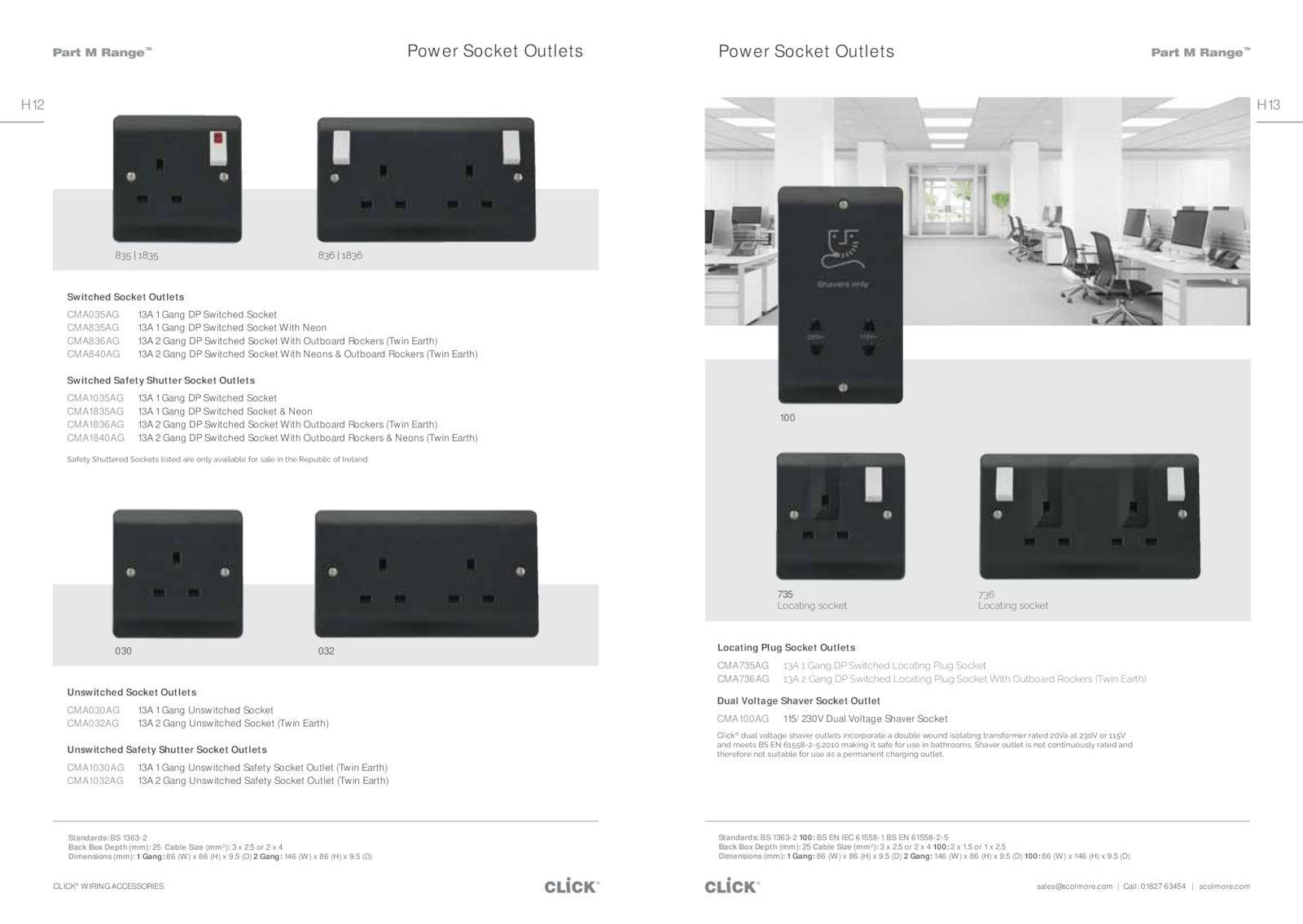 5 2.sales@scolmore.5 4 Dimensions (mm): Gang: (W) (H) 9.5 (D) 100: (W) 146 (H) 9.5 100: 1.5 (D) Gang: 146 (W) (H) 9.com Call: 01827 63454 scolmore.com CLICK® WIRING ACCESSORIES H13 H12 Power Socket Outlets Power Socket Outlets Standards: 1363-2 Back Box Depth (mm): Cable Size (mm²): 2.5 Dimensions (mm): Gang: (W) (H) 9.5 (D) Standards: 1363-2 100: IEC 61558-1 61558-2-5 Back Box Depth (mm): Cable Size (mm²): 2.5 (D) Gang: 146 (W) (H) 9.5 (D) Locating Plug Socket Outlets CMA735AG ̆̈΄̆΄Båœħ΄$΄¢ƶijƖāĮĎĈ΄aŜāåƖijœħ΄ʼnƞħ΄¢ŜāņĎƖ CMA736AG ̆̈΄̇΄Båœħ΄$΄¢ƶijƖāĮĎĈ΄aŜāåƖijœħ΄ʼnƞħ΄¢ŜāņĎƖ΄ÎijƖĮ΄tƞƖĀŜåƂĈ΄ŜāņĎƂƊ΄ͬ¯ƶijœ΄*åƂƖĮͭ Switched Socket Outlets CMA035AG 13A Gang Switched Socket CMA835AG 13A Gang Switched Socket With Neon CMA836AG 13A Gang Switched Socket With Outboard Rockers (Twin Earth) CMA840AG 13A Gang Switched Socket With Neons Outboard Rockers (Twin Earth) Switched Safety Shutter Socket Outlets CMA1035AG 13A Gang Switched Socket CMA1835AG 13A Gang Switched Socket Neon CMA1836AG 13A Gang Switched Socket With Outboard Rockers (Twin Earth) CMA1840AG 13A Gang Switched Socket With Outboard Rockers Neons (Twin Earth) 735 aŜāåƖijœħ΄ƊŜāņĎƖ ̌̈̋ aŜāåƖijœħ΄ƊŜāņĎƖ 100 Dual Voltage Shaver Socket Outlet CMA100AG 115/230V Dual Voltage Shaver Socket Click® ΄Ĉƞåʼn΄ƵŜʼnƖåħĎ΄ƊĮåƵĎƂ΄ŜƞƖʼnĎƖƊ΄ijœāŜƂſŜƂåƖĎ΄å΄ĈŜƞĀʼnĎ΄ƶŜƞœĈ΄ijƊŜʼnåƖijœħ΄ƖƂåœƊĦŜƂőĎƂ΄ƂåƖĎĈ΄̇̅Íå΄åƖ΄̇̈̅Í΄ŜƂ΄̆̆̊Í΄ åœĈ΄őĎĎƖƊ΄¢΄*k΄̋̆̊̊̍Ͳ̇Ͳ͙̊̇̅̆̅΄őåņijœħ΄ijƖ΄ƊåĦĎ΄ĦŜƂ΄ƞƊĎ΄ijœ΄ĀåƖĮƂŜŜőƊ͟΄¢ĮåƵĎƂ΄ŜƞƖʼnĎƖ΄ijƊ΄œŜƖ΄āŜœƖijœƞŜƞƊʼnƼ΄ƂåƖĎĈ΄åœĈ΄ ƖĮĎƂĎĦŜƂĎ΄œŜƖ΄ƊƞijƖåĀʼnĎ΄ĦŜƂ΄ƞƊĎ΄åƊ΄å΄ſĎƂőåœĎœƖ΄āĮåƂħijœħ΄ŜƞƖʼnĎƖ͟ ¢åĦĎƖƼ΄¢ĮƞƖƖĎƂĎĈ΄¢ŜāņĎƖƊ΄ʼnijƊƖĎĈ΄åƂĎ΄ŜœʼnƼ΄åƵåijʼnåĀʼnĎ΄ĦŜƂ΄ƊåʼnĎ΄ijœ΄ƖĮĎ΄ĎſƞĀʼnijā΄ŜĦ΄NƂĎʼnåœĈ͟ ̍̈̋΄χ΄̆̍̈̋ ̍̈̊΄χ΄̆̍̈̊ Unswitched Socket Outlets CMA030AG 13A Gang Unswitched Socket CMA032AG 13A Gang Unswitched Socket (Twin Earth) ̍̈̋΄χ΄̆̍̈̋ ̍̈̊΄χ΄̆̍̈̊ 032 030 Unswitched Safety Shutter Socket Outlets CMA1030AG 13A Gang Unswitched Safety Socket Outlet (Twin Earth) CMA1032AG 13A Gang Unswitched Safety Socket Outlet (Twin Earth)