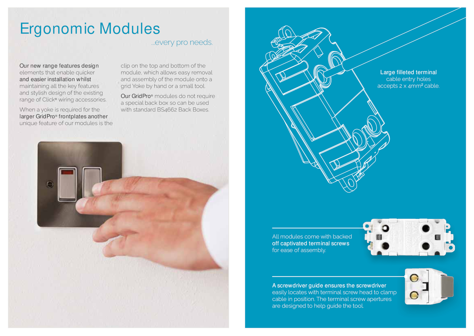 Ergonomic Modules ͟͟͟ĎƵĎƂƼ΄ſƂŜ΄œĎĎĈƊ͟ Our new range features design ĎʼnĎőĎœƖƊ΄ƖĮåƖ΄ĎœåĀʼnĎ΄ƁƞijāņĎƂ΄ and easier installation whilst őåijœƖåijœijœħ΄åʼnʼn΄ƖĮĎ΄ņĎƼ΄ĦĎåƖƞƂĎƊ΄ åœĈ΄ƊƖƼʼnijƊĮ΄ĈĎƊijħœ΄ŜĦ΄ƖĮĎ΄ĎƻijƊƖijœħ΄ ƂåœħĎ΄ŜĦ΄ʼnijāņ® ΄ƶijƂijœħ΄åāāĎƊƊŜƂijĎƊ͟΄ ÎĮĎœ΄å΄ƼŜņĎ΄ijƊ΄ƂĎƁƞijƂĎĈ΄ĦŜƂ΄ƖĮĎ΄ larger GridPro® frontplates another ƞœijƁƞĎ΄ĦĎåƖƞƂĎ΄ŜĦ΄ŜƞƂ΄őŜĈƞʼnĎƊ΄ijƊ΄ƖĮĎ΄ āʼnijſ΄Ŝœ΄ƖĮĎ΄ƖŜſ΄åœĈ΄ĀŜƖƖŜő΄ŜĦ΄ƖĮĎ΄ őŜĈƞʼnĎ͚΄ƶĮijāĮ΄åʼnʼnŜƶƊ΄ĎåƊƼ΄ƂĎőŜƵåʼn΄ åœĈ΄åƊƊĎőĀʼnƼ΄ŜĦ΄ƖĮĎ΄őŜĈƞʼnĎ΄ŜœƖŜ΄å΄ ħƂijĈ΄ÔŜņĎ΄ĀƼ΄ĮåœĈ΄ŜƂ΄å΄Ɗőåʼnʼn΄ƖŜŜʼn͟΄ Our GridPro® ΄őŜĈƞʼnĎƊ΄ĈŜ΄œŜƖ΄ƂĎƁƞijƂĎ΄ å΄ƊſĎāijåʼn΄Āåāņ΄ĀŜƻ΄ƊŜ΄āåœ΄ĀĎ΄ƞƊĎĈ΄ ƶijƖĮ΄ƊƖåœĈåƂĈ΄¢̉̋̋̇΄åāņ΄ŜƻĎƊ͟ ʼnʼn΄őŜĈƞʼnĎƊ΄āŜőĎ΄ƶijƖĮ΄ĀåāņĎĈ΄ off captivated terminal screws ĦŜƂ΄ĎåƊĎ΄ŜĦ΄åƊƊĎőĀʼnƼ͟ Large filleted terminal āåĀʼnĎ΄ĎœƖƂƼ΄ĮŜʼnĎƊ΄ åāāĎſƖƊ΄̇΄ƻ΄̉őő2 ΄āåĀʼnĎ͟ A screwdriver guide ensures the screwdriver ĎåƊijʼnƼ΄ʼnŜāåƖĎƊ΄ƶijƖĮ΄ƖĎƂőijœåʼn΄ƊāƂĎƶ΄ĮĎåĈ΄ƖŜ΄āʼnåőſ΄ āåĀʼnĎ΄ijœ΄ſŜƊijƖijŜœ͟΄¯ĮĎ΄ƖĎƂőijœåʼn΄ƊāƂĎƶ΄åſĎƂƖƞƂĎƊ΄ åƂĎ΄ĈĎƊijħœĎĈ΄ƖŜ΄ĮĎʼnſ΄ħƞijĈĎ΄ƖĮĎ΄ƖŜŜʼn͟΄