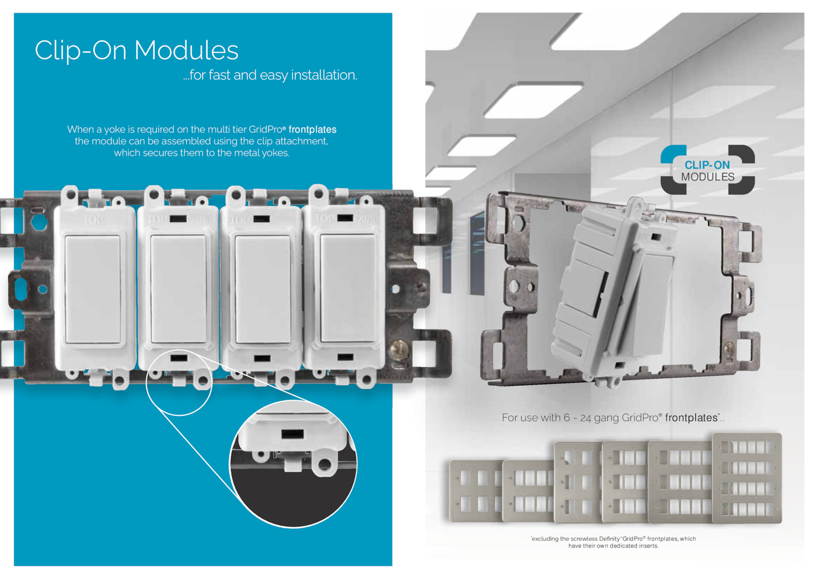 ʼnijſͲtœ΄iŜĈƞʼnĎƊ ͟͟͟ĦŜƂ΄ĦåƊƖ΄åœĈ΄ĎåƊƼ΄ijœƊƖåʼnʼnåƖijŜœ͟ ÎĮĎœ΄å΄ƼŜņĎ΄ijƊ΄ƂĎƁƞijƂĎĈ΄Ŝœ΄ƖĮĎ΄őƞʼnƖij΄ƖijĎƂ΄BƂijĈƂŜ® frontplates ƖĮĎ΄őŜĈƞʼnĎ΄āåœ΄ĀĎ΄åƊƊĎőĀʼnĎĈ΄ƞƊijœħ΄ƖĮĎ΄āʼnijſ΄åƖƖåāĮőĎœƖ͚΄ ƶĮijāĮ΄ƊĎāƞƂĎƊ΄ƖĮĎő΄ƖŜ΄ƖĮĎ΄őĎƖåʼn΄ƼŜņĎƊ͟ .CLIP-ON MODULES AŜƂ΄ƞƊĎ΄ƶijƖĮ΄̋΄Ͳ΄̇̉΄ħåœħ΄BƂijĈƂŜ® frontplates* ͟͟͟ * ĎƻāʼnƞĈijœħ΄ƖĮĎ΄ƊāƂĎƶʼnĎƊƊ΄$ĎǙœijƖƼ™ GridPro® frontplates, which have their own dedicated inserts