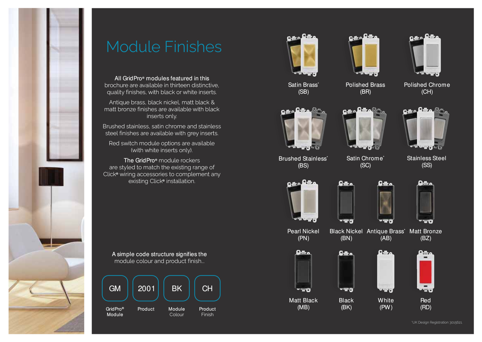 Polished Brass (BR) Satin Chrome* (SC) Polished Chrome (CH) Satin Brass* (SB) Stainless Steel (SS) Pearl Nickel (PN) Brushed Stainless* (BS) White (PW) Black (BK) A simple code structure signifies the őŜĈƞʼnĎ΄āŜʼnŜƞƂ΄åœĈ΄ſƂŜĈƞāƖ΄ĦijœijƊĮ͟͟͟ All GridPro® modules featured this ĀƂŜāĮƞƂĎ΄åƂĎ΄åƵåijʼnåĀʼnĎ΄ijœ΄ƖĮijƂƖĎĎœ΄ĈijƊƖijœāƖijƵĎ͚΄ ƁƞåʼnijƖƼ΄ĦijœijƊĮĎƊ͚΄ƶijƖĮ΄Āʼnåāņ΄ŜƂ΄ƶĮijƖĎ΄ijœƊĎƂƖƊ͟ œƖijƁƞĎ΄ĀƂåƊƊ͚΄Āʼnåāņ΄œijāņĎʼn͚΄őåƖƖ΄Āʼnåāņ΄π΄ őåƖƖ΄ĀƂŜœdžĎ΄ĦijœijƊĮĎƊ΄åƂĎ΄åƵåijʼnåĀʼnĎ΄ƶijƖĮ΄Āʼnåāņ΄ ijœƊĎƂƖƊ΄ŜœʼnƼ͟ ƂƞƊĮĎĈ΄ƊƖåijœʼnĎƊƊ͚΄ƊåƖijœ΄āĮƂŜőĎ΄åœĈ΄ƊƖåijœʼnĎƊƊ΄ ƊƖĎĎʼn΄ĦijœijƊĮĎƊ΄åƂĎ΄åƵåijʼnåĀʼnĎ΄ƶijƖĮ΄ħƂĎƼ΄ijœƊĎƂƖƊ͟ ĎĈ΄ƊƶijƖāĮ΄őŜĈƞʼnĎ΄ŜſƖijŜœƊ΄åƂĎ΄åƵåijʼnåĀʼnĎ΄ ͬƶijƖĮ΄ƶĮijƖĎ΄ijœƊĎƂƖƊ΄ŜœʼnƼͭ͟ The GridPro® ΄őŜĈƞʼnĎ΄ƂŜāņĎƂƊ΄ åƂĎ΄ƊƖƼʼnĎĈ΄ƖŜ΄őåƖāĮ΄ƖĮĎ΄ĎƻijƊƖijœħ΄ƂåœħĎ΄ŜĦ΄ ʼnijāņ® ΄ƶijƂijœħ΄åāāĎƊƊŜƂijĎƊ΄ƖŜ΄āŜőſʼnĎőĎœƖ΄åœƼ΄ ĎƻijƊƖijœħ΄ʼnijāņ® ΄ijœƊƖåʼnʼnåƖijŜœ͟΄ GridPro® Module Product Module ŜʼnŜƞƂ Product AijœijƊĮ GM 2001 CH ͕¶_΄$ĎƊijħœ΄ĎħijƊƖƂåƖijŜœ΄̈̅̆̊̋̇̆͟ iŜĈƞʼnĎ΄AijœijƊĮĎƊ Antique Brass* (AB) Black Nickel (BN) Matt Black (MB) Red (RD) Matt Bronze (BZ)
