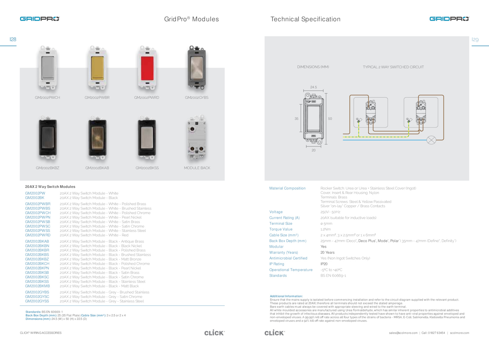 Bare earth cables must always covered with appropriate sleeving and wired the earth terminal. All products independently tested have shown have anti-viral properties against enveloped and œŜœͲĎœƵĎʼnŜſĎĈ΄ƵijƂƞƊĎƊ͟΄΄̎̎̎̎͟μ΄ņijʼnʼn΄Ŝǖ΄ƂåƖĎ΄åāƂŜƊƊ΄åʼnʼn΄ĦŜƞƂ΄ƖƼſĎƊ΄ŜĦ΄ƖĮĎ΄ƊƖƂåijœƊ΄ŜĦ΄ĀåāƖĎƂijå΄Ͳ΄i¢͚΄*ͲŜʼnij͚΄¢åʼnőŜœĎʼnʼnå͚΄_ʼnĎĀƊijĎʼnʼnå΄œĎƞőŜœijå΄åœĈ΄ ĎœƵĎʼnŜſĎĈ΄ƵijƂƞƊĎƊ΄åœĈ΄å΄̎̇μ΄ņijʼnʼn΄Ŝǖ΄ƂåƖĎ΄åħåijœƊƖ΄œŜœͲĎœƵĎʼnŜſĎĈ΄ƵijƂƞƊĎƊ͟΄ .sales@scolmore.5 (D) 20AX Way Switch Modules GM2002PW ̇̅Ó΄̇΄ÎåƼ΄¢ƶijƖāĮ΄iŜĈƞʼnĎ΄Ͳ΄ÎĮijƖĎ GM2002BK ̇̅Ó΄̇΄ÎåƼ΄¢ƶijƖāĮ΄iŜĈƞʼnĎ΄Ͳ΄ʼnåāņ GM2002PWBR ̇̅Ó΄̇΄ÎåƼ΄¢ƶijƖāĮ΄iŜĈƞʼnĎ΄Ͳ΄ÎĮijƖĎ΄Ͳ΄ŜʼnijƊĮĎĈ΄ƂåƊƊ GM2002PWBS ̇̅Ó΄̇΄ÎåƼ΄¢ƶijƖāĮ΄iŜĈƞʼnĎ΄Ͳ΄ÎĮijƖĎ΄Ͳ΄ƂƞƊĮĎĈ΄¢ƖåijœʼnĎƊƊ GM2002PWCH ̇̅Ó΄̇΄ÎåƼ΄¢ƶijƖāĮ΄iŜĈƞʼnĎ΄Ͳ΄ÎĮijƖĎ΄Ͳ΄ŜʼnijƊĮĎĈ΄ĮƂŜőĎ GM2002PWPN ̇̅Ó΄̇΄ÎåƼ΄¢ƶijƖāĮ΄iŜĈƞʼnĎ΄Ͳ΄ÎĮijƖĎ΄Ͳ΄ĎåƂʼn΄kijāņĎʼn GM2002PWSB ̇̅Ó΄̇΄ÎåƼ΄¢ƶijƖāĮ΄iŜĈƞʼnĎ΄Ͳ΄ÎĮijƖĎ΄Ͳ΄¢åƖijœ΄ƂåƊƊ GM2002PWSC ̇̅Ó΄̇΄ÎåƼ΄¢ƶijƖāĮ΄iŜĈƞʼnĎ΄Ͳ΄ÎĮijƖĎ΄Ͳ΄¢åƖijœ΄ĮƂŜőĎ GM2002PWSS ̇̅Ó΄̇΄ÎåƼ΄¢ƶijƖāĮ΄iŜĈƞʼnĎ΄Ͳ΄ÎĮijƖĎ΄Ͳ΄¢ƖåijœʼnĎƊƊ΄¢ƖĎĎʼn GM2002PWRD ̇̅Ó΄̇΄ÎåƼ΄¢ƶijƖāĮ΄iŜĈƞʼnĎ΄Ͳ΄ÎĮijƖĎ΄Ͳ΄ĎĈ GM2002BKAB ̇̅Ó΄̇΄ÎåƼ΄¢ƶijƖāĮ΄iŜĈƞʼnĎ΄Ͳ΄ʼnåāņ΄Ͳ΄œƖijƁƞĎ΄ƂåƊƊ GM2002BKBN ̇̅Ó΄̇΄ÎåƼ΄¢ƶijƖāĮ΄iŜĈƞʼnĎ΄Ͳ΄ʼnåāņ΄Ͳ΄ʼnåāņ΄kijāņĎʼn GM2002BKBR ̇̅Ó΄̇΄ÎåƼ΄¢ƶijƖāĮ΄iŜĈƞʼnĎ΄Ͳ΄ʼnåāņ΄Ͳ΄ŜʼnijƊĮĎĈ΄ƂåƊƊ GM2002BKBS ̇̅Ó΄̇΄ÎåƼ΄¢ƶijƖāĮ΄iŜĈƞʼnĎ΄Ͳ΄ʼnåāņ΄Ͳ΄ƂƞƊĮĎĈ΄¢ƖåijœʼnĎƊƊ GM2002BKBZ ̇̅Ó΄̇΄ÎåƼ΄¢ƶijƖāĮ΄iŜĈƞʼnĎ΄Ͳ΄ʼnåāņ΄Ͳ΄iåƖƖ΄ƂŜœdžĎ GM2002BKCH ̇̅Ó΄̇΄ÎåƼ΄¢ƶijƖāĮ΄iŜĈƞʼnĎ΄Ͳ΄ʼnåāņ΄Ͳ΄ŜʼnijƊĮĎĈ΄ĮƂŜőĎ GM2002BKPN ̇̅Ó΄̇΄ÎåƼ΄¢ƶijƖāĮ΄iŜĈƞʼnĎ΄Ͳ΄ʼnåāņ΄Ͳ΄ĎåƂʼn΄kijāņĎʼn GM2002BKSB ̇̅Ó΄̇΄ÎåƼ΄¢ƶijƖāĮ΄iŜĈƞʼnĎ΄Ͳ΄ʼnåāņ΄Ͳ΄¢åƖijœ΄ƂåƊƊ GM2002BKSC ̇̅Ó΄̇΄ÎåƼ΄¢ƶijƖāĮ΄iŜĈƞʼnĎ΄Ͳ΄ʼnåāņ΄Ͳ΄¢åƖijœ΄ĮƂŜőĎ GM2002BKSS ̇̅Ó΄̇΄ÎåƼ΄¢ƶijƖāĮ΄iŜĈƞʼnĎ΄Ͳ΄ʼnåāņ΄Ͳ΄¢ƖåijœʼnĎƊƊ΄¢ƖĎĎʼn GM2002BKMB ̇̅Ó΄̇΄ÎåƼ΄¢ƶijƖāĮ΄iŜĈƞʼnĎ΄Ͳ΄ʼnåāņ΄Ͳ΄iåƖƖ΄ʼnåāņ GM2002GYBS ̇̅Ó΄̇΄ÎåƼ΄¢ƶijƖāĮ΄iŜĈƞʼnĎ΄Ͳ΄BƂĎƼ΄Ͳ΄ƂƞƊĮĎĈ΄¢ƖåijœʼnĎƊƊ GM2002GYSC ̇̅Ó΄̇΄ÎåƼ΄¢ƶijƖāĮ΄iŜĈƞʼnĎ΄Ͳ΄BƂĎƼ΄Ͳ΄¢åƖijœ΄ĮƂŜőĎ GM2002GYSS ̇̅Ó΄̇΄ÎåƼ΄¢ƶijƖāĮ΄iŜĈƞʼnĎ΄Ͳ΄BƂĎƼ΄Ͳ΄¢ƖåijœʼnĎƊƊ΄¢ƖĎĎʼn Bi ÎI Î Î$ BÔ¢ $Ni*k¢Ntk¢΄ͬiiͭ 24.com CLICK® WIRING ACCESSORIES Ṅ̎ I28 Material Composition ŜāņĎƂ΄¢ƶijƖāĮ͙΄¶ƂĎå΄ŜƂ΄¶ƂĎå΄Τ΄¢ƖåijœʼnĎƊƊ΄¢ƖĎĎʼn΄ŜƵĎƂ΄ͬNœħŜƖͭ ŜƵĎƂ͚΄NœƊĎƂƖ΄π΄ĎåƂ΄IŜƞƊijœħ͙΄kƼʼnŜœ ¯ĎƂőijœåʼnƊ͙΄ƂåƊƊ΄ ¯ĎƂőijœåʼn΄¢āƂĎƶƊ͙΄¢ƖĎĎʼn΄π΄ÔĎʼnʼnŜƶ΄åƊƊijƵåƖĎĈ΄ ¢ijʼnƵĎƂ΄ͺŜœͲʼnåƼͻ΄ŜſſĎƂ΄ͥ΄ƂåƊƊ΄ŜœƖåāƖƊ Voltage ̇̊̅Íΰ΄̊̅Idž Current Rating (A) ̇̅Ó΄ͬƊƞijƖåĀʼnĎ΄ĦŜƂ΄ijœĈƞāƖijƵĎ΄ʼnŜåĈƊͭ Terminal Size Ÿ΄̊őő Torque Value ̆̇͟kő Cable Size (mm²) ̇΄ƻ΄̉őő2 ͚΄̈΄ƻ΄̇̊͟őő2 ΄ŜƂ΄̆΄ƻ΄̋őő2 Back Box Depth (mm) ̇̊őő΄Ͳ΄̉̌őő΄ͬ$ĎāŜ® , Deco Plus® , Mode® , Polarυ ͭ΄̈̊őő΄Ͳ΄̉̌őő΄ͬ$ĎĦijœĎ® ͚΄$ĎĦijœijƖƼυ ͭ Modular Yes Warranty (Years) Years Antimicrobial Certified ÔĎƊ΄ͬkŜœ΄NœħŜƖ΄¢ƶijƖāĮĎƊ΄tœʼnƼͭ IP Rating IP20 Operational Temperature Ͳ̊o ΄ƖŜ΄Τ̉̅o Standards ¢΄*k΄̋̅̋̋̎Ͳ̆ ¯ÔNa΄̇΄ÎÔ΄¢ÎN¯I*$΄N¶N¯ Technical Specification GridPro® Modules it$¶a*΄_ Bi̇̅̅̇_¢¢ Bi̇̅̅̇BÔ¢ Bi̇̅̅̇Î$ Bi̇̅̅̇_ Bi̇̅̅̇_Þ Bi̇̅̅̇Î Bi̇̅̅̇ÎI Standards: 60669-1 Back Box Depth (mm): (35 Flat Plate) Cable Size (mm²): 2. These products are rated 20AX; therefore all terminals should not exceed the stated amperage.5 4 Dimensions (mm): 24. All white moulded accessories are manufactured using Urea Formaldehyde, which has similar inherent properties antimicrobial additives that inhibit the growth infectious diseases.5 (W) (H) 22.com Call: 01827 63454 scolmore.5 35 20 50 Additional Information: Ensure that the mains supply isolated before commencing installation and refer the circuit diagram supplied with the relevant product