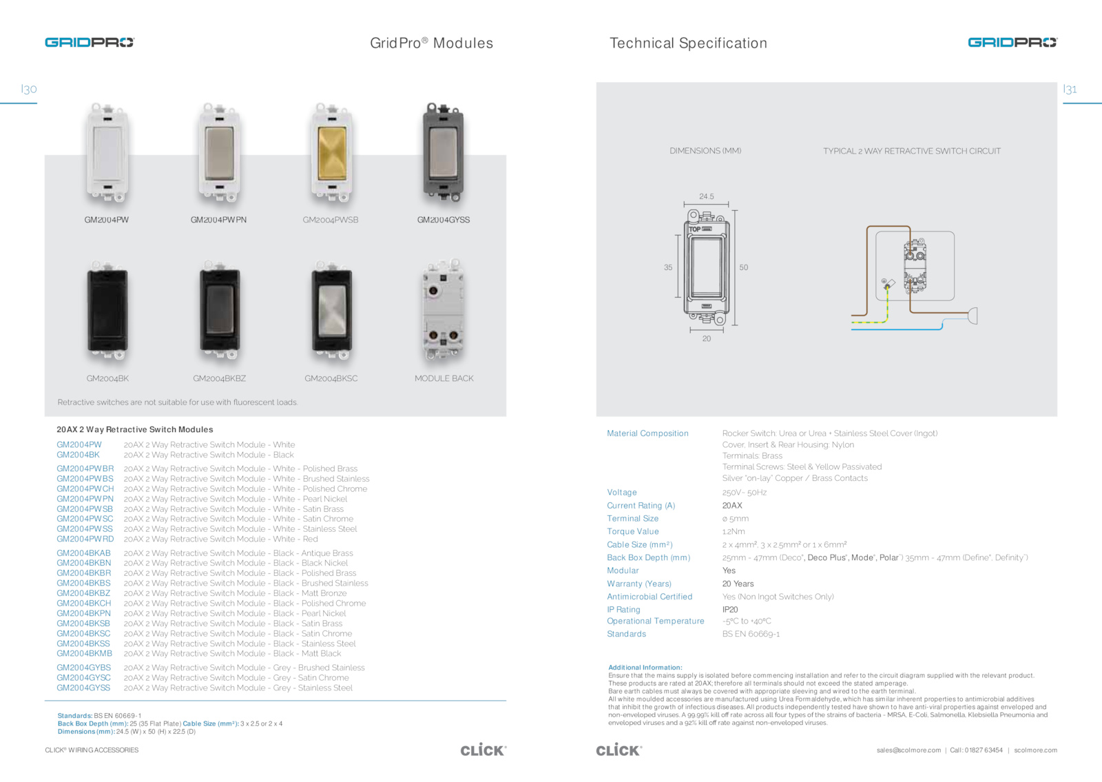 5 4 Dimensions (mm): 24.5 (W) (H) 22.5 (D) 20AX Way Retractive Switch Modules GM2004PW ̇̅Ó΄̇΄ÎåƼ΄ĎƖƂåāƖijƵĎ΄¢ƶijƖāĮ΄iŜĈƞʼnĎ΄Ͳ΄ÎĮijƖĎ GM2004BK ̇̅Ó΄̇΄ÎåƼ΄ĎƖƂåāƖijƵĎ΄¢ƶijƖāĮ΄iŜĈƞʼnĎ΄Ͳ΄ʼnåāņ GM2004PWBR ̇̅Ó΄̇΄ÎåƼ΄ĎƖƂåāƖijƵĎ΄¢ƶijƖāĮ΄iŜĈƞʼnĎ΄Ͳ΄ÎĮijƖĎ΄Ͳ΄ŜʼnijƊĮĎĈ΄ƂåƊƊ GM2004PWBS ̇̅Ó΄̇΄ÎåƼ΄ĎƖƂåāƖijƵĎ΄¢ƶijƖāĮ΄iŜĈƞʼnĎ΄Ͳ΄ÎĮijƖĎ΄Ͳ΄ƂƞƊĮĎĈ΄¢ƖåijœʼnĎƊƊ GM2004PWCH ̇̅Ó΄̇΄ÎåƼ΄ĎƖƂåāƖijƵĎ΄¢ƶijƖāĮ΄iŜĈƞʼnĎ΄Ͳ΄ÎĮijƖĎ΄Ͳ΄ŜʼnijƊĮĎĈ΄ĮƂŜőĎ GM2004PWPN ̇̅Ó΄̇΄ÎåƼ΄ĎƖƂåāƖijƵĎ΄¢ƶijƖāĮ΄iŜĈƞʼnĎ΄Ͳ΄ÎĮijƖĎ΄Ͳ΄ĎåƂʼn΄kijāņĎʼn GM2004PWSB ̇̅Ó΄̇΄ÎåƼ΄ĎƖƂåāƖijƵĎ΄¢ƶijƖāĮ΄iŜĈƞʼnĎ΄Ͳ΄ÎĮijƖĎ΄Ͳ΄¢åƖijœ΄ƂåƊƊ GM2004PWSC ̇̅Ó΄̇΄ÎåƼ΄ĎƖƂåāƖijƵĎ΄¢ƶijƖāĮ΄iŜĈƞʼnĎ΄Ͳ΄ÎĮijƖĎ΄Ͳ΄¢åƖijœ΄ĮƂŜőĎ GM2004PWSS ̇̅Ó΄̇΄ÎåƼ΄ĎƖƂåāƖijƵĎ΄¢ƶijƖāĮ΄iŜĈƞʼnĎ΄Ͳ΄ÎĮijƖĎ΄Ͳ΄¢ƖåijœʼnĎƊƊ΄¢ƖĎĎʼn GM2004PWRD ̇̅Ó΄̇΄ÎåƼ΄ĎƖƂåāƖijƵĎ΄¢ƶijƖāĮ΄iŜĈƞʼnĎ΄Ͳ΄ÎĮijƖĎ΄Ͳ΄ĎĈ Bi̇̅̅̉_Þ Bi̇̅̅̉_¢ GM2004BKAB ̇̅Ó΄̇΄ÎåƼ΄ĎƖƂåāƖijƵĎ΄¢ƶijƖāĮ΄iŜĈƞʼnĎ΄Ͳ΄ʼnåāņ΄Ͳ΄œƖijƁƞĎ΄ƂåƊƊ GM2004BKBN ̇̅Ó΄̇΄ÎåƼ΄ĎƖƂåāƖijƵĎ΄¢ƶijƖāĮ΄iŜĈƞʼnĎ΄Ͳ΄ʼnåāņ΄Ͳ΄ʼnåāņ΄kijāņĎʼn GM2004BKBR ̇̅Ó΄̇΄ÎåƼ΄ĎƖƂåāƖijƵĎ΄¢ƶijƖāĮ΄iŜĈƞʼnĎ΄Ͳ΄ʼnåāņ΄Ͳ΄ŜʼnijƊĮĎĈ΄ƂåƊƊ GM2004BKBS ̇̅Ó΄̇΄ÎåƼ΄ĎƖƂåāƖijƵĎ΄¢ƶijƖāĮ΄iŜĈƞʼnĎ΄Ͳ΄ʼnåāņ΄Ͳ΄ƂƞƊĮĎĈ΄¢ƖåijœʼnĎƊƊ GM2004BKBZ ̇̅Ó΄̇΄ÎåƼ΄ĎƖƂåāƖijƵĎ΄¢ƶijƖāĮ΄iŜĈƞʼnĎ΄Ͳ΄ʼnåāņ΄Ͳ΄iåƖƖ΄ƂŜœdžĎ GM2004BKCH ̇̅Ó΄̇΄ÎåƼ΄ĎƖƂåāƖijƵĎ΄¢ƶijƖāĮ΄iŜĈƞʼnĎ΄Ͳ΄ʼnåāņ΄Ͳ΄ŜʼnijƊĮĎĈ΄ĮƂŜőĎ GM2004BKPN ̇̅Ó΄̇΄ÎåƼ΄ĎƖƂåāƖijƵĎ΄¢ƶijƖāĮ΄iŜĈƞʼnĎ΄Ͳ΄ʼnåāņ΄Ͳ΄ĎåƂʼn΄kijāņĎʼn GM2004BKSB ̇̅Ó΄̇΄ÎåƼ΄ĎƖƂåāƖijƵĎ΄¢ƶijƖāĮ΄iŜĈƞʼnĎ΄Ͳ΄ʼnåāņ΄Ͳ΄¢åƖijœ΄ƂåƊƊ GM2004BKSC ̇̅Ó΄̇΄ÎåƼ΄ĎƖƂåāƖijƵĎ΄¢ƶijƖāĮ΄iŜĈƞʼnĎ΄Ͳ΄ʼnåāņ΄Ͳ΄¢åƖijœ΄ĮƂŜőĎ GM2004BKSS ̇̅Ó΄̇΄ÎåƼ΄ĎƖƂåāƖijƵĎ΄¢ƶijƖāĮ΄iŜĈƞʼnĎ΄Ͳ΄ʼnåāņ΄Ͳ΄¢ƖåijœʼnĎƊƊ΄¢ƖĎĎʼn GM2004BKMB ̇̅Ó΄̇΄ÎåƼ΄ĎƖƂåāƖijƵĎ΄¢ƶijƖāĮ΄iŜĈƞʼnĎ΄Ͳ΄ʼnåāņ΄Ͳ΄iåƖƖ΄ʼnåāņ GM2004GYBS ̇̅Ó΄̇΄ÎåƼ΄ĎƖƂåāƖijƵĎ΄¢ƶijƖāĮ΄iŜĈƞʼnĎ΄Ͳ΄BƂĎƼ΄Ͳ΄ƂƞƊĮĎĈ΄¢ƖåijœʼnĎƊƊ GM2004GYSC ̇̅Ó΄̇΄ÎåƼ΄ĎƖƂåāƖijƵĎ΄¢ƶijƖāĮ΄iŜĈƞʼnĎ΄Ͳ΄BƂĎƼ΄Ͳ΄¢åƖijœ΄ĮƂŜőĎ GM2004GYSS ̇̅Ó΄̇΄ÎåƼ΄ĎƖƂåāƖijƵĎ΄¢ƶijƖāĮ΄iŜĈƞʼnĎ΄Ͳ΄BƂĎƼ΄Ͳ΄¢ƖåijœʼnĎƊƊ΄¢ƖĎĎʼn it$¶a*΄_ Additional Information: Ensure that the mains supply isolated before commencing installation and refer the circuit diagram supplied with the relevant product. These products are rated 20AX; therefore all terminals should not exceed the stated amperage.sales@scolmore. Bare earth cables must always covered with appropriate sleeving and wired the earth terminal.5 35 20 50 Technical Specification GridPro® Modules ĎƖƂåāƖijƵĎ΄ƊƶijƖāĮĎƊ΄åƂĎ΄œŜƖ΄ƊƞijƖåĀʼnĎ΄ĦŜƂ΄ƞƊĎ΄ƶijƖĮ΄ǚƞŜƂĎƊāĎœƖ΄ʼnŜåĈƊ͟ Bi̇̅̅̉_ GM2004GYSS Bi̇̅̅̉΢ GM2004PWPN GM2004PW GYSS Bi ΢ GM PWPN GM PW Standards: 60669-1 Back Box Depth (mm): (35 Flat Plate) Cable Size (mm²): 2.com Call: 01827 63454 scolmore. All products independently tested have shown have anti-viral properties against enveloped and œŜœͲĎœƵĎʼnŜſĎĈ΄ƵijƂƞƊĎƊ͟΄΄̎̎̎̎͟μ΄ņijʼnʼn΄Ŝǖ΄ƂåƖĎ΄åāƂŜƊƊ΄åʼnʼn΄ĦŜƞƂ΄ƖƼſĎƊ΄ŜĦ΄ƖĮĎ΄ƊƖƂåijœƊ΄ŜĦ΄ĀåāƖĎƂijå΄Ͳ΄i¢͚΄*ͲŜʼnij͚΄¢åʼnőŜœĎʼnʼnå͚΄_ʼnĎĀƊijĎʼnʼnå΄œĎƞőŜœijå΄åœĈ΄ ĎœƵĎʼnŜſĎĈ΄ƵijƂƞƊĎƊ΄åœĈ΄å΄̎̇μ΄ņijʼnʼn΄Ŝǖ΄ƂåƖĎ΄åħåijœƊƖ΄œŜœͲĎœƵĎʼnŜſĎĈ΄ƵijƂƞƊĎƊ͟΄ . All white moulded accessories are manufactured using Urea Formaldehyde, which has similar inherent properties antimicrobial additives that inhibit the growth infectious diseases.com CLICK® WIRING ACCESSORIES N̈̆ N̈̅ Material Composition ŜāņĎƂ΄¢ƶijƖāĮ͙΄¶ƂĎå΄ŜƂ΄¶ƂĎå΄Τ΄¢ƖåijœʼnĎƊƊ΄¢ƖĎĎʼn΄ŜƵĎƂ΄ͬNœħŜƖͭ ŜƵĎƂ͚΄NœƊĎƂƖ΄π΄ĎåƂ΄IŜƞƊijœħ͙΄kƼʼnŜœ ¯ĎƂőijœåʼnƊ͙΄ƂåƊƊ΄ ¯ĎƂőijœåʼn΄¢āƂĎƶƊ͙΄¢ƖĎĎʼn΄π΄ÔĎʼnʼnŜƶ΄åƊƊijƵåƖĎĈ΄ ¢ijʼnƵĎƂ΄ͺŜœͲʼnåƼͻ΄ŜſſĎƂ΄ͥ΄ƂåƊƊ΄ŜœƖåāƖƊ Voltage ̇̊̅Íΰ΄̊̅Idž Current Rating (A) 20AX Terminal Size Ÿ΄̊őő Torque Value ̆̇͟kő Cable Size (mm²) ̇΄ƻ΄̉őő2 ͚΄̈΄ƻ΄̇̊͟őő2 ΄ŜƂ΄̆΄ƻ΄̋őő2 Back Box Depth (mm) ̇̊őő΄Ͳ΄̉̌őő΄ͬ$ĎāŜ® , Deco Plus® , Mode® , Polarυ ͭ΄̈̊őő΄Ͳ΄̉̌őő΄ͬ$ĎĦijœĎ® ͚΄$ĎĦijœijƖƼυ ͭ Modular Yes Warranty (Years) Years Antimicrobial Certified ÔĎƊ΄ͬkŜœ΄NœħŜƖ΄¢ƶijƖāĮĎƊ΄tœʼnƼͭ IP Rating IP20 Operational Temperature Ͳ̊o ΄ƖŜ΄Τ̉̅o Standards ¢΄*k΄̋̅̋̋̎Ͳ̆ ¯ÔNa΄̇΄ÎÔ΄*¯¯NÍ*΄¢ÎN¯I΄N¶N¯ $Ni*k¢Ntk¢΄ͬiiͭ 24