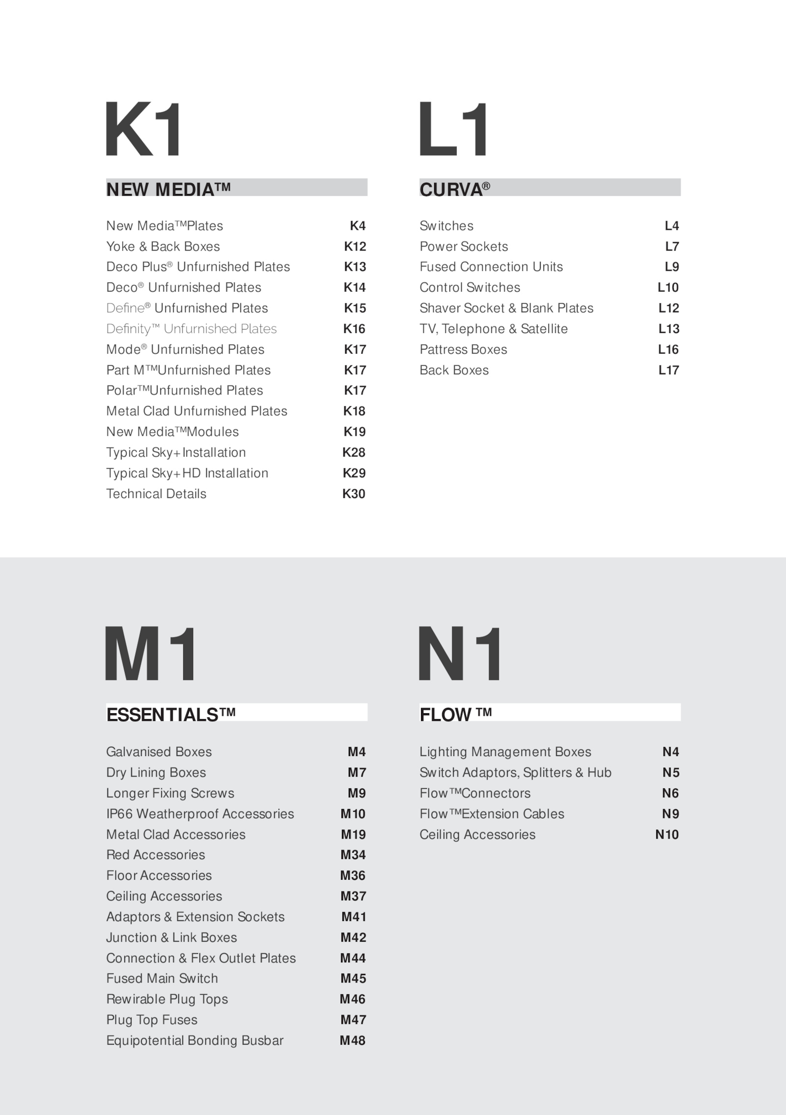 L1 N1 New Media™ Plates K4 Yoke Back Boxes K12 Deco Plus® Unfurnished Plates K13 Deco® Unfurnished Plates K14 $ĎǙœĎ® Unfurnished Plates K15 $ĎǙœijƖƼυ΄¶œĦƞƂœijƊĮĎĈ΄ʼnåƖĎƊ΄ K16 Mode® Unfurnished Plates K17 Part Unfurnished Plates K17 Polar™ Unfurnished Plates K17 Metal Clad Unfurnished Plates K18 New Media™ Modules K19 Typical Sky+ Installation K28 Typical Sky+ Installation K29 Technical Details K30 NEW MEDIA™ Switches L4 Power Sockets L7 Fused Connection Units L9 Control Switches L10 Shaver Socket Blank Plates L12 TV, Telephone Satellite L13 Pattress Boxes L16 Back Boxes L17 CURVA® Galvanised Boxes M4 Dry Lining Boxes M7 Longer Fixing Screws M9 IP66 Weatherproof Accessories M10 Metal Clad Accessories M19 Red Accessories M34 Floor Accessories M36 Ceiling Accessories M37 Adaptors Extension Sockets M41 Junction Link Boxes M42 Connection Flex Outlet Plates M44 Fused Main Switch M45 Rewirable Plug Tops M46 Plug Top Fuses M47 Equipotential Bonding Busbar M48 ESSENTIALS™ M1 Lighting Management Boxes N4 Switch Adaptors, Splitters Hub N5 Flow™ Connectors N6 Flow™ Extension Cables N9 Ceiling Accessories N10 FLOW™