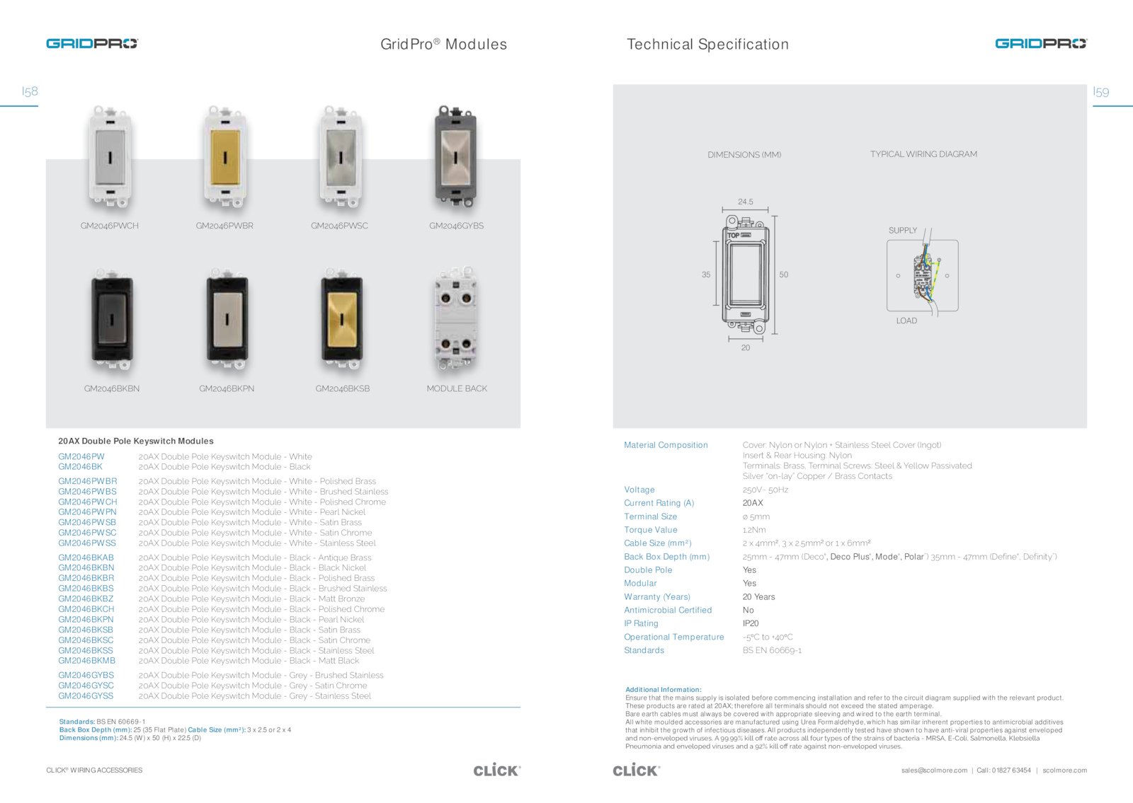 These products are rated 20AX; therefore all terminals should not exceed the stated amperage.com Call: 01827 63454 scolmore. All products independently tested have shown have anti-viral properties against enveloped åœĈ΄œŜœͲĎœƵĎʼnŜſĎĈ΄ƵijƂƞƊĎƊ͟΄΄̎̎̎̎͟μ΄ņijʼnʼn΄Ŝǖ΄ƂåƖĎ΄åāƂŜƊƊ΄åʼnʼn΄ĦŜƞƂ΄ƖƼſĎƊ΄ŜĦ΄ƖĮĎ΄ƊƖƂåijœƊ΄ŜĦ΄ĀåāƖĎƂijå΄Ͳ΄i¢͚΄*ͲŜʼnij͚΄¢åʼnőŜœĎʼnʼnå͚΄_ʼnĎĀƊijĎʼnʼnå΄ œĎƞőŜœijå΄åœĈ΄ĎœƵĎʼnŜſĎĈ΄ƵijƂƞƊĎƊ΄åœĈ΄å΄̎̇μ΄ņijʼnʼn΄Ŝǖ΄ƂåƖĎ΄åħåijœƊƖ΄œŜœͲĎœƵĎʼnŜſĎĈ΄ƵijƂƞƊĎƊ͟΄ Material Composition ŜƵĎƂ͙΄kƼʼnŜœ΄ŜƂ΄kƼʼnŜœ΄Τ΄¢ƖåijœʼnĎƊƊ΄¢ƖĎĎʼn΄ŜƵĎƂ΄ͬNœħŜƖͭ΄ NœƊĎƂƖ΄π΄ĎåƂ΄IŜƞƊijœħ͙΄kƼʼnŜœ ¯ĎƂőijœåʼnƊ͙΄ƂåƊƊ͚΄¯ĎƂőijœåʼn΄¢āƂĎƶƊ͙΄¢ƖĎĎʼn΄π΄ÔĎʼnʼnŜƶ΄åƊƊijƵåƖĎĈ ¢ijʼnƵĎƂ΄ͺŜœͲʼnåƼͻ΄ŜſſĎƂ΄ͥ΄ƂåƊƊ΄ŜœƖåāƖƊ΄ Voltage ̇̊̅Íΰ΄̊̅Idž Current Rating (A) 20AX Terminal Size Ÿ΄̊őő Torque Value ̆̇͟kő Cable Size (mm²) ̇΄ƻ΄̉őő2 ͚΄̈΄ƻ΄̇̊͟őő2 ΄ŜƂ΄̆΄ƻ΄̋őő2 Back Box Depth (mm) ̇̊őő΄Ͳ΄̉̌őő΄ͬ$ĎāŜ® , Deco Plus® , Mode® , Polarυ ͭ΄̈̊őő΄Ͳ΄̉̌őő΄ͬ$ĎĦijœĎ® ͚΄$ĎĦijœijƖƼυ ͭ Double Pole Yes Modular Yes Warranty (Years) Years Antimicrobial Certified No IP Rating IP20 Operational Temperature Ͳ̊o ΄ƖŜ΄Τ̉̅o Standards ¢΄*k΄̋̅̋̋̎Ͳ̆ Technical Specification GridPro® Modules Bi̇̅̉̋ÎI Bi̇̅̉̋Î Bi̇̅̉̋΢ Bi ̋΢ Bi ̋Î Bi ̋ÎI Standards: 60669-1 Back Box Depth (mm): (35 Flat Plate) Cable Size (mm²): 2.5 (W) (H) 22.5 35 20 50 . Bare earth cables must always covered with appropriate sleeving and wired the earth terminal.sales@scolmore.5 (D) 20AX Double Pole Keyswitch Modules GM2046PW ̇̅Ó΄$ŜƞĀʼnĎ΄ŜʼnĎ΄_ĎƼƊƶijƖāĮ΄iŜĈƞʼnĎ΄Ͳ΄ÎĮijƖĎ GM2046BK ̇̅Ó΄$ŜƞĀʼnĎ΄ŜʼnĎ΄_ĎƼƊƶijƖāĮ΄iŜĈƞʼnĎ΄Ͳ΄ʼnåāņ GM2046PWBR ̇̅Ó΄$ŜƞĀʼnĎ΄ŜʼnĎ΄_ĎƼƊƶijƖāĮ΄iŜĈƞʼnĎ΄Ͳ΄ÎĮijƖĎ΄Ͳ΄ŜʼnijƊĮĎĈ΄ƂåƊƊ GM2046PWBS ̇̅Ó΄$ŜƞĀʼnĎ΄ŜʼnĎ΄_ĎƼƊƶijƖāĮ΄iŜĈƞʼnĎ΄Ͳ΄ÎĮijƖĎ΄Ͳ΄ƂƞƊĮĎĈ΄¢ƖåijœʼnĎƊƊ GM2046PWCH ̇̅Ó΄$ŜƞĀʼnĎ΄ŜʼnĎ΄_ĎƼƊƶijƖāĮ΄iŜĈƞʼnĎ΄Ͳ΄ÎĮijƖĎ΄Ͳ΄ŜʼnijƊĮĎĈ΄ĮƂŜőĎ GM2046PWPN ̇̅Ó΄$ŜƞĀʼnĎ΄ŜʼnĎ΄_ĎƼƊƶijƖāĮ΄iŜĈƞʼnĎ΄Ͳ΄ÎĮijƖĎ΄Ͳ΄ĎåƂʼn΄kijāņĎʼn GM2046PWSB ̇̅Ó΄$ŜƞĀʼnĎ΄ŜʼnĎ΄_ĎƼƊƶijƖāĮ΄iŜĈƞʼnĎ΄Ͳ΄ÎĮijƖĎ΄Ͳ΄¢åƖijœ΄ƂåƊƊ GM2046PWSC ̇̅Ó΄$ŜƞĀʼnĎ΄ŜʼnĎ΄_ĎƼƊƶijƖāĮ΄iŜĈƞʼnĎ΄Ͳ΄ÎĮijƖĎ΄Ͳ΄¢åƖijœ΄ĮƂŜőĎ GM2046PWSS ̇̅Ó΄$ŜƞĀʼnĎ΄ŜʼnĎ΄_ĎƼƊƶijƖāĮ΄iŜĈƞʼnĎ΄Ͳ΄ÎĮijƖĎ΄Ͳ΄¢ƖåijœʼnĎƊƊ΄¢ƖĎĎʼn Bi̇̅̉̋_k Bi̇̅̉̋_k Bi̇̅̉̋_¢ GM2046BKAB ̇̅Ó΄$ŜƞĀʼnĎ΄ŜʼnĎ΄_ĎƼƊƶijƖāĮ΄iŜĈƞʼnĎ΄Ͳ΄ʼnåāņ΄Ͳ΄œƖijƁƞĎ΄ƂåƊƊ GM2046BKBN ̇̅Ó΄$ŜƞĀʼnĎ΄ŜʼnĎ΄_ĎƼƊƶijƖāĮ΄iŜĈƞʼnĎ΄Ͳ΄ʼnåāņ΄Ͳ΄ʼnåāņ΄kijāņĎʼn GM2046BKBR ̇̅Ó΄$ŜƞĀʼnĎ΄ŜʼnĎ΄_ĎƼƊƶijƖāĮ΄iŜĈƞʼnĎ΄Ͳ΄ʼnåāņ΄Ͳ΄ŜʼnijƊĮĎĈ΄ƂåƊƊ GM2046BKBS ̇̅Ó΄$ŜƞĀʼnĎ΄ŜʼnĎ΄_ĎƼƊƶijƖāĮ΄iŜĈƞʼnĎ΄Ͳ΄ʼnåāņ΄Ͳ΄ƂƞƊĮĎĈ΄¢ƖåijœʼnĎƊƊ GM2046BKBZ ̇̅Ó΄$ŜƞĀʼnĎ΄ŜʼnĎ΄_ĎƼƊƶijƖāĮ΄iŜĈƞʼnĎ΄Ͳ΄ʼnåāņ΄Ͳ΄iåƖƖ΄ƂŜœdžĎ GM2046BKCH ̇̅Ó΄$ŜƞĀʼnĎ΄ŜʼnĎ΄_ĎƼƊƶijƖāĮ΄iŜĈƞʼnĎ΄Ͳ΄ʼnåāņ΄Ͳ΄ŜʼnijƊĮĎĈ΄ĮƂŜőĎ GM2046BKPN ̇̅Ó΄$ŜƞĀʼnĎ΄ŜʼnĎ΄_ĎƼƊƶijƖāĮ΄iŜĈƞʼnĎ΄Ͳ΄ʼnåāņ΄Ͳ΄ĎåƂʼn΄kijāņĎʼn GM2046BKSB ̇̅Ó΄$ŜƞĀʼnĎ΄ŜʼnĎ΄_ĎƼƊƶijƖāĮ΄iŜĈƞʼnĎ΄Ͳ΄ʼnåāņ΄Ͳ΄¢åƖijœ΄ƂåƊƊ GM2046BKSC ̇̅Ó΄$ŜƞĀʼnĎ΄ŜʼnĎ΄_ĎƼƊƶijƖāĮ΄iŜĈƞʼnĎ΄Ͳ΄ʼnåāņ΄Ͳ΄¢åƖijœ΄ĮƂŜőĎ GM2046BKSS ̇̅Ó΄$ŜƞĀʼnĎ΄ŜʼnĎ΄_ĎƼƊƶijƖāĮ΄iŜĈƞʼnĎ΄Ͳ΄ʼnåāņ΄Ͳ΄¢ƖåijœʼnĎƊƊ΄¢ƖĎĎʼn GM2046BKMB ̇̅Ó΄$ŜƞĀʼnĎ΄ŜʼnĎ΄_ĎƼƊƶijƖāĮ΄iŜĈƞʼnĎ΄Ͳ΄ʼnåāņ΄Ͳ΄iåƖƖ΄ʼnåāņ GM2046GYBS ̇̅Ó΄$ŜƞĀʼnĎ΄ŜʼnĎ΄_ĎƼƊƶijƖāĮ΄iŜĈƞʼnĎ΄Ͳ΄BƂĎƼ΄Ͳ΄ƂƞƊĮĎĈ΄¢ƖåijœʼnĎƊƊ GM2046GYSC ̇̅Ó΄$ŜƞĀʼnĎ΄ŜʼnĎ΄_ĎƼƊƶijƖāĮ΄iŜĈƞʼnĎ΄Ͳ΄BƂĎƼ΄Ͳ΄¢åƖijœ΄ĮƂŜőĎ GM2046GYSS ̇̅Ó΄$ŜƞĀʼnĎ΄ŜʼnĎ΄_ĎƼƊƶijƖāĮ΄iŜĈƞʼnĎ΄Ͳ΄BƂĎƼ΄Ͳ΄¢ƖåijœʼnĎƊƊ΄¢ƖĎĎʼn it$¶a*΄_ Bi̇̅̉̋BÔ¢ Bi ̋BÔ¢ it$¶a* _ ¯ÔNa΄ÎNNkB΄$NBi LOAD SUPPLY $Ni*k¢Ntk¢΄ͬiiͭ 24.5 4 Dimensions (mm): 24.com CLICK® WIRING ACCESSORIES N̊̎ N̊̍ Additional Information: Ensure that the mains supply isolated before commencing installation and refer the circuit diagram supplied with the relevant product. All white moulded accessories are manufactured using Urea Formaldehyde, which has similar inherent properties antimicrobial additives that inhibit the growth infectious diseases