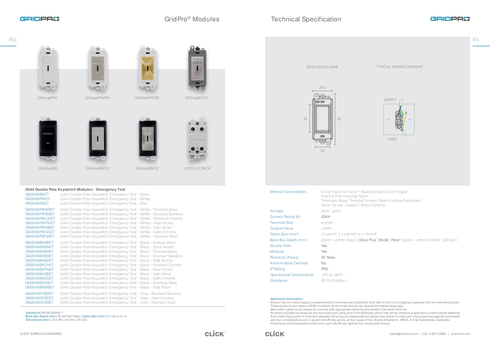 com CLICK® WIRING ACCESSORIES N̋̆ N̋̅ GridPro® Modules Standards: 60669-1 Back Box Depth (mm): (35 Flat Plate) Cable Size (mm²): 2. All white moulded accessories are manufactured using Urea Formaldehyde, which has similar inherent properties antimicrobial additives that inhibit the growth infectious diseases.5 (D) 20AX Double Pole Keyswitch Modules 'Emergency Test' GM2046BKET ̇̅Ó΄$ŜƞĀʼnĎ΄ŜʼnĎ΄_ĎƼƊƶijƖāĮ΄ͣ*őĎƂħĎœāƼ΄¯ĎƊƖͣ΄Ͳ΄ʼnåāņ GM2046PWET ̇̅Ó΄$ŜƞĀʼnĎ΄ŜʼnĎ΄_ĎƼƊƶijƖāĮ΄ͣ*őĎƂħĎœāƼ΄¯ĎƊƖͣ΄Ͳ΄ÎĮijƖĎ GM2046RDET ̇̅Ó΄$ŜƞĀʼnĎ΄ŜʼnĎ΄_ĎƼƊƶijƖāĮ΄ͣ*őĎƂħĎœāƼ΄¯ĎƊƖͣ΄Ͳ΄ĎĈ GM2046PWBRET ̇̅Ó΄$ŜƞĀʼnĎ΄ŜʼnĎ΄_ĎƼƊƶijƖāĮ΄ͣ*őĎƂħĎœāƼ΄¯ĎƊƖͣ΄Ͳ΄ÎĮijƖĎ΄Ͳ΄ŜʼnijƊĮĎĈ΄ƂåƊƊ GM2046PWBSET ̇̅Ó΄$ŜƞĀʼnĎ΄ŜʼnĎ΄_ĎƼƊƶijƖāĮ΄ͣ*őĎƂħĎœāƼ΄¯ĎƊƖͣ΄Ͳ΄ÎĮijƖĎ΄Ͳ΄ƂƞƊĮĎĈ΄¢ƖåijœʼnĎƊƊ GM2046PWCHET ̇̅Ó΄$ŜƞĀʼnĎ΄ŜʼnĎ΄_ĎƼƊƶijƖāĮ΄ͣ*őĎƂħĎœāƼ΄¯ĎƊƖͣ΄Ͳ΄ÎĮijƖĎ΄Ͳ΄ŜʼnijƊĮĎĈ΄ĮƂŜőĎ GM2046PWPNET ̇̅Ó΄$ŜƞĀʼnĎ΄ŜʼnĎ΄_ĎƼƊƶijƖāĮ΄ͣ*őĎƂħĎœāƼ΄¯ĎƊƖͣ΄Ͳ΄ÎĮijƖĎ΄Ͳ΄ĎåƂʼn΄kijāņĎʼn GM2046PWSBET ̇̅Ó΄$ŜƞĀʼnĎ΄ŜʼnĎ΄_ĎƼƊƶijƖāĮ΄ͣ*őĎƂħĎœāƼ΄¯ĎƊƖͣ΄Ͳ΄ÎĮijƖĎ΄Ͳ΄¢åƖijœ΄ƂåƊƊ GM2046PWSCET ̇̅Ó΄$ŜƞĀʼnĎ΄ŜʼnĎ΄_ĎƼƊƶijƖāĮ΄ͣ*őĎƂħĎœāƼ΄¯ĎƊƖͣ΄Ͳ΄ÎĮijƖĎ΄Ͳ΄¢åƖijœ΄ĮƂŜőĎ GM2046PWSSET ̇̅Ó΄$ŜƞĀʼnĎ΄ŜʼnĎ΄_ĎƼƊƶijƖāĮ΄ͣ*őĎƂħĎœāƼ΄¯ĎƊƖͣ΄Ͳ΄ÎĮijƖĎ΄Ͳ΄¢ƖåijœʼnĎƊƊ΄¢ƖĎĎʼn GM2046BKABET ̇̅Ó΄$ŜƞĀʼnĎ΄ŜʼnĎ΄_ĎƼƊƶijƖāĮ΄ͣ*őĎƂħĎœāƼ΄¯ĎƊƖͣ΄Ͳ΄ʼnåāņ΄Ͳ΄œƖijƁƞĎ΄ƂåƊƊ GM2046BKBNET ̇̅Ó΄$ŜƞĀʼnĎ΄ŜʼnĎ΄_ĎƼƊƶijƖāĮ΄ͣ*őĎƂħĎœāƼ΄¯ĎƊƖͣ΄Ͳ΄ʼnåāņ΄Ͳ΄ʼnåāņ΄kijāņĎʼn GM2046BKBRET ̇̅Ó΄$ŜƞĀʼnĎ΄ŜʼnĎ΄_ĎƼƊƶijƖāĮ΄ͣ*őĎƂħĎœāƼ΄¯ĎƊƖͣ΄Ͳ΄ʼnåāņ΄Ͳ΄ŜʼnijƊĮĎĈ΄ƂåƊƊ GM2046BKBSET ̇̅Ó΄$ŜƞĀʼnĎ΄ŜʼnĎ΄_ĎƼƊƶijƖāĮ΄ͣ*őĎƂħĎœāƼ΄¯ĎƊƖͣ΄Ͳ΄ʼnåāņ΄Ͳ΄ƂƞƊĮĎĈ΄¢ƖåijœʼnĎƊƊ GM2046BKBZET ̇̅Ó΄$ŜƞĀʼnĎ΄ŜʼnĎ΄_ĎƼƊƶijƖāĮ΄ͣ*őĎƂħĎœāƼ΄¯ĎƊƖͣ΄Ͳ΄ʼnåāņ΄Ͳ΄iåƖƖ΄ƂŜœdžĎ GM2046BKCHET ̇̅Ó΄$ŜƞĀʼnĎ΄ŜʼnĎ΄_ĎƼƊƶijƖāĮ΄ͣ*őĎƂħĎœāƼ΄¯ĎƊƖͣ΄Ͳ΄ʼnåāņ΄Ͳ΄ŜʼnijƊĮĎĈ΄ĮƂŜőĎ GM2046BKPNET ̇̅Ó΄$ŜƞĀʼnĎ΄ŜʼnĎ΄_ĎƼƊƶijƖāĮ΄ͣ*őĎƂħĎœāƼ΄¯ĎƊƖͣ΄Ͳ΄ʼnåāņ΄Ͳ΄ĎåƂʼn΄kijāņĎʼn GM2046BKSBET ̇̅Ó΄$ŜƞĀʼnĎ΄ŜʼnĎ΄_ĎƼƊƶijƖāĮ΄ͣ*őĎƂħĎœāƼ΄¯ĎƊƖͣ΄Ͳ΄ʼnåāņ΄Ͳ΄¢åƖijœ΄ƂåƊƊ GM2046BKSCET ̇̅Ó΄$ŜƞĀʼnĎ΄ŜʼnĎ΄_ĎƼƊƶijƖāĮ΄ͣ*őĎƂħĎœāƼ΄¯ĎƊƖͣ΄Ͳ΄ʼnåāņ΄Ͳ΄¢åƖijœ΄ĮƂŜőĎ GM2046BKSSET ̇̅Ó΄$ŜƞĀʼnĎ΄ŜʼnĎ΄_ĎƼƊƶijƖāĮ΄ͣ*őĎƂħĎœāƼ΄¯ĎƊƖͣ΄Ͳ΄ʼnåāņ΄Ͳ΄¢ƖåijœʼnĎƊƊ΄¢ƖĎĎʼn GM2046BKMBET ̇̅Ó΄$ŜƞĀʼnĎ΄ŜʼnĎ΄_ĎƼƊƶijƖāĮ΄ͣ*őĎƂħĎœāƼ΄¯ĎƊƖͣ΄Ͳ΄ʼnåāņ΄Ͳ΄iåƖƖ΄ʼnåāņ GM2046GYBSET ̇̅Ó΄$ŜƞĀʼnĎ΄ŜʼnĎ΄_ĎƼƊƶijƖāĮ΄ͣ*őĎƂħĎœāƼ΄¯ĎƊƖͣ΄Ͳ΄BƂĎƼ΄Ͳ΄ƂƞƊĮĎĈ΄¢ƖåijœʼnĎƊƊ GM2046GYSCET ̇̅Ó΄$ŜƞĀʼnĎ΄ŜʼnĎ΄_ĎƼƊƶijƖāĮ΄ͣ*őĎƂħĎœāƼ΄¯ĎƊƖͣ΄Ͳ΄BƂĎƼ΄Ͳ΄¢åƖijœ΄ĮƂŜőĎ GM2046GYSSET ̇̅Ó΄$ŜƞĀʼnĎ΄ŜʼnĎ΄_ĎƼƊƶijƖāĮ΄ͣ*őĎƂħĎœāƼ΄¯ĎƊƖͣ΄Ͳ΄BƂĎƼ΄Ͳ΄¢ƖåijœʼnĎƊƊ΄¢ƖĎĎʼn Bi̇̅̉̋BÔ¢¢ Bi̇̅̉̋΢ Bi̇̅̉̋Îk Bi̇̅̉̋Î Bi̇̅̉̋_ Bi̇̅̉̋_I Bi̇̅̉̋_¢ it$¶a*΄_ it$¶a* _ Additional Information: Ensure that the mains supply isolated before commencing installation and refer the circuit diagram supplied with the relevant product. All products independently tested have shown have anti-viral properties against enveloped åœĈ΄œŜœͲĎœƵĎʼnŜſĎĈ΄ƵijƂƞƊĎƊ͟΄΄̎̎̎̎͟μ΄ņijʼnʼn΄Ŝǖ΄ƂåƖĎ΄åāƂŜƊƊ΄åʼnʼn΄ĦŜƞƂ΄ƖƼſĎƊ΄ŜĦ΄ƖĮĎ΄ƊƖƂåijœƊ΄ŜĦ΄ĀåāƖĎƂijå΄Ͳ΄i¢͚΄*ͲŜʼnij͚΄¢åʼnőŜœĎʼnʼnå͚΄_ʼnĎĀƊijĎʼnʼnå΄ œĎƞőŜœijå΄åœĈ΄ĎœƵĎʼnŜſĎĈ΄ƵijƂƞƊĎƊ΄åœĈ΄å΄̎̇μ΄ņijʼnʼn΄Ŝǖ΄ƂåƖĎ΄åħåijœƊƖ΄œŜœͲĎœƵĎʼnŜſĎĈ΄ƵijƂƞƊĎƊ͟΄ Material Composition ŜƵĎƂ͙΄kƼʼnŜœ΄ŜƂ΄kƼʼnŜœ΄Τ΄¢ƖåijœʼnĎƊƊ΄¢ƖĎĎʼn΄ŜƵĎƂ΄ͬNœħŜƖͭ΄ NœƊĎƂƖ΄π΄ĎåƂ΄IŜƞƊijœħ͙΄kƼʼnŜœ ¯ĎƂőijœåʼnƊ͙΄ƂåƊƊ͚΄¯ĎƂőijœåʼn΄¢āƂĎƶƊ͙΄¢ƖĎĎʼn΄π΄ÔĎʼnʼnŜƶ΄åƊƊijƵåƖĎĈ ¢ijʼnƵĎƂ΄ͺŜœͲʼnåƼͻ΄ŜſſĎƂ΄ͥ΄ƂåƊƊ΄ŜœƖåāƖƊ΄ Voltage ̇̊̅Íΰ΄̊̅Idž Current Rating (A) 20AX Terminal Size Ÿ΄̊őő Torque Value ̆̇͟kő Cable Size (mm²) ̇΄ƻ΄̉őő2 ͚΄̈΄ƻ΄̇̊͟őő2 ΄ŜƂ΄̆΄ƻ΄̋őő2 Back Box Depth (mm) ̇̊őő΄Ͳ΄̉̌őő΄ͬ$ĎāŜ® , Deco Plus® , Mode® , Polarυ ͭ΄̈̊őő΄Ͳ΄̉̌őő΄ͬ$ĎĦijœĎ® ͚΄$ĎĦijœijƖƼυ ͭ Double Pole Yes Modular Yes Warranty (Years) Years Antimicrobial Certified No IP Rating IP20 Operational Temperature Ͳ̊o ΄ƖŜ΄Τ̉̅o Standards ¢΄*k΄̋̅̋̋̎Ͳ̆ Technical Specification ¯ÔNa΄ÎNNkB΄$NBi LOAD SUPPLY $Ni*k¢Ntk¢΄ͬiiͭ 24.sales@scolmore. Bare earth cables must always covered with appropriate sleeving and wired the earth terminal. These products are rated 20AX; therefore all terminals should not exceed the stated amperage.5 35 20 50 Bi ̋Î EMERGENCY TEST Bi ̋Îk EMERGENCY TEST Bi ̋΢ EMERGENCY TEST EMERGENCY TEST EMERGENCY TEST EMERGENCY TEST .5 (W) (H) 22.com Call: 01827 63454 scolmore.5 4 Dimensions (mm): 24