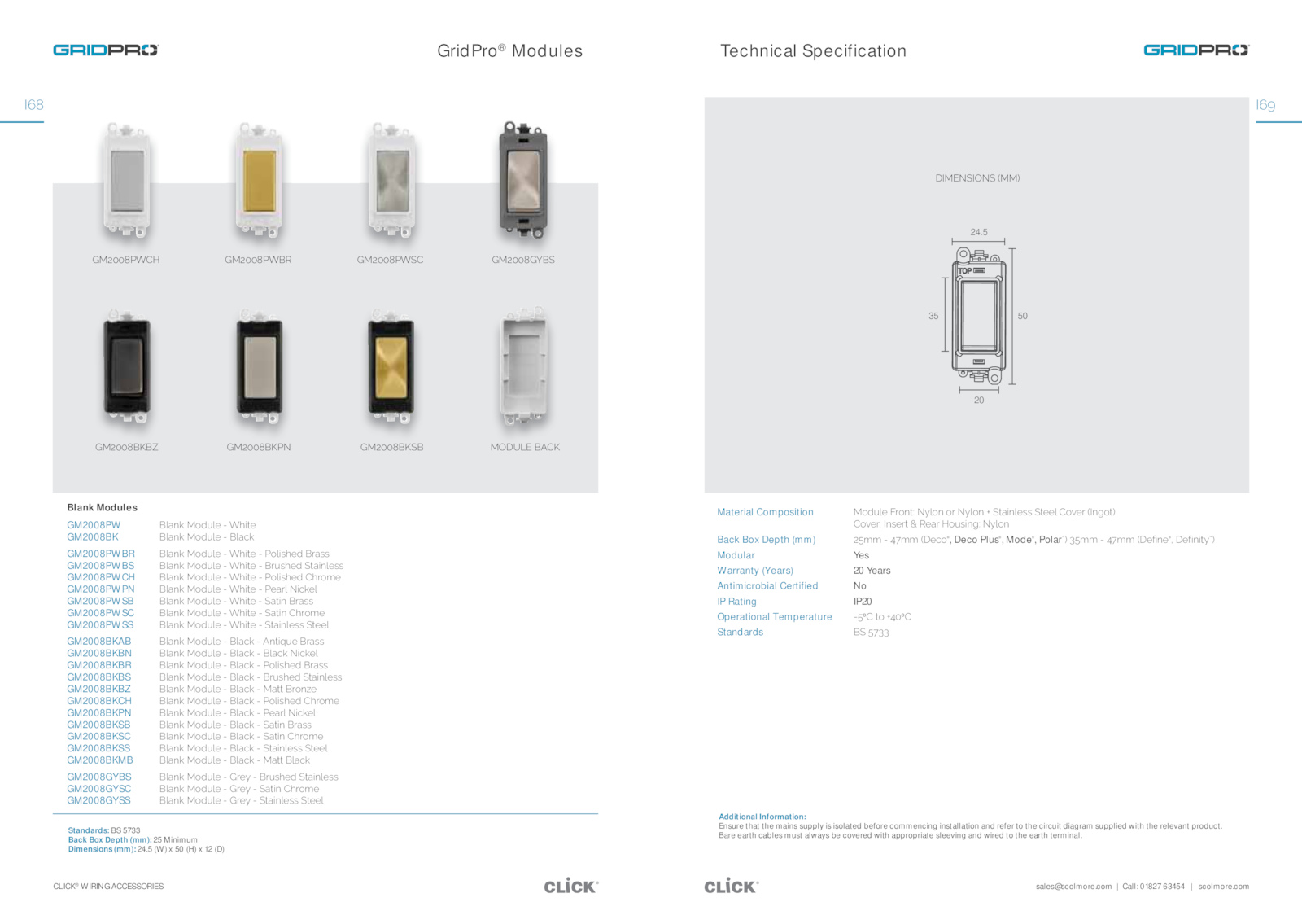 5 35 20 50 .com CLICK® WIRING ACCESSORIES N̋̎ N̋̍ Additional Information: Ensure that the mains supply isolated before commencing installation and refer the circuit diagram supplied with the relevant product.sales@scolmore.5 (W) (H) (D) Blank Modules GM2008PW ʼnåœņ΄iŜĈƞʼnĎ΄Ͳ΄ÎĮijƖĎ GM2008BK ʼnåœņ΄iŜĈƞʼnĎ΄Ͳ΄ʼnåāņ GM2008PWBR ʼnåœņ΄iŜĈƞʼnĎ΄Ͳ΄ÎĮijƖĎ΄Ͳ΄ŜʼnijƊĮĎĈ΄ƂåƊƊ GM2008PWBS ʼnåœņ΄iŜĈƞʼnĎ΄Ͳ΄ÎĮijƖĎ΄Ͳ΄ƂƞƊĮĎĈ΄¢ƖåijœʼnĎƊƊ GM2008PWCH ʼnåœņ΄iŜĈƞʼnĎ΄Ͳ΄ÎĮijƖĎ΄Ͳ΄ŜʼnijƊĮĎĈ΄ĮƂŜőĎ GM2008PWPN ʼnåœņ΄iŜĈƞʼnĎ΄Ͳ΄ÎĮijƖĎ΄Ͳ΄ĎåƂʼn΄kijāņĎʼn GM2008PWSB ʼnåœņ΄iŜĈƞʼnĎ΄Ͳ΄ÎĮijƖĎ΄Ͳ΄¢åƖijœ΄ƂåƊƊ GM2008PWSC ʼnåœņ΄iŜĈƞʼnĎ΄Ͳ΄ÎĮijƖĎ΄Ͳ΄¢åƖijœ΄ĮƂŜőĎ GM2008PWSS ʼnåœņ΄iŜĈƞʼnĎ΄Ͳ΄ÎĮijƖĎ΄Ͳ΄¢ƖåijœʼnĎƊƊ΄¢ƖĎĎʼn Bi̇̅̅̍_Þ Bi̇̅̅̍_k Bi̇̅̅̍_¢ GM2008BKAB ʼnåœņ΄iŜĈƞʼnĎ΄Ͳ΄ʼnåāņ΄Ͳ΄œƖijƁƞĎ΄ƂåƊƊ GM2008BKBN ʼnåœņ΄iŜĈƞʼnĎ΄Ͳ΄ʼnåāņ΄Ͳ΄ʼnåāņ΄kijāņĎʼn GM2008BKBR ʼnåœņ΄iŜĈƞʼnĎ΄Ͳ΄ʼnåāņ΄Ͳ΄ŜʼnijƊĮĎĈ΄ƂåƊƊ GM2008BKBS ʼnåœņ΄iŜĈƞʼnĎ΄Ͳ΄ʼnåāņ΄Ͳ΄ƂƞƊĮĎĈ΄¢ƖåijœʼnĎƊƊ GM2008BKBZ ʼnåœņ΄iŜĈƞʼnĎ΄Ͳ΄ʼnåāņ΄Ͳ΄iåƖƖ΄ƂŜœdžĎ GM2008BKCH ʼnåœņ΄iŜĈƞʼnĎ΄Ͳ΄ʼnåāņ΄Ͳ΄ŜʼnijƊĮĎĈ΄ĮƂŜőĎ GM2008BKPN ʼnåœņ΄iŜĈƞʼnĎ΄Ͳ΄ʼnåāņ΄Ͳ΄ĎåƂʼn΄kijāņĎʼn GM2008BKSB ʼnåœņ΄iŜĈƞʼnĎ΄Ͳ΄ʼnåāņ΄Ͳ΄¢åƖijœ΄ƂåƊƊ GM2008BKSC ʼnåœņ΄iŜĈƞʼnĎ΄Ͳ΄ʼnåāņ΄Ͳ΄¢åƖijœ΄ĮƂŜőĎ GM2008BKSS ʼnåœņ΄iŜĈƞʼnĎ΄Ͳ΄ʼnåāņ΄Ͳ΄¢ƖåijœʼnĎƊƊ΄¢ƖĎĎʼn GM2008BKMB ʼnåœņ΄iŜĈƞʼnĎ΄Ͳ΄ʼnåāņ΄Ͳ΄iåƖƖ΄ʼnåāņ GM2008GYBS ʼnåœņ΄iŜĈƞʼnĎ΄Ͳ΄BƂĎƼ΄Ͳ΄ƂƞƊĮĎĈ΄¢ƖåijœʼnĎƊƊ GM2008GYSC ʼnåœņ΄iŜĈƞʼnĎ΄Ͳ΄BƂĎƼ΄Ͳ΄¢åƖijœ΄ĮƂŜőĎ GM2008GYSS ʼnåœņ΄iŜĈƞʼnĎ΄Ͳ΄BƂĎƼ΄Ͳ΄¢ƖåijœʼnĎƊƊ΄¢ƖĎĎʼn $Ni*k¢Ntk¢΄ͬiiͭ 24. Material Composition iŜĈƞʼnĎ΄AƂŜœƖ͙΄kƼʼnŜœ΄ŜƂ΄kƼʼnŜœ΄Τ΄¢ƖåijœʼnĎƊƊ΄¢ƖĎĎʼn΄ŜƵĎƂ΄ͬNœħŜƖͭ ŜƵĎƂ͚΄NœƊĎƂƖ΄π΄ĎåƂ΄IŜƞƊijœħ͙΄kƼʼnŜœ Back Box Depth (mm) ̇̊őő΄Ͳ΄̉̌őő΄ͬ$ĎāŜ® , Deco Plus® , Mode® , Polarυ ͭ΄̈̊őő΄Ͳ΄̉̌őő΄ͬ$ĎĦijœĎ® ͚΄$ĎĦijœijƖƼυ ͭ Modular Yes Warranty (Years) Years Antimicrobial Certified No IP Rating IP20 Operational Temperature Ͳ̊o ΄ƖŜ΄Τ̉̅o Standards ¢΄̊̌̈̈ Technical Specification GridPro® Modules it$¶a*΄_ Bi̇̅̅̍Î Bi̇̅̅̍΢ Bi̇̅̅̍BÔ¢ Bi̇̅̅̍ÎI ̍BÔ¢ Standards: 5733 Back Box Depth (mm): Minimum Dimensions (mm): 24.com Call: 01827 63454 scolmore. Bare earth cables must always covered with appropriate sleeving and wired the earth terminal