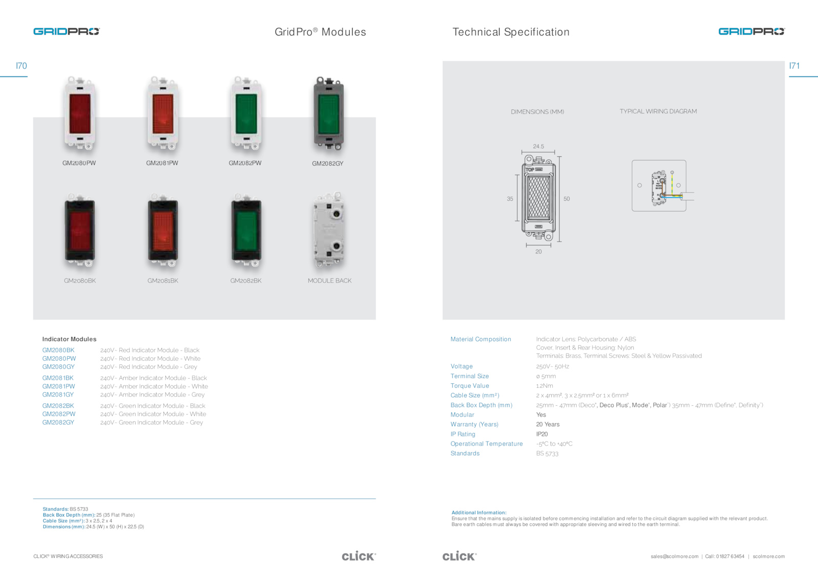 com CLICK® WIRING ACCESSORIES I71 I70 Additional Information: Ensure that the mains supply isolated before commencing installation and refer the circuit diagram supplied with the relevant product.5, 4 Dimensions (mm): 24. Material Composition NœĈijāåƖŜƂ΄aĎœƊ͙΄ŜʼnƼāåƂĀŜœåƖĎ΄ͥ΄¢ ŜƵĎƂ͚΄NœƊĎƂƖ΄π΄ĎåƂ΄IŜƞƊijœħ͙΄kƼʼnŜœ ¯ĎƂőijœåʼnƊ͙΄ƂåƊƊ͚΄¯ĎƂőijœåʼn΄¢āƂĎƶƊ͙΄¢ƖĎĎʼn΄π΄ÔĎʼnʼnŜƶ΄åƊƊijƵåƖĎĈ΄΄ Voltage ̇̊̅Íΰ΄̊̅Idž Terminal Size Ÿ΄̊őő Torque Value ̆̇͟kő Cable Size (mm²) ̇΄ƻ΄̉őő2 ͚΄̈΄ƻ΄̇̊͟őő2 ΄ŜƂ΄̆΄ƻ΄̋őő2 Back Box Depth (mm) ̇̊őő΄Ͳ΄̉̌őő΄ͬ$ĎāŜ® , Deco Plus® , Mode® , Polarυ ͭ΄̈̊őő΄Ͳ΄̉̌őő΄ͬ$ĎĦijœĎ® ͚΄$ĎĦijœijƖƼυ ͭ Modular Yes Warranty (Years) Years IP Rating IP20 Operational Temperature Ͳ̊o ΄ƖŜ΄Τ̉̅o Standards ¢΄̊̌̈̈ 24.5 (D) Indicator Modules GM2080BK ̇̉̅Íΰ΄ĎĈ΄NœĈijāåƖŜƂ΄iŜĈƞʼnĎ΄Ͳ΄ʼnåāņ GM2080PW ̇̉̅Íΰ΄ĎĈ΄NœĈijāåƖŜƂ΄iŜĈƞʼnĎ΄Ͳ΄ÎĮijƖĎ GM2080GY ̇̉̅Íΰ΄ĎĈ΄NœĈijāåƖŜƂ΄iŜĈƞʼnĎ΄Ͳ΄BƂĎƼ GM2081BK ̇̉̅Íΰ΄őĀĎƂ΄NœĈijāåƖŜƂ΄iŜĈƞʼnĎ΄Ͳ΄ʼnåāņ GM2081PW ̇̉̅Íΰ΄őĀĎƂ΄NœĈijāåƖŜƂ΄iŜĈƞʼnĎ΄Ͳ΄ÎĮijƖĎ GM2081GY ̇̉̅Íΰ΄őĀĎƂ΄NœĈijāåƖŜƂ΄iŜĈƞʼnĎ΄Ͳ΄BƂĎƼ GM2082BK ̇̉̅Íΰ΄BƂĎĎœ΄NœĈijāåƖŜƂ΄iŜĈƞʼnĎ΄Ͳ΄ʼnåāņ GM2082PW ̇̉̅Íΰ΄BƂĎĎœ΄NœĈijāåƖŜƂ΄iŜĈƞʼnĎ΄Ͳ΄ÎĮijƖĎ GM2082GY ̇̉̅Íΰ΄BƂĎĎœ΄NœĈijāåƖŜƂ΄iŜĈƞʼnĎ΄Ͳ΄BƂĎƼ Bi̇̅̍̇_ it$¶a* _ GM2082GY GM GY ¯ÔNa΄ÎNNkB΄$NBi $Ni*k¢Ntk¢΄ͬiiͭ .5 (W) (H) 22.com Call: 01827 63454 scolmore.5 35 20 50 Technical Specification GridPro® Modules it$¶a*΄_ Bi̇̅̍̅_ Bi̇̅̍̆_ GM2082PW GM2081PW GM2080PW PW GM PW GM PW Standards: 5733 Back Box Depth (mm): (35 Flat Plate) Cable Size (mm²): 2.sales@scolmore. Bare earth cables must always covered with appropriate sleeving and wired the earth terminal