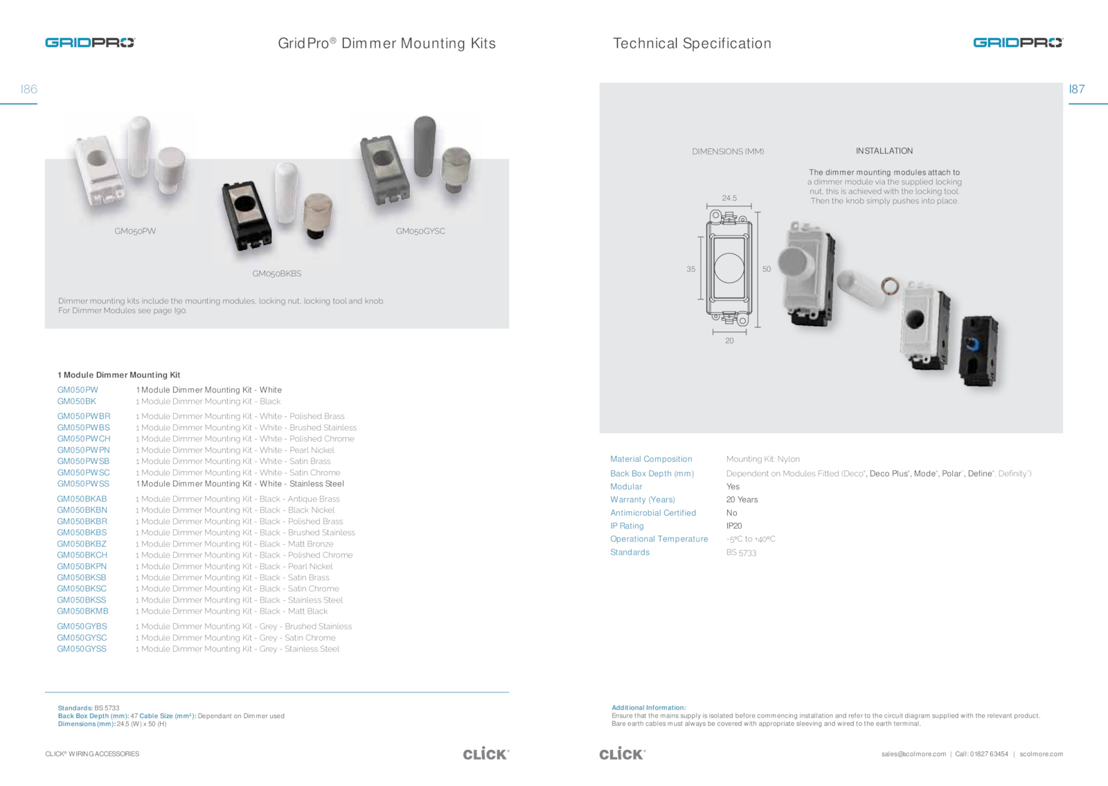 Bi̅̊̅BÔ¢ $Ni*k¢Ntk¢΄ͬiiͭ .sales@scolmore.com CLICK® WIRING ACCESSORIES I87 N̍̋ Material Composition iŜƞœƖijœħ΄_ijƖ͙΄kƼʼnŜœ Back Box Depth (mm) $ĎſĎœĈĎœƖ΄Ŝœ΄iŜĈƞʼnĎƊ΄AijƖƖĎĈ΄ͬ$ĎāŜ® , Deco Plus® , Mode® , Polarυ , Define® ͚΄$ĎĦijœijƖƼυ ͭ Modular Yes Warranty (Years) Years Antimicrobial Certified No IP Rating IP20 Operational Temperature Ͳ̊o ΄ƖŜ΄Τ̉̅o Standards ¢΄̊̌̈̈ INSTALLATION The dimmer mounting modules attach to å΄ĈijőőĎƂ΄őŜĈƞʼnĎ΄Ƶijå΄ƖĮĎ΄ƊƞſſʼnijĎĈ΄ʼnŜāņijœħ΄ œƞƖ͚΄ƖĮijƊ΄ijƊ΄åāĮijĎƵĎĈ΄ƶijƖĮ΄ƖĮĎ΄ʼnŜāņijœħ΄ƖŜŜʼn͟΄ ¯ĮĎœ΄ƖĮĎ΄ņœŜĀ΄ƊijőſʼnƼ΄ſƞƊĮĎƊ΄ijœƖŜ΄ſʼnåāĎ͟ 24. Bare earth cables must always covered with appropriate sleeving and wired the earth terminal.com Call: 01827 63454 scolmore.5 35 20 50 Technical Specification GridPro® Dimmer Mounting Kits Bi̅̊̅_¢ Bi̅̊̅Î 1 Module Dimmer Mounting Kit GM050PW Module Dimmer Mounting Kit White GM050BK ̆΄iŜĈƞʼnĎ΄$ijőőĎƂ΄iŜƞœƖijœħ΄_ijƖ΄Ͳ΄ʼnåāņ GM050PWBR ̆΄iŜĈƞʼnĎ΄$ijőőĎƂ΄iŜƞœƖijœħ΄_ijƖ΄Ͳ΄ÎĮijƖĎ΄Ͳ΄ŜʼnijƊĮĎĈ΄ƂåƊƊ GM050PWBS ̆΄iŜĈƞʼnĎ΄$ijőőĎƂ΄iŜƞœƖijœħ΄_ijƖ΄Ͳ΄ÎĮijƖĎ΄Ͳ΄ƂƞƊĮĎĈ΄¢ƖåijœʼnĎƊƊ GM050PWCH ̆΄iŜĈƞʼnĎ΄$ijőőĎƂ΄iŜƞœƖijœħ΄_ijƖ΄Ͳ΄ÎĮijƖĎ΄Ͳ΄ŜʼnijƊĮĎĈ΄ĮƂŜőĎ GM050PWPN ̆΄iŜĈƞʼnĎ΄$ijőőĎƂ΄iŜƞœƖijœħ΄_ijƖ΄Ͳ΄ÎĮijƖĎ΄Ͳ΄ĎåƂʼn΄kijāņĎʼn GM050PWSB ̆΄iŜĈƞʼnĎ΄$ijőőĎƂ΄iŜƞœƖijœħ΄_ijƖ΄Ͳ΄ÎĮijƖĎ΄Ͳ΄¢åƖijœ΄ƂåƊƊ GM050PWSC ̆΄iŜĈƞʼnĎ΄$ijőőĎƂ΄iŜƞœƖijœħ΄_ijƖ΄Ͳ΄ÎĮijƖĎ΄Ͳ΄¢åƖijœ΄ĮƂŜőĎ GM050PWSS Module Dimmer Mounting Kit White Stainless Steel Standards: 5733 Back Box Depth (mm): Cable Size (mm²): Dependant Dimmer used Dimensions (mm): 24.5 (W) (H) GM050BKAB ̆΄iŜĈƞʼnĎ΄$ijőőĎƂ΄iŜƞœƖijœħ΄_ijƖ΄Ͳ΄ʼnåāņ΄Ͳ΄œƖijƁƞĎ΄ƂåƊƊ GM050BKBN ̆΄iŜĈƞʼnĎ΄$ijőőĎƂ΄iŜƞœƖijœħ΄_ijƖ΄Ͳ΄ʼnåāņ΄Ͳ΄ʼnåāņ΄kijāņĎʼn GM050BKBR ̆΄iŜĈƞʼnĎ΄$ijőőĎƂ΄iŜƞœƖijœħ΄_ijƖ΄Ͳ΄ʼnåāņ΄Ͳ΄ŜʼnijƊĮĎĈ΄ƂåƊƊ GM050BKBS ̆΄iŜĈƞʼnĎ΄$ijőőĎƂ΄iŜƞœƖijœħ΄_ijƖ΄Ͳ΄ʼnåāņ΄Ͳ΄ƂƞƊĮĎĈ΄¢ƖåijœʼnĎƊƊ GM050BKBZ ̆΄iŜĈƞʼnĎ΄$ijőőĎƂ΄iŜƞœƖijœħ΄_ijƖ΄Ͳ΄ʼnåāņ΄Ͳ΄iåƖƖ΄ƂŜœdžĎ GM050BKCH ̆΄iŜĈƞʼnĎ΄$ijőőĎƂ΄iŜƞœƖijœħ΄_ijƖ΄Ͳ΄ʼnåāņ΄Ͳ΄ŜʼnijƊĮĎĈ΄ĮƂŜőĎ GM050BKPN ̆΄iŜĈƞʼnĎ΄$ijőőĎƂ΄iŜƞœƖijœħ΄_ijƖ΄Ͳ΄ʼnåāņ΄Ͳ΄ĎåƂʼn΄kijāņĎʼn GM050BKSB ̆΄iŜĈƞʼnĎ΄$ijőőĎƂ΄iŜƞœƖijœħ΄_ijƖ΄Ͳ΄ʼnåāņ΄Ͳ΄¢åƖijœ΄ƂåƊƊ GM050BKSC ̆΄iŜĈƞʼnĎ΄$ijőőĎƂ΄iŜƞœƖijœħ΄_ijƖ΄Ͳ΄ʼnåāņ΄Ͳ΄¢åƖijœ΄ĮƂŜőĎ GM050BKSS ̆΄iŜĈƞʼnĎ΄$ijőőĎƂ΄iŜƞœƖijœħ΄_ijƖ΄Ͳ΄ʼnåāņ΄Ͳ΄¢ƖåijœʼnĎƊƊ΄¢ƖĎĎʼn GM050BKMB ̆΄iŜĈƞʼnĎ΄$ijőőĎƂ΄iŜƞœƖijœħ΄_ijƖ΄Ͳ΄ʼnåāņ΄Ͳ΄iåƖƖ΄ʼnåāņ GM050GYBS ̆΄iŜĈƞʼnĎ΄$ijőőĎƂ΄iŜƞœƖijœħ΄_ijƖ΄Ͳ΄BƂĎƼ΄Ͳ΄ƂƞƊĮĎĈ΄¢ƖåijœʼnĎƊƊ GM050GYSC ̆΄iŜĈƞʼnĎ΄$ijőőĎƂ΄iŜƞœƖijœħ΄_ijƖ΄Ͳ΄BƂĎƼ΄Ͳ΄¢åƖijœ΄ĮƂŜőĎ GM050GYSS ̆΄iŜĈƞʼnĎ΄$ijőőĎƂ΄iŜƞœƖijœħ΄_ijƖ΄Ͳ΄BƂĎƼ΄Ͳ΄¢ƖåijœʼnĎƊƊ΄¢ƖĎĎʼn $ijőőĎƂ΄őŜƞœƖijœħ΄ņijƖƊ΄ijœāʼnƞĈĎ΄ƖĮĎ΄őŜƞœƖijœħ΄őŜĈƞʼnĎƊ͚΄ʼnŜāņijœħ΄œƞƖ͚΄ʼnŜāņijœħ΄ƖŜŜʼn΄åœĈ΄ņœŜĀ͟΄ AŜƂ΄$ijőőĎƂ΄iŜĈƞʼnĎƊ΄ƊĎĎ΄ſåħĎ΄N̎̅͟ Additional Information: Ensure that the mains supply isolated before commencing installation and refer the circuit diagram supplied with the relevant product