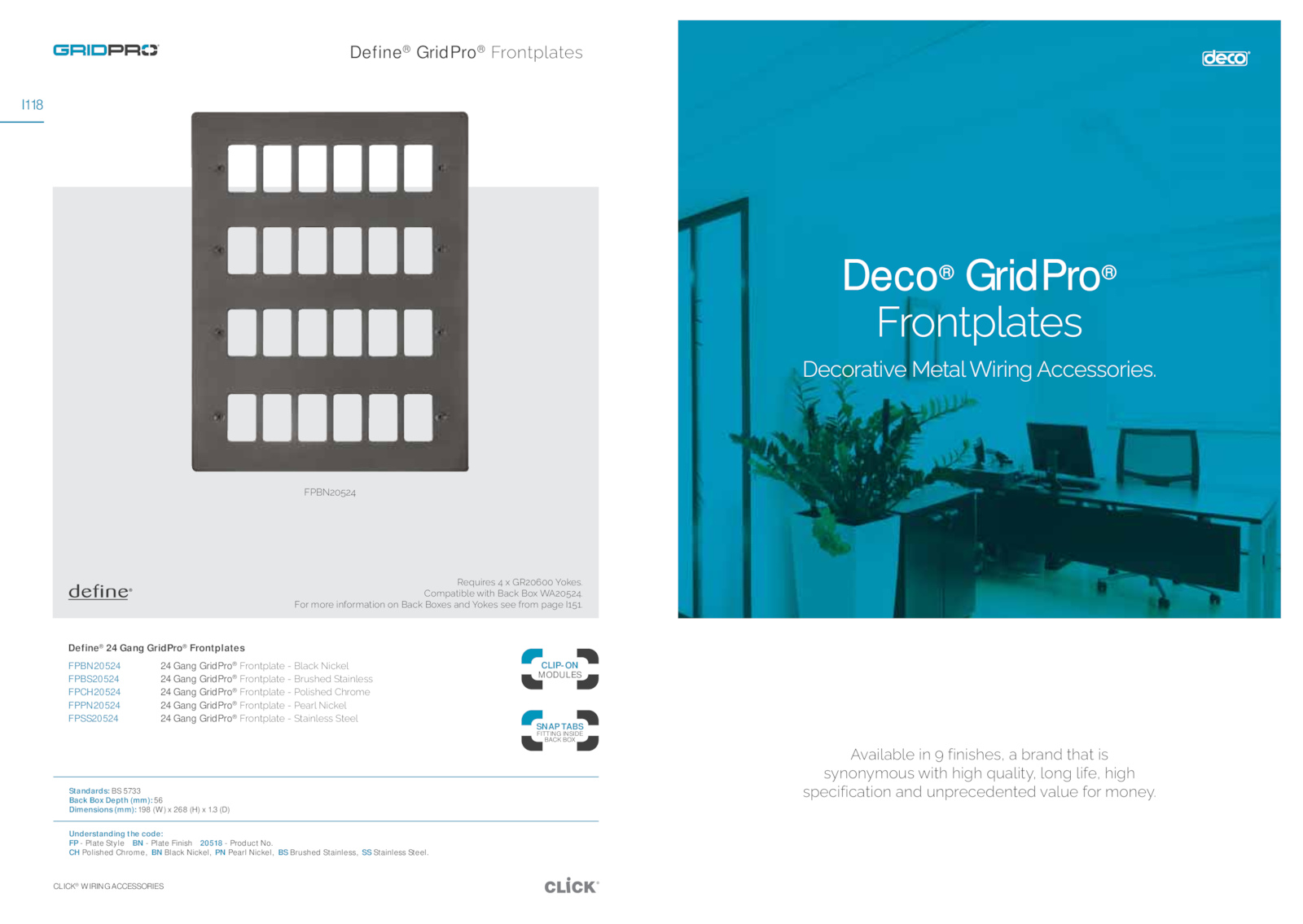 3 (D) ĎƁƞijƂĎƊ΄̉΄ƻ΄Ḃ̅̋̅̅΄ÔŜņĎƊ͟΄ ŜőſåƖijĀʼnĎ΄ƶijƖĮ΄åāņ΄Ŝƻ΄Î̇̅̊̇̉͟ AŜƂ΄őŜƂĎ΄ijœĦŜƂőåƖijŜœ΄Ŝœ΄åāņ΄ŜƻĎƊ΄åœĈ΄ÔŜņĎƊ΄ƊĎĎ΄ĦƂŜő΄ſåħĎ΄N̆̊̆͟ Define® 24 Gang GridPro® Frontplates FPBN20524 Gang GridPro® ΄AƂŜœƖſʼnåƖĎ΄Ͳ΄ʼnåāņ΄kijāņĎʼn FPBS20524 Gang GridPro® ΄AƂŜœƖſʼnåƖĎ΄Ͳ΄ƂƞƊĮĎĈ΄¢ƖåijœʼnĎƊƊ FPCH20524 Gang GridPro® ΄AƂŜœƖſʼnåƖĎ΄Ͳ΄ŜʼnijƊĮĎĈ΄ĮƂŜőĎ FPPN20524 Gang GridPro® ΄AƂŜœƖſʼnåƖĎ΄Ͳ΄ĎåƂʼn΄kijāņĎʼn FPSS20524 Gang GridPro® ΄AƂŜœƖſʼnåƖĎ΄Ͳ΄¢ƖåijœʼnĎƊƊ΄¢ƖĎĎʼn Ak̇̅̊̇̉ SNAP TABS FITTING INSIDE BACK BOX CLIP-ON MODULES Deco® GridPro® AƂŜœƖſʼnåƖĎƊ ƵåijʼnåĀʼnĎ΄ijœ΄̎΄ĦijœijƊĮĎƊ͚΄å΄ĀƂåœĈ΄ƖĮåƖ΄ijƊ΄ ƊƼœŜœƼőŜƞƊ΄ƶijƖĮ΄ĮijħĮ΄ƁƞåʼnijƖƼ͚΄ʼnŜœħ΄ʼnijĦĎ͚΄ĮijħĮ΄ ƊſĎāijĦijāåƖijŜœ΄åœĈ΄ƞœſƂĎāĎĈĎœƖĎĈ΄ƵåʼnƞĎ΄ĦŜƂ΄őŜœĎƼ͟ $ĎāŜƂåƖijƵĎ΄iĎƖåʼn΄ÎijƂijœħ΄āāĎƊƊŜƂijĎƊ͟ .I118 CLICK® WIRING ACCESSORIES Define® GridPro® ΄AƂŜœƖſʼnåƖĎƊ Understanding the code: FP Plate Style Plate Finish 20518 Product No. Standards: 5733 Back Box Depth (mm): 56 Dimensions (mm): 198 (W) 268 (H) 1. CH Polished Chrome, Black Nickel, Pearl Nickel, Brushed Stainless, Stainless Steel