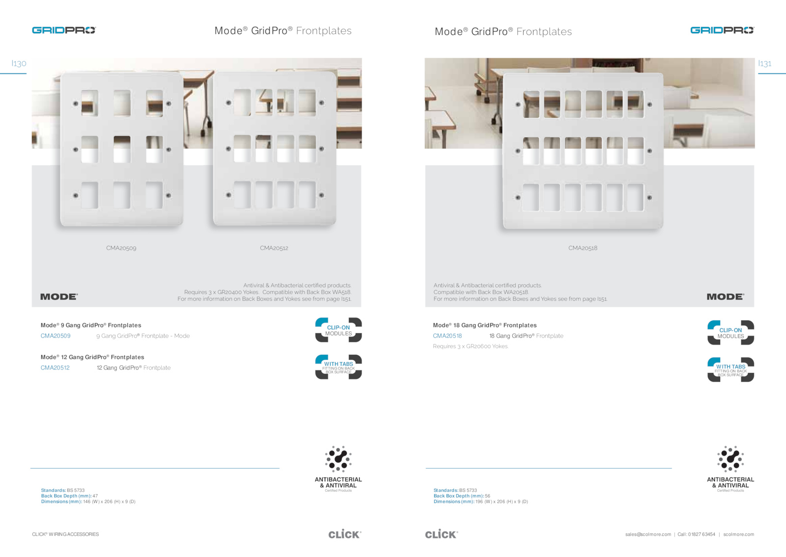 com Call: 01827 63454 scolmore.sales@scolmore.com CLICK® WIRING ACCESSORIES N̆̈̆ N̆̈̅ Mode® GridPro® ΄AƂŜœƖſʼnåƖĎƊ Mode® 18 Gang GridPro® Frontplates CMA20518 Gang GridPro® ΄AƂŜœƖſʼnåƖĎ ĎƁƞijƂĎƊ΄̈΄ƻ΄Ḃ̅̋̅̅΄ÔŜņĎƊ͟ Standards: 5733 Back Box Depth (mm): 56 Dimensions (mm): 196 (W) 206 (H) (D) œƖijƵijƂåʼn΄π΄œƖijĀåāƖĎƂijåʼn΄āĎƂƖijǙĎĈ΄ſƂŜĈƞāƖƊ͟΄ ŜőſåƖijĀʼnĎ΄ƶijƖĮ΄åāņ΄Ŝƻ΄Î̇̅̊̆̍͟ AŜƂ΄őŜƂĎ΄ijœĦŜƂőåƖijŜœ΄Ŝœ΄åāņ΄ŜƻĎƊ΄åœĈ΄ÔŜņĎƊ΄ƊĎĎ΄ĦƂŜő΄ſåħĎ΄N̆̊̆͟ i̇̅̊̆̍ CLIP-ON MODULES WITH TABS FITTING BACK BOX SURFACE Mode® GridPro® ΄AƂŜœƖſʼnåƖĎƊ i̇̅̊̅̎ i̇̅̊̆̇ Mode® 9 Gang GridPro® Frontplates CMA20509 ̎΄Båœħ΄BƂijĈƂŜ® ΄AƂŜœƖſʼnåƖĎ΄Ͳ΄iŜĈĎ Mode® 12 Gang GridPro® Frontplates CMA20512 Gang GridPro® ΄AƂŜœƖſʼnåƖĎ Standards: 5733 Back Box Depth (mm): 47 Dimensions (mm): 146 (W) 206 (H) (D) œƖijƵijƂåʼn΄π΄œƖijĀåāƖĎƂijåʼn΄āĎƂƖijǙĎĈ΄ſƂŜĈƞāƖƊ͟ ĎƁƞijƂĎƊ΄̈΄ƻ΄Ḃ̅̉̅̅΄ÔŜņĎƊ͟΄΄ŜőſåƖijĀʼnĎ΄ƶijƖĮ΄åāņ΄Ŝƻ΄Î̊̆̍͟ AŜƂ΄őŜƂĎ΄ijœĦŜƂőåƖijŜœ΄Ŝœ΄åāņ΄ŜƻĎƊ΄åœĈ΄ÔŜņĎƊ΄ƊĎĎ΄ĦƂŜő΄ſåħĎ΄N̆̊̆͟ CLIP-ON MODULES WITH TABS FITTING BACK BOX SURFACE