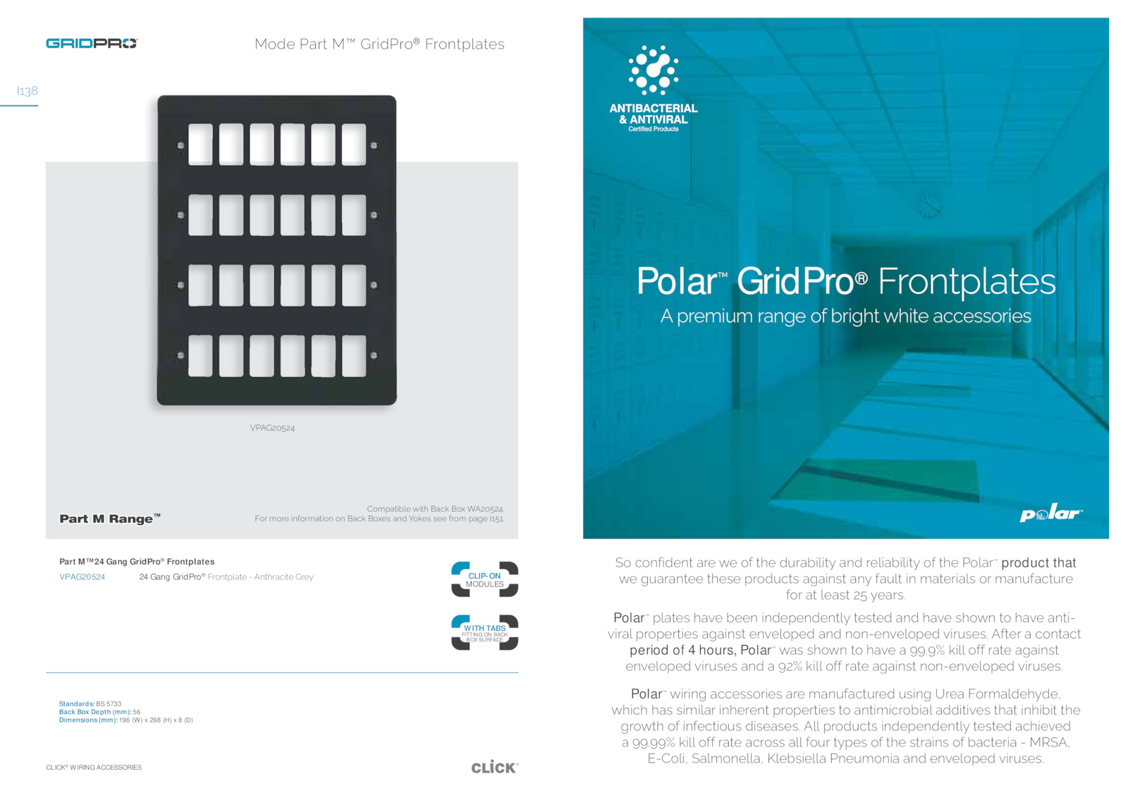 N̆̈̍ CLICK® WIRING ACCESSORIES Polarυ GridPro® ΄AƂŜœƖſʼnåƖĎƊ ¢Ŝ΄āŜœĦijĈĎœƖ΄åƂĎ΄ƶĎ΄ŜĦ΄ƖĮĎ΄ĈƞƂåĀijʼnijƖƼ΄åœĈ΄ƂĎʼnijåĀijʼnijƖƼ΄ŜĦ΄ƖĮĎ΄ŜʼnåƂυ product that ƶĎ΄ħƞåƂåœƖĎĎ΄ƖĮĎƊĎ΄ſƂŜĈƞāƖƊ΄åħåijœƊƖ΄åœƼ΄ĦåƞʼnƖ΄ijœ΄őåƖĎƂijåʼnƊ΄ŜƂ΄őåœƞĦåāƖƞƂĎ΄ ĦŜƂ΄åƖ΄ʼnĎåƊƖ΄̇̊΄ƼĎåƂƊ͟ ΄ſƂĎőijƞő΄ƂåœħĎ΄ŜĦ΄ĀƂijħĮƖ΄ƶĮijƖĎ΄åāāĎƊƊŜƂijĎƊ Polarυ ΄ƶijƂijœħ΄åāāĎƊƊŜƂijĎƊ΄åƂĎ΄őåœƞĦåāƖƞƂĎĈ΄ƞƊijœħ΄¶ƂĎå΄AŜƂőåʼnĈĎĮƼĈĎ͚΄ ƶĮijāĮ΄ĮåƊ΄ƊijőijʼnåƂ΄ijœĮĎƂĎœƖ΄ſƂŜſĎƂƖijĎƊ΄ƖŜ΄åœƖijőijāƂŜĀijåʼn΄åĈĈijƖijƵĎƊ΄ƖĮåƖ΄ijœĮijĀijƖ΄ƖĮĎ΄ ħƂŜƶƖĮ΄ŜĦ΄ijœĦĎāƖijŜƞƊ΄ĈijƊĎåƊĎƊ͟΄ʼnʼn΄ſƂŜĈƞāƖƊ΄ijœĈĎſĎœĈĎœƖʼnƼ΄ƖĎƊƖĎĈ΄åāĮijĎƵĎĈ΄ å΄̎̎̎̎͟μ΄ņijʼnʼn΄ŜĦĦ΄ƂåƖĎ΄åāƂŜƊƊ΄åʼnʼn΄ĦŜƞƂ΄ƖƼſĎƊ΄ŜĦ΄ƖĮĎ΄ƊƖƂåijœƊ΄ŜĦ΄ĀåāƖĎƂijå΄Ͳ΄i¢͚΄ *ͲŜʼnij͚΄¢åʼnőŜœĎʼnʼnå͚΄_ʼnĎĀƊijĎʼnʼnå΄œĎƞőŜœijå΄åœĈ΄ĎœƵĎʼnŜſĎĈ΄ƵijƂƞƊĎƊ͟ Polarυ ΄ſʼnåƖĎƊ΄ĮåƵĎ΄ĀĎĎœ΄ijœĈĎſĎœĈĎœƖʼnƼ΄ƖĎƊƖĎĈ΄åœĈ΄ĮåƵĎ΄ƊĮŜƶœ΄ƖŜ΄ĮåƵĎ΄åœƖijͲ ƵijƂåʼn΄ſƂŜſĎƂƖijĎƊ΄åħåijœƊƖ΄ĎœƵĎʼnŜſĎĈ΄åœĈ΄œŜœͲĎœƵĎʼnŜſĎĈ΄ƵijƂƞƊĎƊ͟΄ĦƖĎƂ΄å΄āŜœƖåāƖ΄ period hours, Polarυ ΄ƶåƊ΄ƊĮŜƶœ΄ƖŜ΄ĮåƵĎ΄å΄̎̎̎͟μ΄ņijʼnʼn΄ŜĦĦ΄ƂåƖĎ΄åħåijœƊƖ΄ ĎœƵĎʼnŜſĎĈ΄ƵijƂƞƊĎƊ΄åœĈ΄å΄̎̇μ΄ņijʼnʼn΄ŜĦĦ΄ƂåƖĎ΄åħåijœƊƖ΄œŜœͲĎœƵĎʼnŜſĎĈ΄ƵijƂƞƊĎƊ͟ iŜĈĎ΄åƂƖ΄iυ΄BƂijĈƂŜ® ΄AƂŜœƖſʼnåƖĎƊ Standards: 5733 Back Box Depth (mm): 56 Dimensions (mm): 196 (W) 268 (H) (D) ÍḂ̅̊̇̉ ŜőſåƖijĀʼnĎ΄ƶijƖĮ΄åāņ΄Ŝƻ΄Î̇̅̊̇̉͟ AŜƂ΄őŜƂĎ΄ijœĦŜƂőåƖijŜœ΄Ŝœ΄åāņ΄ŜƻĎƊ΄åœĈ΄ÔŜņĎƊ΄ƊĎĎ΄ĦƂŜő΄ſåħĎ΄N̆̊̆͟ CLIP-ON MODULES WITH TABS FITTING BACK BOX SURFACE Part Gang GridPro® Frontplates VPAG20524 Gang GridPro® ΄AƂŜœƖſʼnåƖĎ΄Ͳ΄œƖĮƂåāijƖĎ΄BƂĎƼ