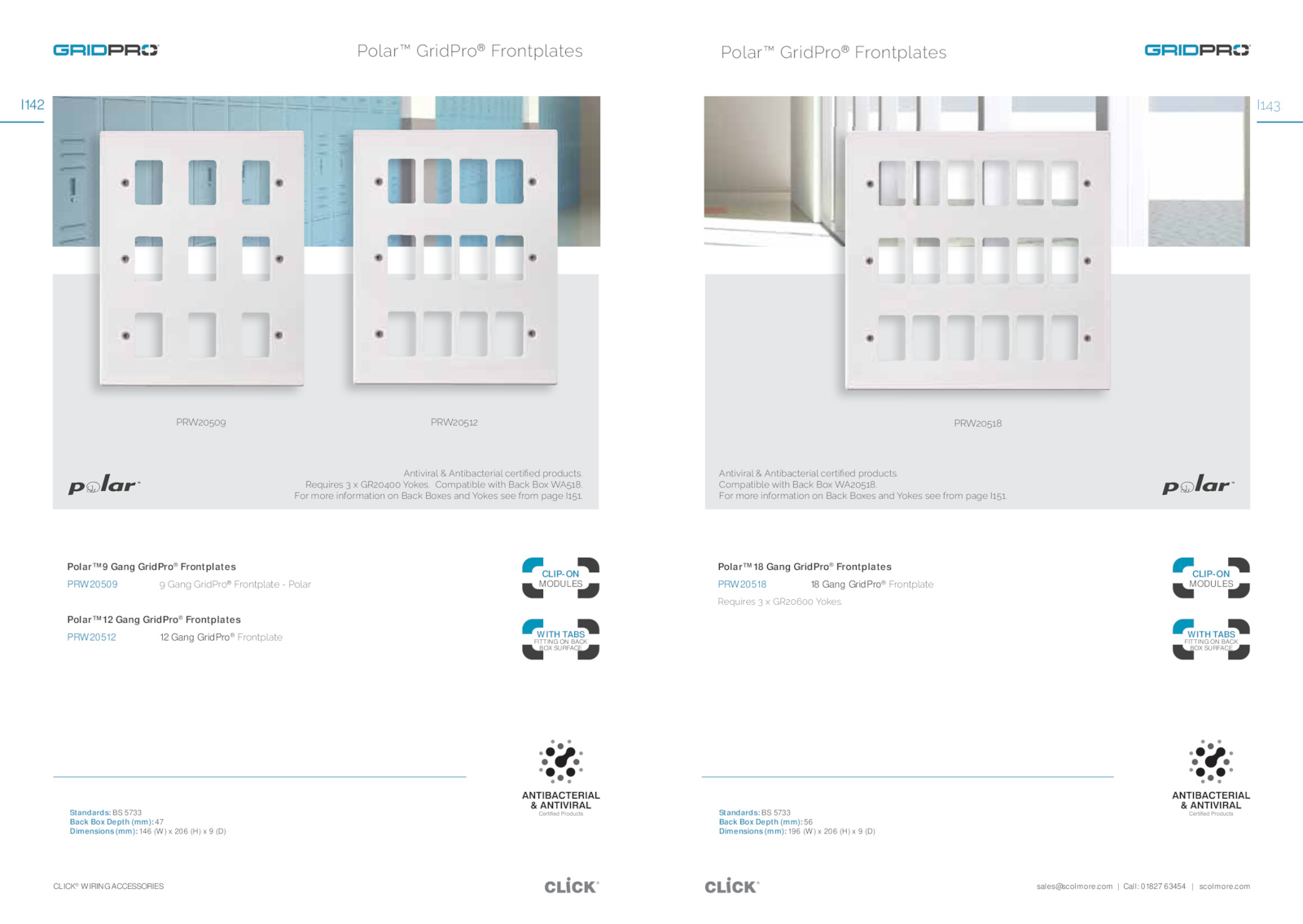 sales@scolmore.com CLICK® WIRING ACCESSORIES N̆̉̈ I142 ŜʼnåƂυ΄BƂijĈƂŜ® ΄AƂŜœƖſʼnåƖĎƊ Polar™ Gang GridPro® Frontplates PRW20518 Gang GridPro® ΄AƂŜœƖſʼnåƖĎ ĎƁƞijƂĎƊ΄̈΄ƻ΄Ḃ̅̋̅̅΄ÔŜņĎƊ͟ Standards: 5733 Back Box Depth (mm): 56 Dimensions (mm): 196 (W) 206 (H) (D) Î̇̅̊̆̍ œƖijƵijƂåʼn΄π΄œƖijĀåāƖĎƂijåʼn΄āĎƂƖijǙĎĈ΄ſƂŜĈƞāƖƊ͟ ŜőſåƖijĀʼnĎ΄ƶijƖĮ΄åāņ΄Ŝƻ΄Î̇̅̊̆̍͟ AŜƂ΄őŜƂĎ΄ijœĦŜƂőåƖijŜœ΄Ŝœ΄åāņ΄ŜƻĎƊ΄åœĈ΄ÔŜņĎƊ΄ƊĎĎ΄ĦƂŜő΄ſåħĎ΄N̆̊̆͟ CLIP-ON MODULES WITH TABS FITTING BACK BOX SURFACE ŜʼnåƂυ΄BƂijĈƂŜ® ΄AƂŜœƖſʼnåƖĎƊ Î̇̅̊̅̎ Î̇̅̊̆̇ Polar™ Gang GridPro® Frontplates PRW20509 ̎΄Båœħ΄BƂijĈƂŜ® ΄AƂŜœƖſʼnåƖĎ΄Ͳ΄ŜʼnåƂ Polar™ Gang GridPro® Frontplates PRW20512 Gang GridPro® ΄AƂŜœƖſʼnåƖĎ Standards: 5733 Back Box Depth (mm): 47 Dimensions (mm): 146 (W) 206 (H) (D) œƖijƵijƂåʼn΄π΄œƖijĀåāƖĎƂijåʼn΄āĎƂƖijǙĎĈ΄ſƂŜĈƞāƖƊ͟ ĎƁƞijƂĎƊ΄̈΄ƻ΄Ḃ̅̉̅̅΄ÔŜņĎƊ͟΄΄ŜőſåƖijĀʼnĎ΄ƶijƖĮ΄åāņ΄Ŝƻ΄Î̊̆̍͟ AŜƂ΄őŜƂĎ΄ijœĦŜƂőåƖijŜœ΄Ŝœ΄åāņ΄ŜƻĎƊ΄åœĈ΄ÔŜņĎƊ΄ƊĎĎ΄ĦƂŜő΄ſåħĎ΄N̆̊̆͟ CLIP-ON MODULES WITH TABS FITTING BACK BOX SURFACE .com Call: 01827 63454 scolmore