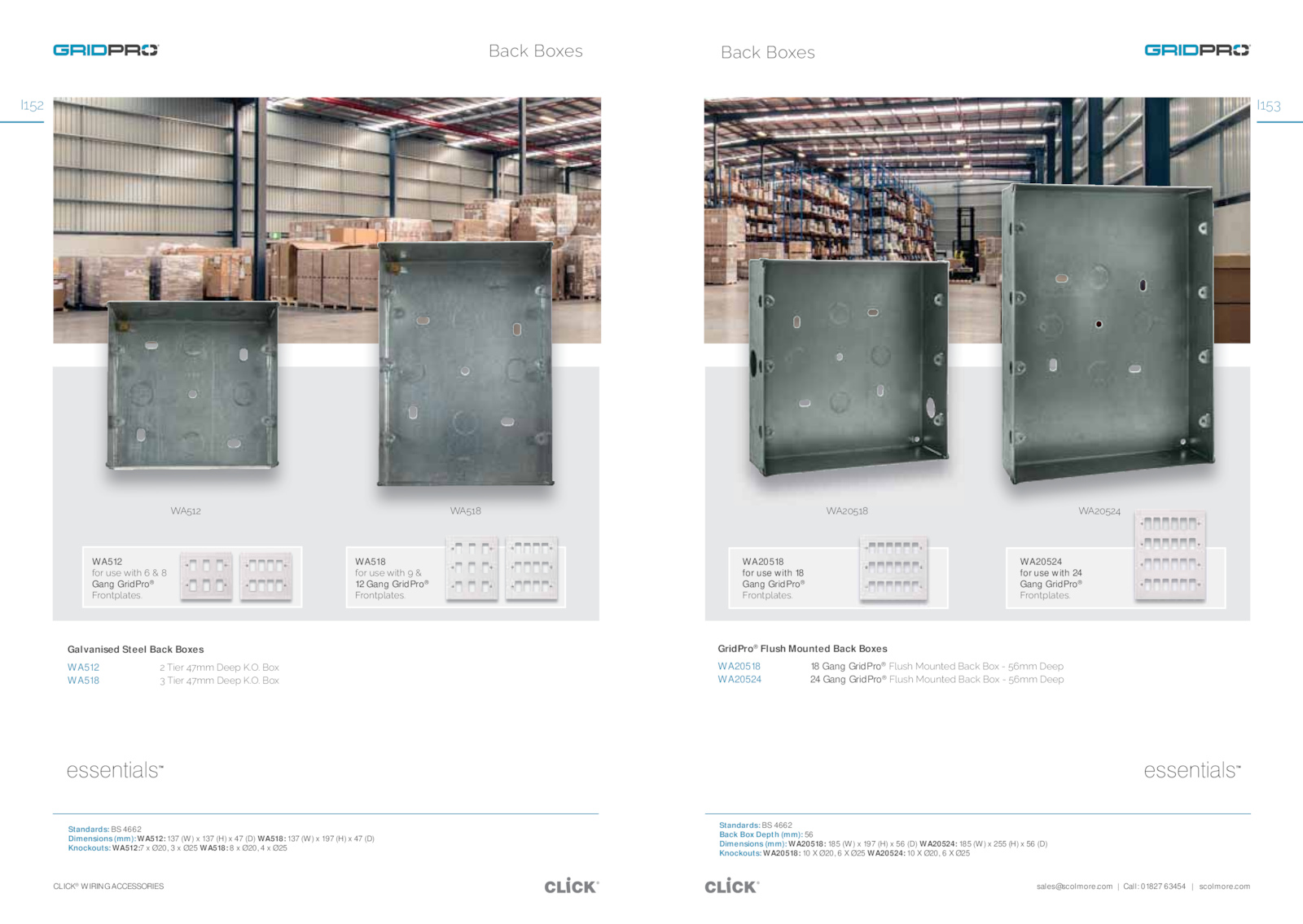 com Call: 01827 63454 scolmore.sales@scolmore.com CLICK® WIRING ACCESSORIES N̆̊̈ N̆̊̇ åāņ΄ŜƻĎƊ Î̇̅̊̆̍ Î̇̅̊̇̉ GridPro® Flush Mounted Back Boxes WA20518 Gang GridPro® ΄AʼnƞƊĮ΄iŜƞœƖĎĈ΄åāņ΄Ŝƻ΄Ͳ΄̊̋őő΄$ĎĎſ WA20524 Gang GridPro® ΄AʼnƞƊĮ΄iŜƞœƖĎĈ΄åāņ΄Ŝƻ΄Ͳ΄̊̋őő΄$ĎĎſ WA20518 for use with 18 Gang GridPro® AƂŜœƖſʼnåƖĎƊ͟ WA20524 for use with 24 Gang GridPro® AƂŜœƖſʼnåƖĎƊ͟ Standards: 4662 Back Box Depth (mm): 56 Dimensions (mm): WA20518: 185 (W) 197 (H) (D) WA20524: 185 (W) 255 (H) (D) Knockouts: WA20518: Ø20, Ø25 WA20524: Ø20, Ø25 åāņ΄ŜƻĎƊ Galvanised Steel Back Boxes WA512 ̇΄¯ijĎƂ΄̉̌őő΄$ĎĎſ΄_͟t͟΄Ŝƻ WA518 ̈΄¯ijĎƂ΄̉̌őő΄$ĎĎſ΄_͟t͟΄Ŝƻ Î̊̆̇ Î̊̆̍ WA512 ĦŜƂ΄ƞƊĎ΄ƶijƖĮ΄̋΄π΄̍΄ Gang GridPro® AƂŜœƖſʼnåƖĎƊ͟ WA518 ĦŜƂ΄ƞƊĎ΄ƶijƖĮ΄̎΄π΄ 12 Gang GridPro® AƂŜœƖſʼnåƖĎƊ͟ Standards: 4662 Dimensions (mm): WA512: 137 (W) 137 (H) (D) WA518: 137 (W) 197 (H) (D) Knockouts: WA512:7 Ø20, Ø25 WA518: Ø20, Ø25
