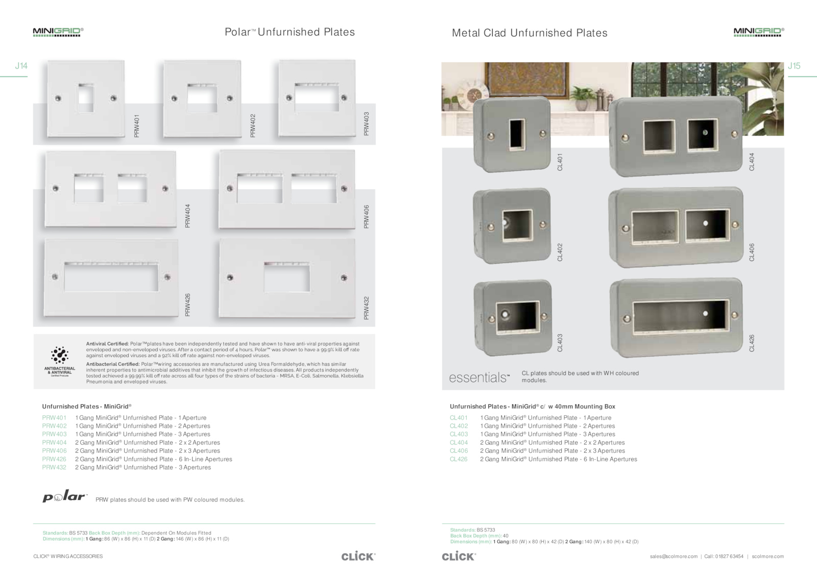 sales@scolmore. œƖijƵijƂåʼn΄ĎƂƖijǙĎĈ͙ Polar™ plates have been independently tested and have shown have anti-viral properties against ĎœƵĎʼnŜſĎĈ΄åœĈ΄œŜœͲĎœƵĎʼnŜſĎĈ΄ƵijƂƞƊĎƊ͟΄ĦƖĎƂ΄å΄āŜœƖåāƖ΄ſĎƂijŜĈ΄ŜĦ΄̉΄ĮŜƞƂƊ͚΄ŜʼnåƂυ΄ƶåƊ΄ƊĮŜƶœ΄ƖŜ΄ĮåƵĎ΄å΄̎̎̎͟μ΄ņijʼnʼn΄Ŝǖ΄ƂåƖĎ΄ åħåijœƊƖ΄ĎœƵĎʼnŜſĎĈ΄ƵijƂƞƊĎƊ΄åœĈ΄å΄̎̇μ΄ņijʼnʼn΄Ŝǖ΄ƂåƖĎ΄åħåijœƊƖ΄œŜœͲĎœƵĎʼnŜſĎĈ΄ƵijƂƞƊĎƊ͟ œƖijĀåāƖĎƂijåʼn΄ĎƂƖijǙĎĈ͙ Polar™ wiring accessories are manufactured using Urea Formaldehyde, which has similar inherent properties antimicrobial additives that inhibit the growth infectious diseases. . CL plates should used with coloured modules.com Call: 01827 63454 scolmore.com CLICK® WIRING ACCESSORIES J15 J14 Metal Clad Unfurnished Plates Unfurnished Plates MiniGrid® c/w 40mm Mounting Box CL401 Gang MiniGrid® Unfurnished Plate Aperture CL402 Gang MiniGrid® Unfurnished Plate Apertures CL403 Gang MiniGrid® Unfurnished Plate Apertures CL404 Gang MiniGrid® Unfurnished Plate Apertures CL406 Gang MiniGrid® Unfurnished Plate Apertures CL426 Gang MiniGrid® Unfurnished Plate In-Line Apertures Polar™ Unfurnished Plates Unfurnished Plates MiniGrid® PRW401 Gang MiniGrid® Unfurnished Plate Aperture PRW402 Gang MiniGrid® Unfurnished Plate Apertures PRW403 Gang MiniGrid® Unfurnished Plate Apertures PRW404 Gang MiniGrid® Unfurnished Plate Apertures PRW406 Gang MiniGrid® Unfurnished Plate Apertures PRW426 Gang MiniGrid® Unfurnished Plate In-Line Apertures PRW432 Gang MiniGrid® Unfurnished Plate Apertures Standards: 5733 Back Box Depth (mm): 40 Dimensions (mm): Gang: (W) (H) (D) Gang: 140 (W) (H) (D) Standards: 5733 Back Box Depth (mm): Dependent Modules Fitted Dimensions (mm): Gang: (W) (H) (D) Gang: 146 (W) (H) (D) CL401 CL402 CL404 CL406 CL426 CL403 PRW401 PRW402 PRW404 PRW406 PRW426 PRW432 PRW403 PRW plates should used with coloured modules. All products independently ƖĎƊƖĎĈ΄åāĮijĎƵĎĈ΄å΄̎̎̎̎͟μ΄ņijʼnʼn΄Ŝǖ΄ƂåƖĎ΄åāƂŜƊƊ΄åʼnʼn΄ĦŜƞƂ΄ƖƼſĎƊ΄ŜĦ΄ƖĮĎ΄ƊƖƂåijœƊ΄ŜĦ΄ĀåāƖĎƂijå΄Ͳ΄i¢͚΄*ͲŜʼnij͚΄¢åʼnőŜœĎʼnʼnå͚΄_ʼnĎĀƊijĎʼnʼnå΄ Pneumonia and enveloped viruses