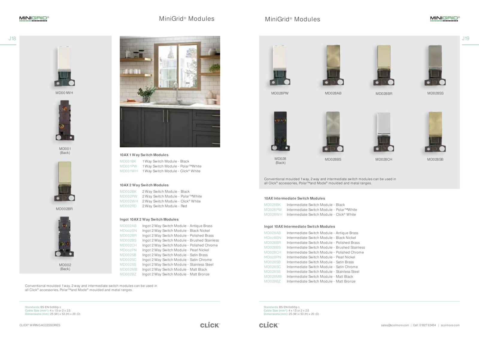 Standards͙΄¢΄*k΄̋̅̋̋̎Ͳ̆ Cable Size (mm²): 1. MD028PW MD028BR MD028CH MD028AB MD028SS MD028SB MD028BS MD028 (Back) Standards͙΄¢΄*k΄̋̅̋̋̎Ͳ̆ Cable Size (mm²): 1.5 Dimensions (mm): (W) (H) (D) 10AX Way Switch Modules MD002BK Way Switch Module Black MD002PW Way Switch Module Polar™ White MD002WH Way Switch Module Click® White MD002RD Way Switch Module Red .sales@scolmore.5 Dimensions (mm): (W) (H) (D) MD001WH MD002BR MD001 (Back) MD002 (Back) MiniGrid® Modules Conventional moulded way, way and intermediate switch modules can used in all Click® accessories, Polar™ and Mode® moulded and metal ranges.com Call: 01827 63454 scolmore.5 2.com CLICK® WIRING ACCESSORIES J19 J18 MiniGrid® Modules 10AX Way Switch Modules MD001BK Way Switch Module Black MD001PW Way Switch Module Polar™ White MD001WH Way Switch Module Click® White 10AX Intermediate Switch Modules MD028BK Intermediate Switch Module Black MD028PW Intermediate Switch Module Polar™ White MD028WH Intermediate Switch Module Click® White Ingot 10AX Way Switch Modules MD002AB Ingot Way Switch Module Antique Brass i$̅̅̇k Ingot Way Switch Module Black Nickel MD002BR Ingot Way Switch Module Polished Brass MD002BS Ingot Way Switch Module Brushed Stainless MD002CH Ingot Way Switch Module Polished Chrome i$̅̅̇k Ingot Way Switch Module Pearl Nickel MD002SB Ingot Way Switch Module Satin Brass MD002SC Ingot Way Switch Module Satin Chrome MD002SS Ingot Way Switch Module Stainless Steel MD002MB Ingot Way Switch Module Matt Black MD002BZ Ingot Way Switch Module Matt Bronze Ingot 10AX Intermediate Switch Modules MD028AB Intermediate Switch Module Antique Brass i$̅̇̍k Intermediate Switch Module Black Nickel MD028BR Intermediate Switch Module Polished Brass MD028BS Intermediate Switch Module Brushed Stainless MD028CH Intermediate Switch Module Polished Chrome i$̅̇̍k Intermediate Switch Module Pearl Nickel MD028SB Intermediate Switch Module Satin Brass MD028SC Intermediate Switch Module Satin Chrome MD028SS Intermediate Switch Module Stainless Steel MD028MB Intermediate Switch Module Matt Black MD028BZ Intermediate Switch Module Matt Bronze Conventional moulded way, way and intermediate switch modules can used in all Click® accessories, Polar™ and Mode® moulded and metal ranges.5 2