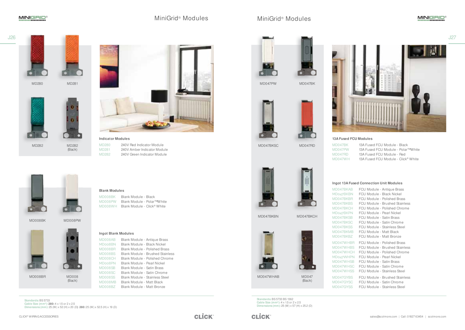 com Call: 01827 63454 scolmore.com CLICK® WIRING ACCESSORIES J27 J26 MiniGrid® Modules MiniGrid® Modules 13A Fused FCU Modules MD047BK 13A Fused FCU Module Black MD047PW 13A Fused FCU Module Polar™ White MD047RD 13A Fused FCU Module Red MD047WH 13A Fused FCU Module Click® White Ingot 13A Fused Connection Unit Modules MD047BKAB FCU Module Antique Brass i$̅̉̌_k FCU Module Black Nickel MD047BKBR FCU Module Polished Brass MD047BKBS FCU Module Brushed Stainless MD047BKCH FCU Module Polished Chrome i$̅̉̌_k FCU Module Pearl Nickel MD047BKSB FCU Module Satin Brass MD047BKSC FCU Module Satin Chrome MD047BKSS FCU Module Stainless Steel MD047BKMB FCU Module Matt Black MD047BKBZ FCU Module Matt Bronze Ingot Blank Modules MD008AB Blank Module Antique Brass i$̅̅̍k Blank Module Black Nickel MD008BR Blank Module Polished Brass MD008BS Blank Module Brushed Stainless MD008CH Blank Module Polished Chrome i$̅̅̍k Blank Module Pearl Nickel MD008SB Blank Module Satin Brass MD008SC Blank Module Satin Chrome MD008SS Blank Module Stainless Steel MD008MB Blank Module Matt Black MD008BZ Blank Module Matt Bronze Blank Modules MD008BK Blank Module Black MD008PW Blank Module Polar™ White MD008WH Blank Module Click® White Standards: 5733 1362 Cable Size (mm²): 1.2 (D) Standards: 5733 Cable Size (mm²): 280: 1.sales@scolmore.5 Dimensions (mm): (W) (H) (D) 280: (W) 52.5 (H) (D) MD047BKSC MD047PW MD047RD MD047BK MD047WHAB MD047BKBN MD047BKCH MD008BK MD008PW MD008BR MD008 (Back) MD047WHBR FCU Module Polished Brass MD047WHBS FCU Module Brushed Stainless MD047WHCH FCU Module Polished Chrome i$̅̉̌ÎIk FCU Module Pearl Nickel MD047WHSB FCU Module Satin Brass MD047WHSC FCU Module Satin Chrome MD047WHSS FCU Module Stainless Steel MD047GYBS FCU Module Brushed Stainless MD047GYSC FCU Module Satin Chrome MD047GYSS FCU Module Stainless Steel Indicator Modules MD280 240V Red Indicator Module MD281 240V Amber Indicator Module MD282 240V Green Indicator Module MD280 MD281 MD282 MD282 (Back) MD047 (Back) .5 Dimensions (mm): (W) (H) 25.5 2.5 2