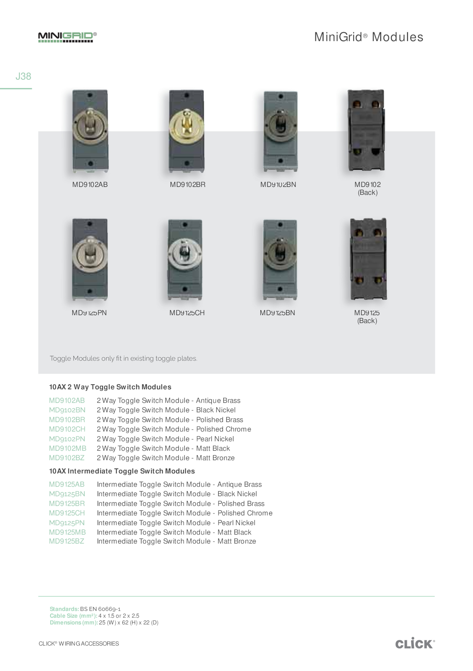 CLICK® WIRING ACCESSORIES J38 Standards:΄¢΄*k΄̋̅̋̋̎Ͳ̆ Cable Size (mm²): 1.5 Dimensions (mm): (W) (H) (D) ¯ŜħħʼnĎ΄iŜĈƞʼnĎƊ΄ŜœʼnƼ΄ǙƖ΄ijœ΄ĎƻijƊƖijœħ΄ƖŜħħʼnĎ΄ſʼnåƖĎƊ͟ 10AX Way Toggle Switch Modules MD9102AB Way Toggle Switch Module Antique Brass i$̎̆̅̇k Way Toggle Switch Module Black Nickel MD9102BR Way Toggle Switch Module Polished Brass MD9102CH Way Toggle Switch Module Polished Chrome i$̎̆̅̇k Way Toggle Switch Module Pearl Nickel MD9102MB Way Toggle Switch Module Matt Black MD9102BZ Way Toggle Switch Module Matt Bronze 10AX Intermediate Toggle Switch Modules MD9125AB Intermediate Toggle Switch Module Antique Brass i$̎̆̇̊k Intermediate Toggle Switch Module Black Nickel MD9125BR Intermediate Toggle Switch Module Polished Brass MD9125CH Intermediate Toggle Switch Module Polished Chrome i$̎̆̇̊k Intermediate Toggle Switch Module Pearl Nickel MD9125MB Intermediate Toggle Switch Module Matt Black MD9125BZ Intermediate Toggle Switch Module Matt Bronze MD9102AB MD9102BR MD9102BN MD9102 (Back) MD9102AB BN MD9102BR MD9125PN MD9125CH MD9125BN MD9125 (Back) MD BN MD MD MiniGrid® Modules .5 2