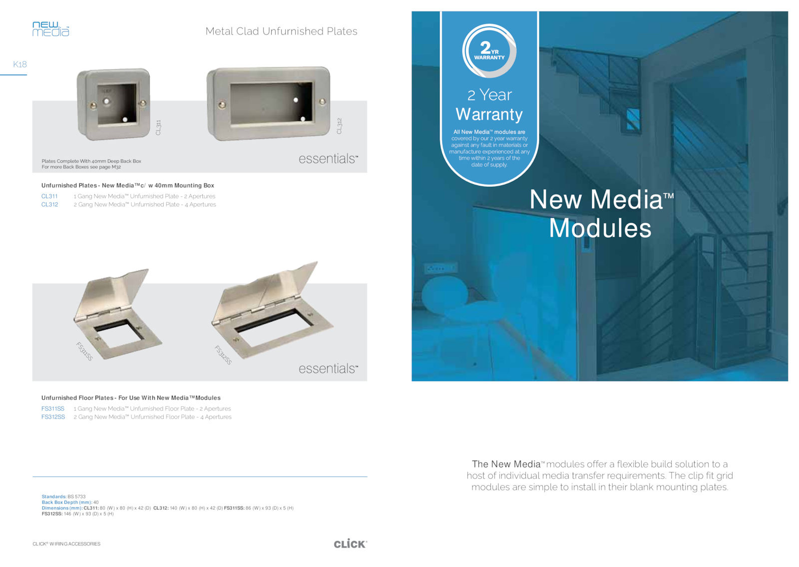 CLICK® WIRING ACCESSORIES _̆̍ iĎƖåʼn΄ʼnåĈ΄¶œĦƞƂœijƊĮĎĈ΄ʼnåƖĎƊ Unfurnished Plates New Media™ c/w 40mm Mounting Box CL311 ̆΄Båœħ΄kĎƶ΄iĎĈijåυ΄¶œĦƞƂœijƊĮĎĈ΄ʼnåƖĎ΄Ͳ΄̇΄ſĎƂƖƞƂĎƊ CL312 ̇΄Båœħ΄kĎƶ΄iĎĈijåυ΄¶œĦƞƂœijƊĮĎĈ΄ʼnåƖĎ΄Ͳ΄̉΄ſĎƂƖƞƂĎƊ Unfurnished Floor Plates For Use With New Media™ Modules FS311SS ̆΄Båœħ΄kĎƶ΄iĎĈijåυ΄¶œĦƞƂœijƊĮĎĈ΄AʼnŜŜƂ΄ʼnåƖĎ΄Ͳ΄̇΄ſĎƂƖƞƂĎƊ FS312SS ̇΄Båœħ΄kĎƶ΄iĎĈijåυ΄¶œĦƞƂœijƊĮĎĈ΄AʼnŜŜƂ΄ʼnåƖĎ΄Ͳ΄̉΄ſĎƂƖƞƂĎƊ Standards: 5733 Back Box Depth (mm): 40 Dimensions (mm): CL311: (W) (H) (D) CL312: 140 (W) (H) (D) FS311SS: (W) (D) (H) FS312SS: 146 (W) (D) (H) ä̆̆ A ¢ ̈ ̆ ̆ ¢ ¢ ä̆̇ A ¢ ̈ ̆ ̇ ¢ ¢ The New Media™ ΄őŜĈƞʼnĎƊ΄ŜĦĦĎƂ΄å΄ĦʼnĎƻijĀʼnĎ΄ĀƞijʼnĈ΄ƊŜʼnƞƖijŜœ΄ƖŜ΄å΄ ĮŜƊƖ΄ŜĦ΄ijœĈijƵijĈƞåʼn΄őĎĈijå΄ƖƂåœƊĦĎƂ΄ƂĎƁƞijƂĎőĎœƖƊ͟΄¯ĮĎ΄āʼnijſ΄ĦijƖ΄ħƂijĈ΄ őŜĈƞʼnĎƊ΄åƂĎ΄ƊijőſʼnĎ΄ƖŜ΄ijœƊƖåʼnʼn΄ijœ΄ƖĮĎijƂ΄Āʼnåœņ΄őŜƞœƖijœħ΄ſʼnåƖĎƊ͟ New Media™ Modules ʼnåƖĎƊ΄ŜőſʼnĎƖĎ΄ÎijƖĮ΄̉̅őő΄$ĎĎſ΄åāņ΄Ŝƻ΄ AŜƂ΄őŜƂĎ΄åāņ΄ŜƻĎƊ΄ƊĎĎ΄ſåħĎ΄ï̇ 2YR WARRANTY ̇΄ÔĎåƂ΄ Warranty All New MediaTM modules are āŜƵĎƂĎĈ΄ĀƼ΄ŜƞƂ΄̇΄ƼĎåƂ΄ƶåƂƂåœƖƼ΄ åħåijœƊƖ΄åœƼ΄ĦåƞʼnƖ΄ijœ΄őåƖĎƂijåʼnƊ΄ŜƂ΄ őåœƞĦåāƖƞƂĎ΄ĎƻſĎƂijĎœāĎĈ΄åƖ΄åœƼ΄ ƖijőĎ΄ƶijƖĮijœ΄̇΄ƼĎåƂƊ΄ŜĦ΄ƖĮĎ΄ ĈåƖĎ΄ŜĦ΄ƊƞſſʼnƼ͟