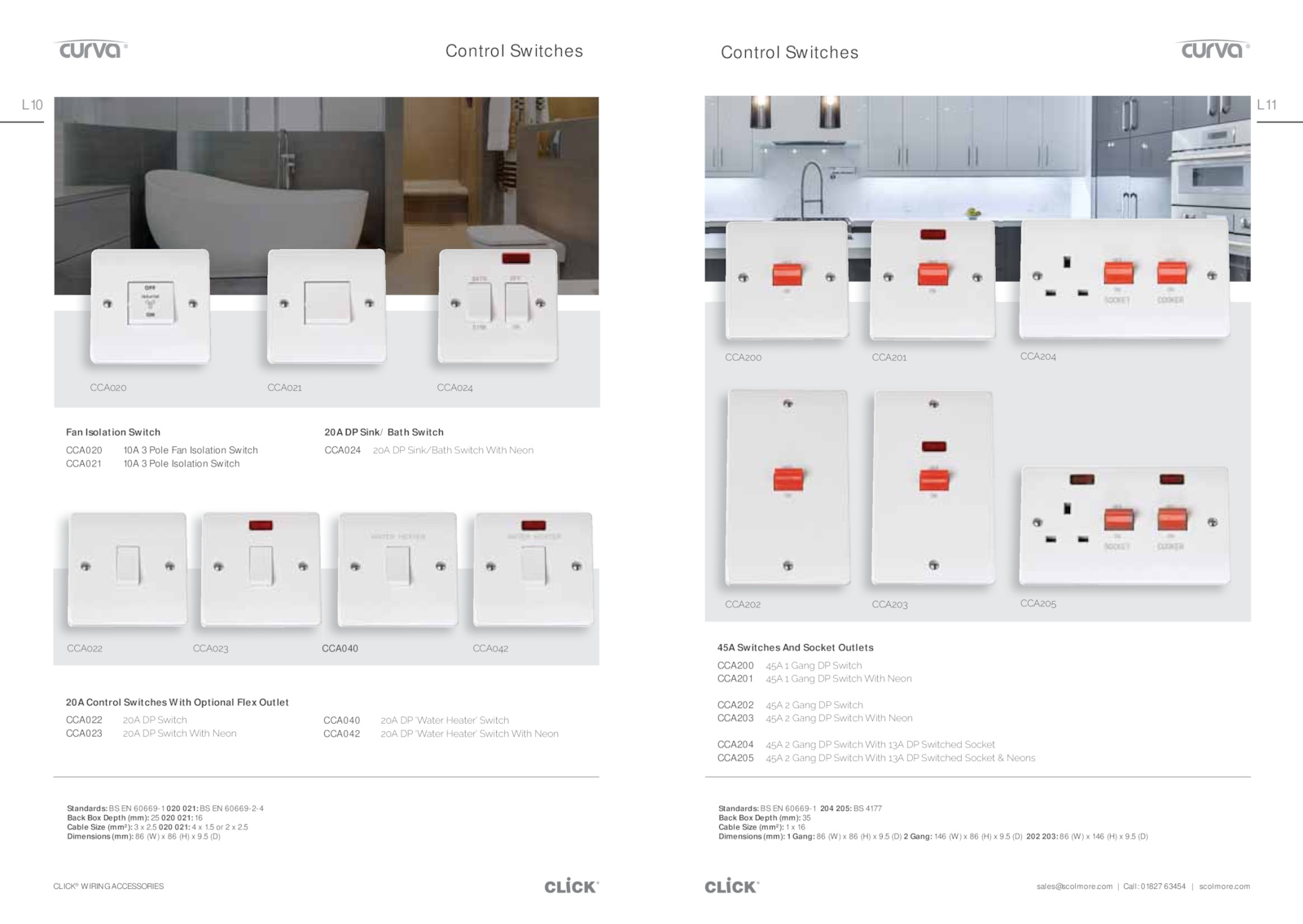 com CLICK® WIRING ACCESSORIES L11 L10 Control Switches 45A Switches And Socket Outlets CCA200 ̉̊΄̆΄Båœħ΄$΄¢ƶijƖāĮ CCA201 ̉̊΄̆΄Båœħ΄$΄¢ƶijƖāĮ΄ÎijƖĮ΄kĎŜœ CCA202 ̉̊΄̇΄Båœħ΄$΄¢ƶijƖāĮ CCA203 ̉̊΄̇΄Båœħ΄$΄¢ƶijƖāĮ΄ÎijƖĮ΄kĎŜœ CCA204 ̉̊΄̇΄Båœħ΄$΄¢ƶijƖāĮ΄ÎijƖĮ΄̆̈΄$΄¢ƶijƖāĮĎĈ΄¢ŜāņĎƖ CCA205 ̉̊΄̇΄Båœħ΄$΄¢ƶijƖāĮ΄ÎijƖĮ΄̆̈΄$΄¢ƶijƖāĮĎĈ΄¢ŜāņĎƖ΄π΄kĎŜœƊ Control Switches 20A Sink/Bath Switch CCA024 ̇̅΄$΄¢ijœņͥåƖĮ΄¢ƶijƖāĮ΄ÎijƖĮ΄kĎŜœ 20A Control Switches With Optional Flex Outlet CCA022 ̇̅΄$΄¢ƶijƖāĮ CCA023 ̇̅΄$΄¢ƶijƖāĮ΄ÎijƖĮ΄kĎŜœ Standards: 60669-1 204 205: 4177 Back Box Depth (mm): 35 Cable Size (mm²): 16 Dimensions (mm): Gang: (W) (H) 9.5 2.sales@scolmore.5 (D) 202 203: (W) 146 (H) 9.com Call: 01827 63454 scolmore.5 (D) Gang: 146 (W) (H) 9.5 Dimensions (mm): (W) (H) 9.5 (D) ̅̇̅ ̅̇̈ CCA040 ̅̇̆ ̅̇̇ ̅̇̉ ̅̉̇ ̇̅̅ ̇̅̉ ̇̅̆ ̇̅̇ ̇̅̊ ̇̅̈ Fan Isolation Switch CCA020 10A Pole Fan Isolation Switch CCA021 10A Pole Isolation Switch CCA040 ̇̅΄$΄ͼÎåƖĎƂ΄IĎåƖĎƂͽ΄¢ƶijƖāĮ CCA042 ̇̅΄$΄ͼÎåƖĎƂ΄IĎåƖĎƂͽ΄¢ƶijƖāĮ΄ÎijƖĮ΄kĎŜœ .5 (D) Standards: 60669-1 020 021: 60669-2-4 Back Box Depth (mm): 020 021: 16 Cable Size (mm²): 2.5 020 021: 1