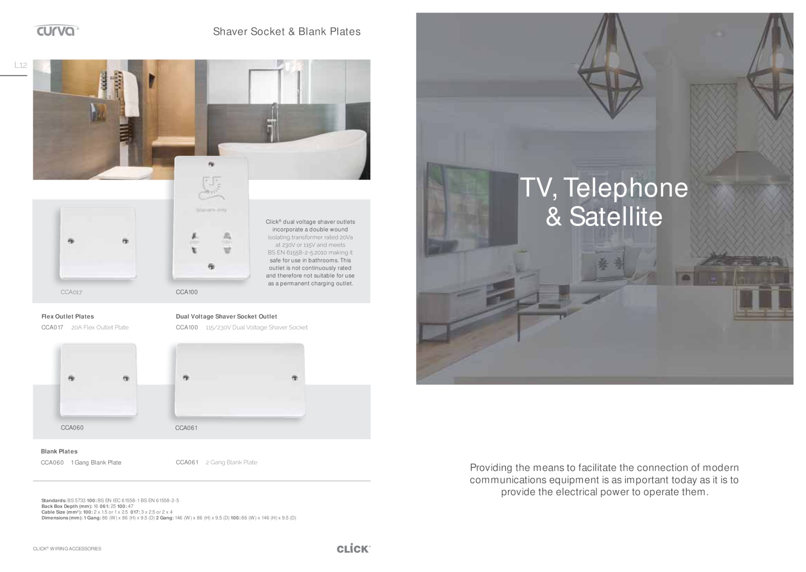 CCA061 ̇΄Båœħ΄ʼnåœņ΄ʼnåƖĎ .5 4 Dimensions (mm): Gang: (W) (H) 9.5 2.5 017: 2. TV, Telephone & Satellite Flex Outlet Plates CCA017 ̇̅΄AʼnĎƻ΄tƞƖʼnĎƖ΄ʼnåƖĎ Click® dual voltage shaver outlets incorporate double wound ijƊŜʼnåƖijœħ΄ƖƂåœƊĦŜƂőĎƂ΄ƂåƖĎĈ΄̇̅Íå΄ åƖ΄̇̈̅Í΄ŜƂ΄̆̆̊Í΄åœĈ΄őĎĎƖƊ΄ ¢΄*k΄̋̆̊̊̍Ͳ̇Ͳ͙̊̇̅̆̅΄őåņijœħ΄ijƖ΄ safe for use bathrooms.5 (D) CCA060 CCA100 ̅̆̌ CCA061 Providing the means facilitate the connection modern communications equipment important today to provide the electrical power operate them.5 (D) Gang: 146 (W) (H) 9.CLICK® WIRING ACCESSORIES ă̇ Shaver Socket Blank Plates Blank Plates CCA060 Gang Blank Plate Dual Voltage Shaver Socket Outlet CCA100 ̆̆̊ͥ̇̈̅Í΄$ƞåʼn΄ÍŜʼnƖåħĎ΄¢ĮåƵĎƂ΄¢ŜāņĎƖ Standards: 5733 100: IEC 61558-1 61558-2-5 Back Box Depth (mm): 061: 100: 47 Cable Size (mm²): 100: 1. This outlet not continuously rated and therefore not suitable for use as permanent charging outlet.5 (D) 100: (W) 146 (H) 9