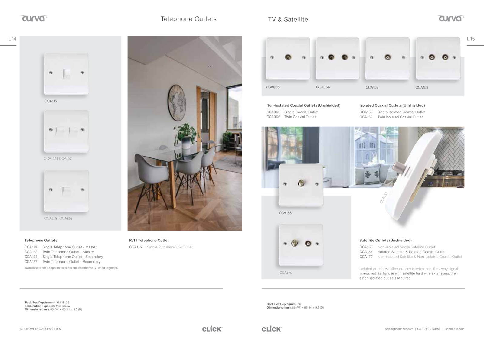 com CLICK® WIRING ACCESSORIES L15 L14 TV Satellite Isolated Coaxial Outlets (Unshielded) CCA158 Single Isolated Coaxial Outlet CCA159 Twin Isolated Coaxial Outlet Satellite Outlets (Unshielded) CCA156 kŜœͲijƊŜʼnåƖĎĈ΄¢ijœħʼnĎ΄¢åƖĎʼnʼnijƖĎ΄tƞƖʼnĎƖ CCA157 Isolated Satellite Isolated Coaxial Outlet CCA170 kŜœͲijƊŜʼnåƖĎĈ΄¢åƖĎʼnʼnijƖĎ΄π΄kŜœͲijƊŜʼnåƖĎĈ΄Ŝåƻijåʼn΄tƞƖʼnĎƖ Telephone Outlets RJ11 Telephone Outlet CCA115 ¢ijœħʼnĎ΄]̆̆΄ͬNƂijƊĮͥ¶¢ͭ΄tƞƖʼnĎƖ Back Box Depth (mm): 16 Dimensions (mm): (W) (H) 9. for use with satellite hard wire extensions, then a non-isolated outlet required.e. .5 (D) Back Box Depth (mm): 115: 35 Termination Type: IDC 115: Screw Dimensions (mm): (W) (H) 9. Non-isolated Coaxial Outlets (Unshielded) CCA065 Single Coaxial Outlet CCA066 Twin Coaxial Outlet Telephone Outlets CCA119 Single Telephone Outlet Master CCA122 Twin Telephone Outlet Master CCA124 Single Telephone Outlet Secondary CCA127 Twin Telephone Outlet Secondary Twin outlets are separate sockets and not internally linked together.5 (D) CCA066 CCA065 ̆̌̅ CCA159 CCA158 ̆ ̊ ̌ CCA156 CCA115 ̆̆̎΄χ΄̆̇̉ ̆̇̇΄χ΄̆̇̌ ̆̆̎ ̆̇̉ ̆̇̇ ̆̇̌ CCA115 NƊŜʼnåƖĎĈ΄ŜƞƖʼnĎƖƊ΄ƶijʼnʼn΄ǙʼnƖĎƂ΄ŜƞƖ΄åœƼ΄ijœƖĎƂĦĎƂĎœāĎ͚΄ijĦ΄å΄̇΄ƶåƼ΄Ɗijħœåʼn΄ is required, i.com Call: 01827 63454 scolmore.sales@scolmore