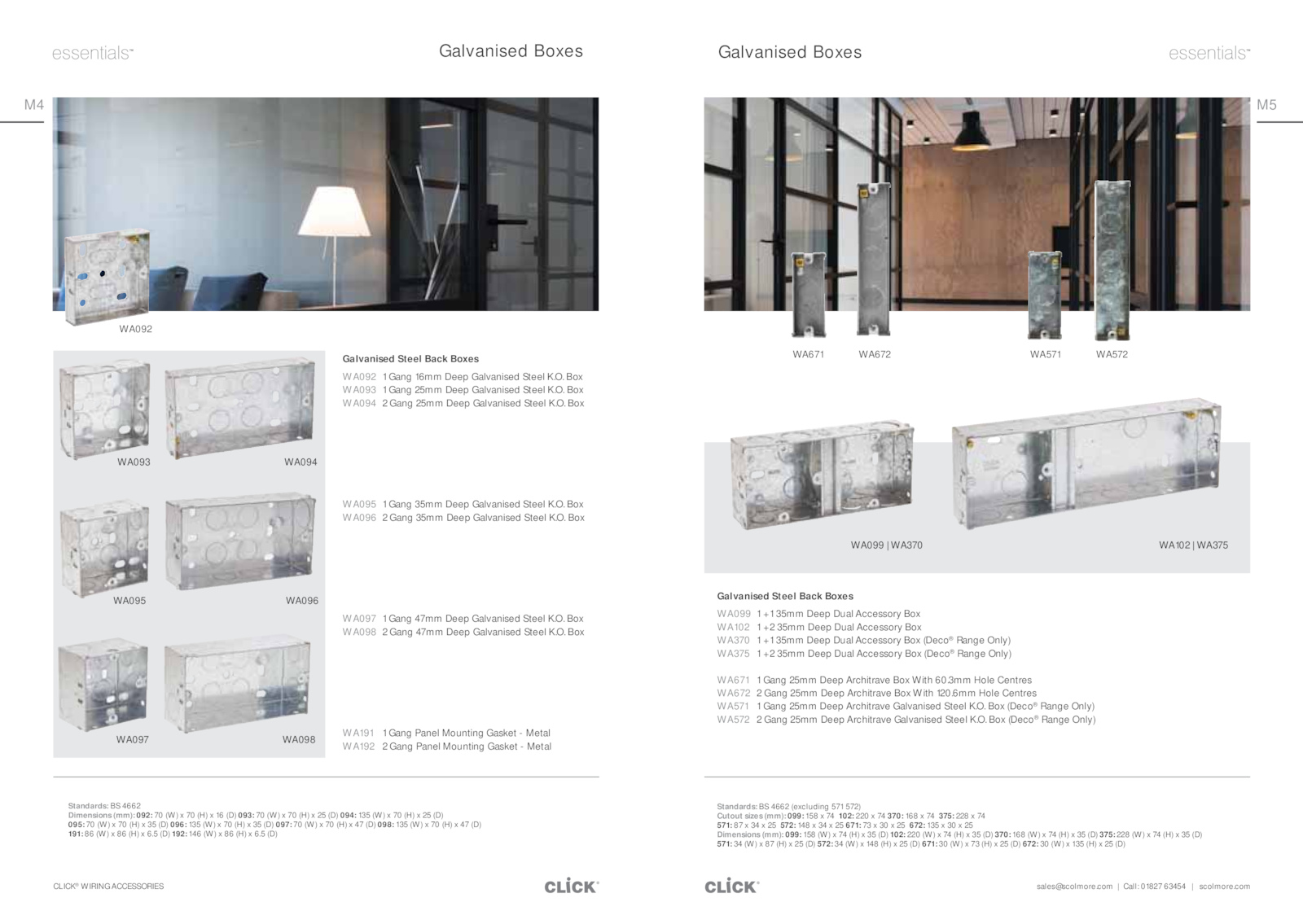 6mm Hole Centres WA571 Gang 25mm Deep Architrave Galvanised Steel K.com CLICK® WIRING ACCESSORIES M5 M4 Galvanised Boxes Galvanised Steel Back Boxes WA092 Gang 16mm Deep Galvanised Steel K. Box WA093 Gang 25mm Deep Galvanised Steel K.O.O. Box (Deco® Range Only) Galvanised Boxes WA093 WA096 WA097 WA098 WA099 WA370 WA102 WA375 Standards: 4662 (excluding 571 572) Cutout sizes (mm): 099: 158 102: 220 370: 168 375: 228 74 571: 572: 148 671: 672: 135 25 Dimensions (mm): 099: 158 (W) (H) (D) 102: 220 (W) (H) (D) 370: 168 (W) (H) (D) 375: 228 (W) (H) (D) 571: (W) (H) (D) 572: (W) 148 (H) (D) 671: (W) (H) (D) 672: (W) 135 (H) (D) WA671 WA672 WA095 WA094 WA571 WA572 .O.O. Box WA097 Gang 47mm Deep Galvanised Steel K.O.5 (D) 192: 146 (W) (H) 6. Box WA098 Gang 47mm Deep Galvanised Steel K. Box WA096 Gang 35mm Deep Galvanised Steel K.com Call: 01827 63454 scolmore.O. Box WA095 Gang 35mm Deep Galvanised Steel K.O.O. Box WA191 Gang Panel Mounting Gasket Metal WA192 Gang Panel Mounting Gasket Metal Standards: 4662 Dimensions (mm): 092: (W) (H) (D) 093: (W) (H) (D) 094: 135 (W) (H) (D) 095: (W) (H) (D) 096: 135 (W) (H) (D) 097: (W) (H) (D) 098: 135 (W) (H) (D) 191: (W) (H) 6.O.sales@scolmore. Box (Deco® Range Only) WA572 Gang 25mm Deep Architrave Galvanised Steel K.3mm Hole Centres WA672 Gang 25mm Deep Architrave Box With 120. Box WA094 Gang 25mm Deep Galvanised Steel K.5 (D) WA092 Galvanised Steel Back Boxes WA099 35mm Deep Dual Accessory Box WA102 35mm Deep Dual Accessory Box WA370 35mm Deep Dual Accessory Box (Deco® Range Only) WA375 35mm Deep Dual Accessory Box (Deco® Range Only) WA671 Gang 25mm Deep Architrave Box With 60
